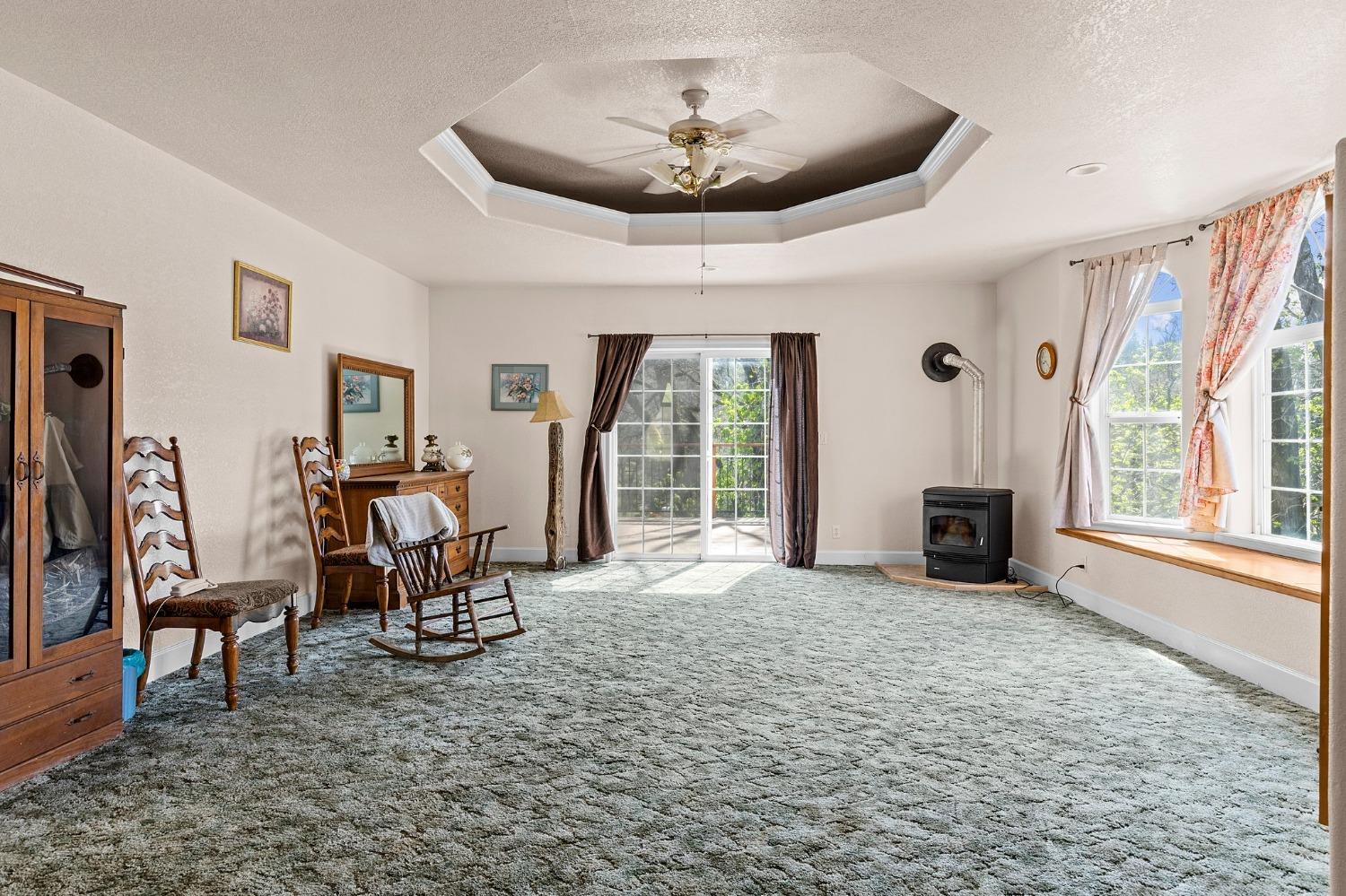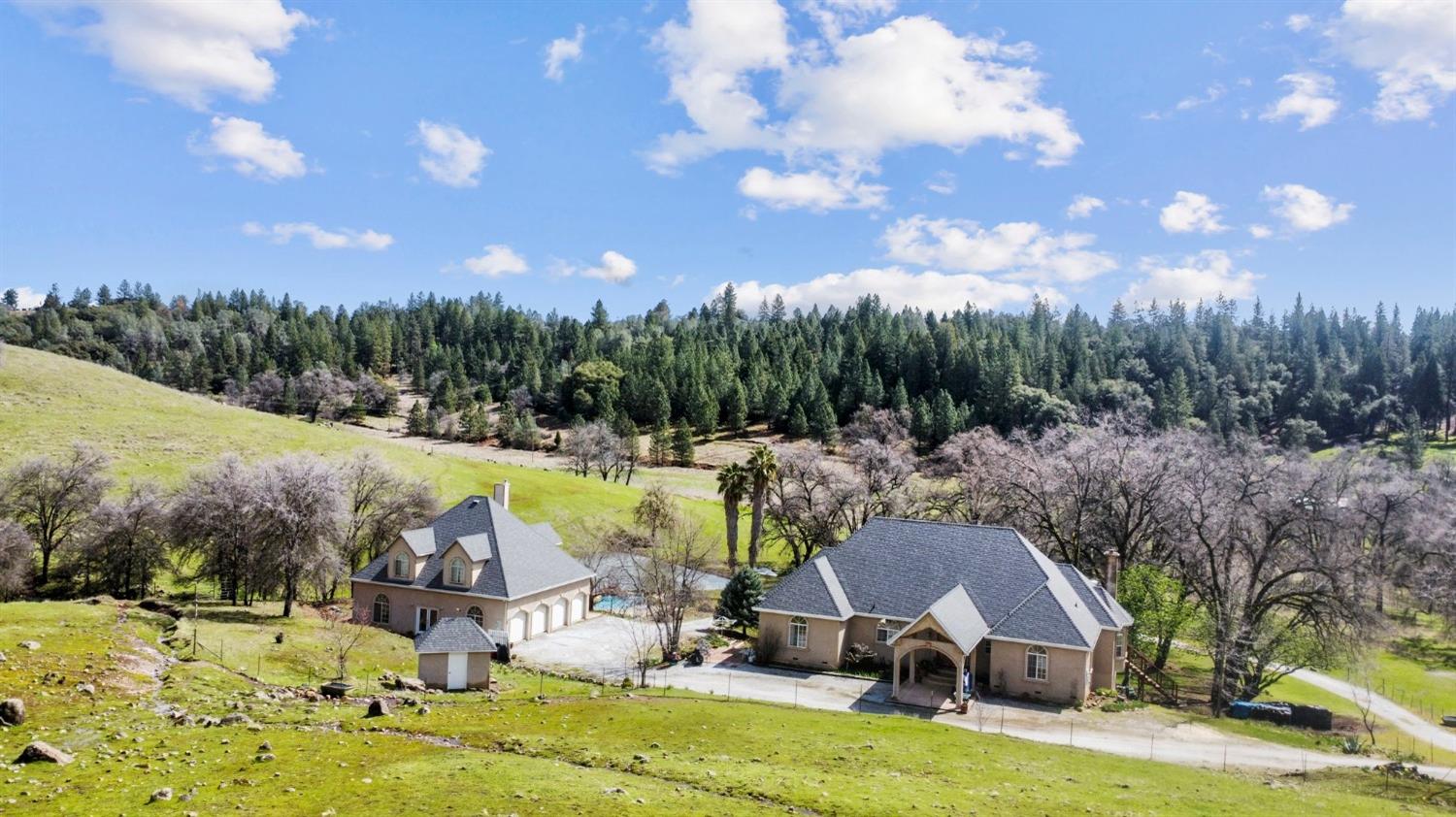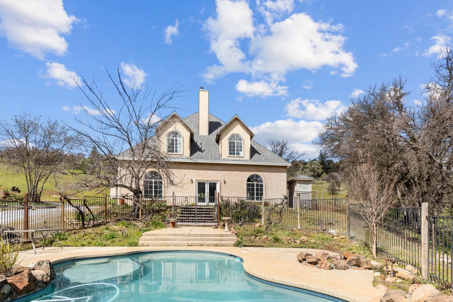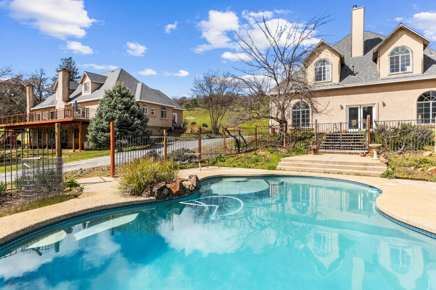 Stunning 40-Acre Estate Retreat - Discover peace and privacy on this breathtaking 40-acre estate featuring serene rolling hills, a seasonal stream, and a tranquil pond. This custom-built 3,803 sq ft home offers 3 bedrooms, 2 full baths, and 2 half baths, designed for both comfort and entertaining. The spacious living room, complete with a wood-burning fireplace, opens to an expansive deck with sweeping valley views. The chefs kitchen boasts a large island with 36 propane cooktop and a walk-in pantry, while the oversized laundry room provides abundant storage. The main-level primary suite features a luxurious bath with dual walk-in closets, a stone-surround shower, and a jetted soaking tub. The lower level hosts a large entertainment room with a built-in bar, half bath, and pool table. Above the 4 car garage, an 800 sq ft 1-bedroom, 1-bath apartment offers space for guests or extended family. Outdoor living shines with a fenced in-ground pool and rock waterfall. Recent updates include a new roof on the home and garage, rebuilt rear deck, and a central vacuum system. Just minutes from downtown Volcano and 30 minutes to award wining wineries.