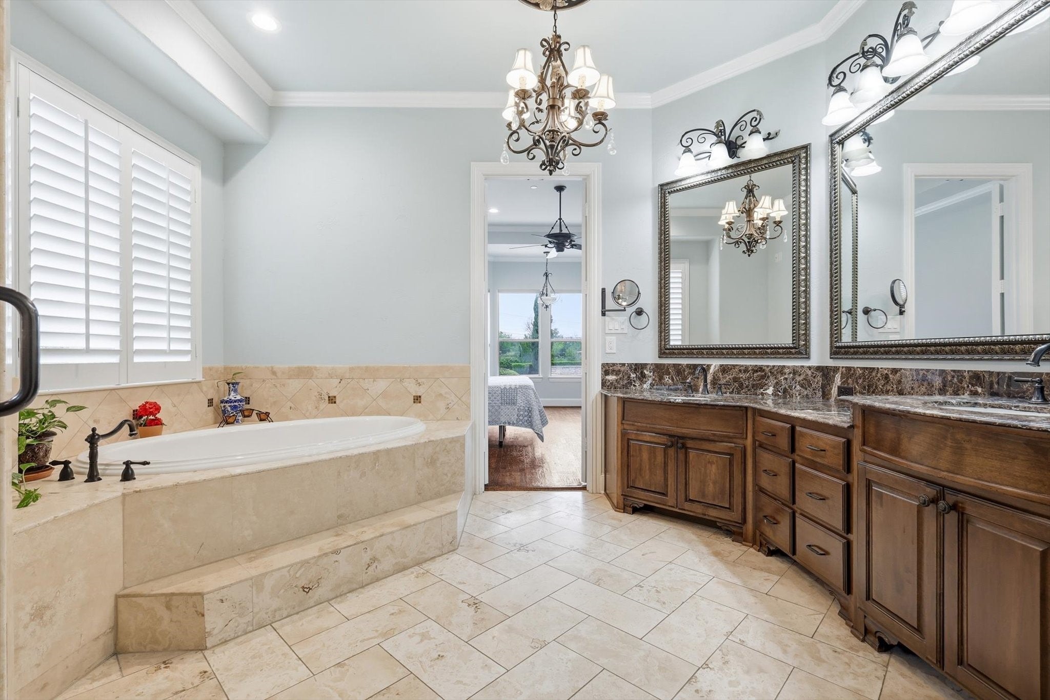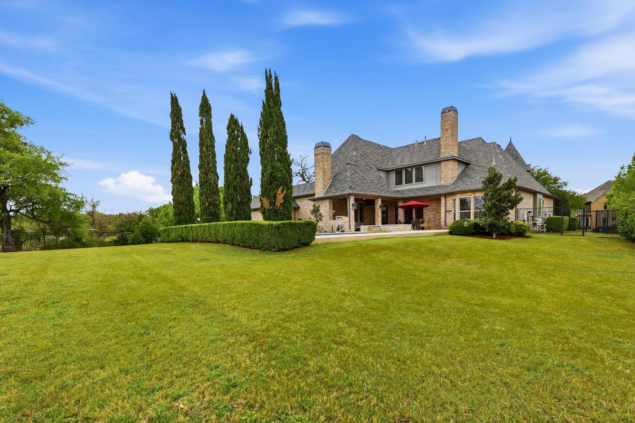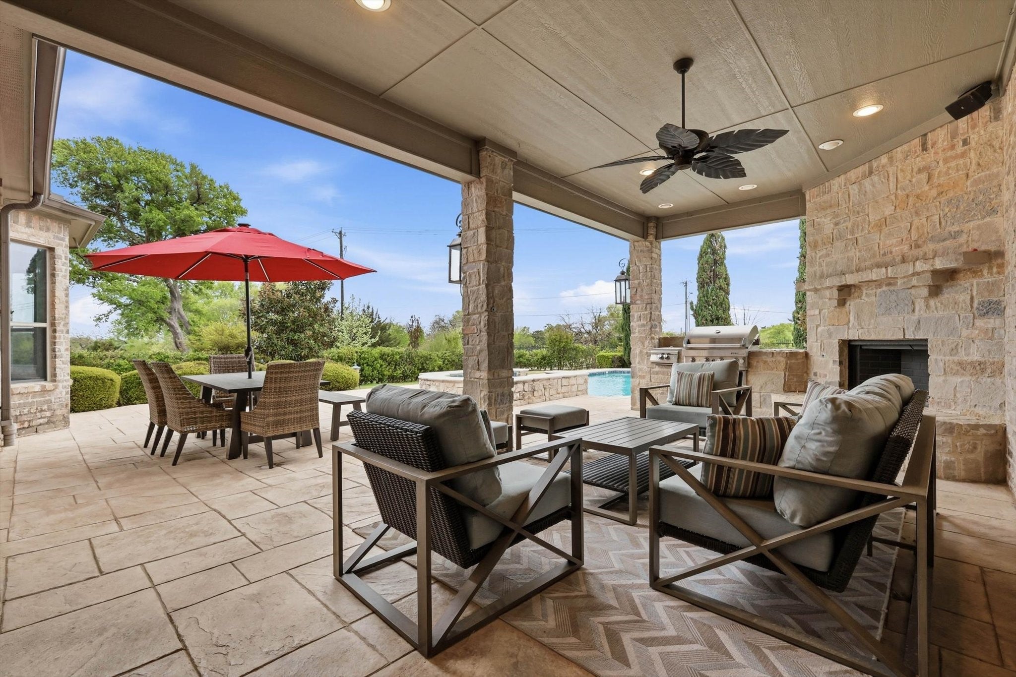 A rare golf course estate set on a coveted .622-acre lot in one of Garlands most desirable enclaves. Offering 4,613 square feet of thoughtfully updated living space, this exceptional home features 5 bedrooms, 4 bathrooms, and a 3-car garage (2-car plus separate 1-car), blending elegance, comfort, and functionality.Rich hardwood floors and custom lighting create a warm and inviting atmosphere from the moment you enter. The gourmet kitchen is designed for both everyday living and entertaining, showcasing a Wolf 6-burner range with griddle and dual fuel oven, Sub-Zero refrigerator, granite countertops, designer backsplash, and custom cabinetry with built-ins and dedicated wine storage.The spacious family room features a striking stone fireplace and seamless indoor-outdoor flow, opening to a backyard designed for year-round enjoyment. The private primary suite offers a relaxing retreat, while all secondary bedrooms are generously sized with walk-in closets and updated bathrooms featuring frameless glass showers. The outdoor living space truly sets this home apart, featuring a resort-style diving pool and spa, oversized covered patio with built-in grill and fireplace, mature landscaping, iron fencing, and a dedicated dog run. A greenbelt backdrop enhances privacy and extends the sense of space beyond the property.This is a rare opportunity to own a beautifully updated golf course property offering luxury, space, and an exceptional lifestyle. Multiple offers Received.