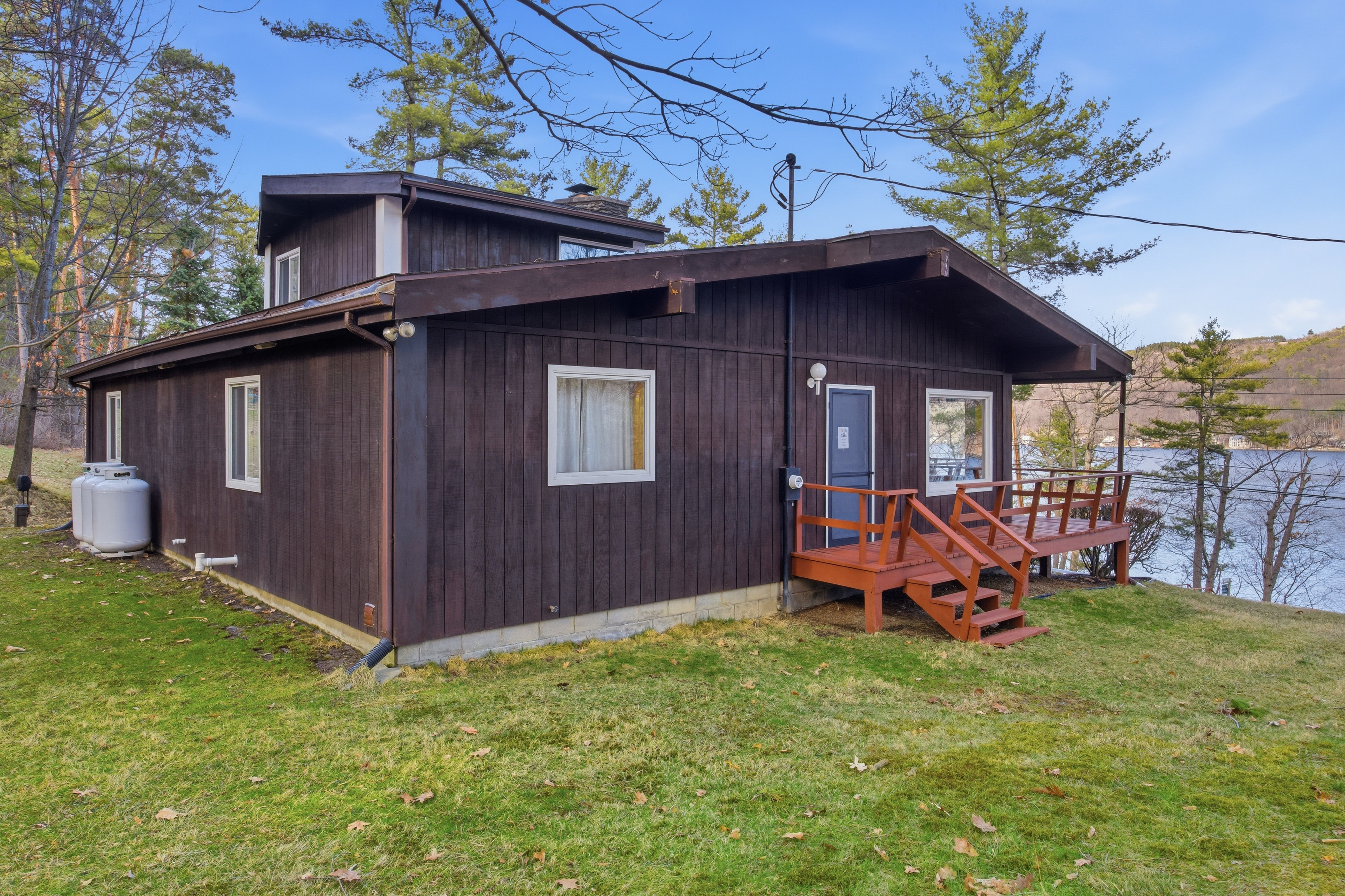 Keuka Lake-Year-round 3 bedroom, 2 bath home, privately situated on 3.8 acres and with 140 ft of lake frontage. This very well maintained 1977 constructed home has a full basement/garage, which is very suitable to finish, should someone wish more than the 2100sq. ft. of space that exists on the upper levels.