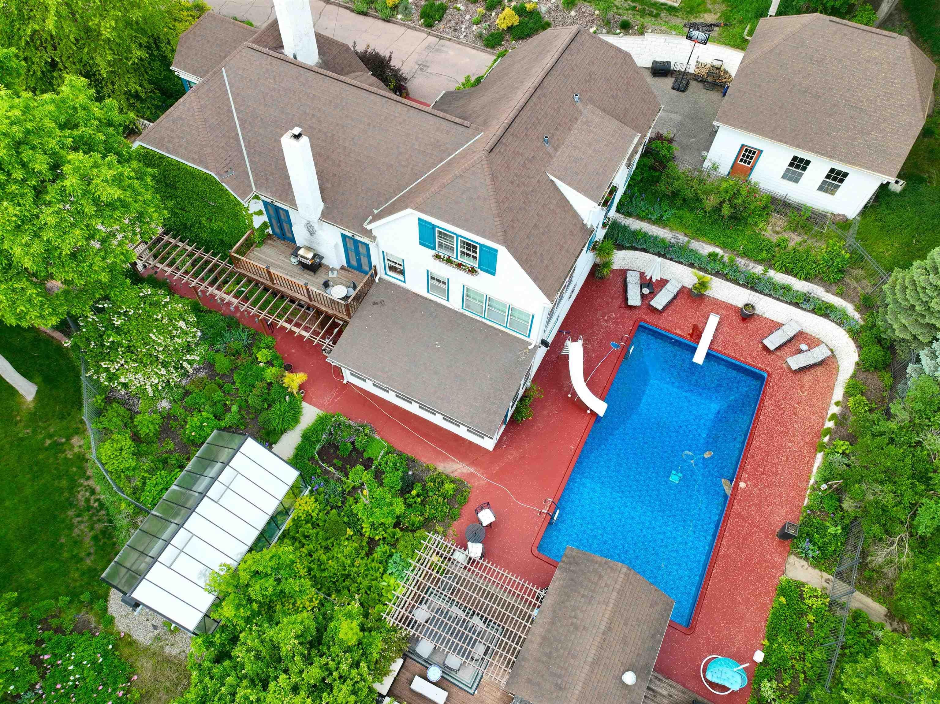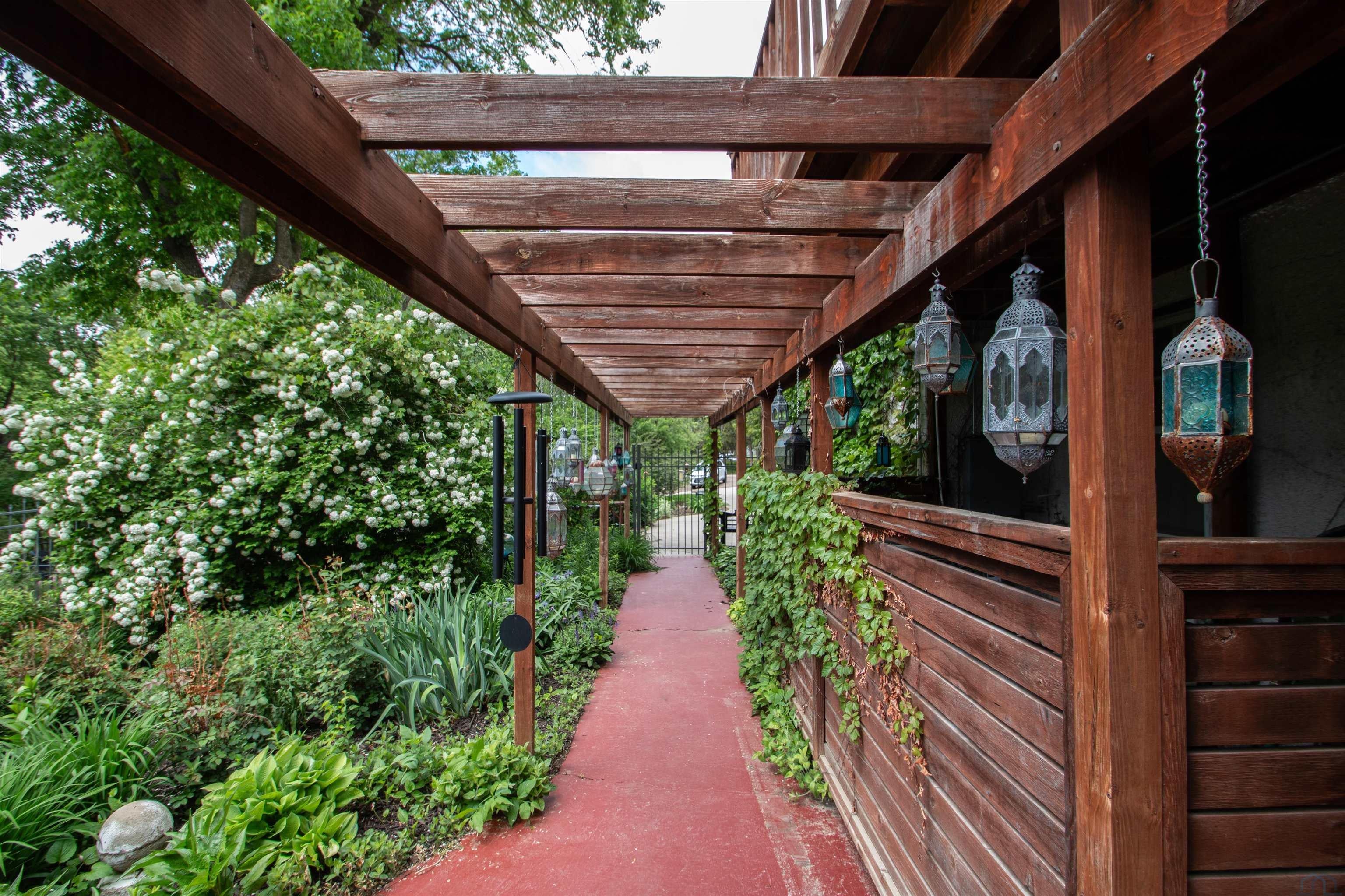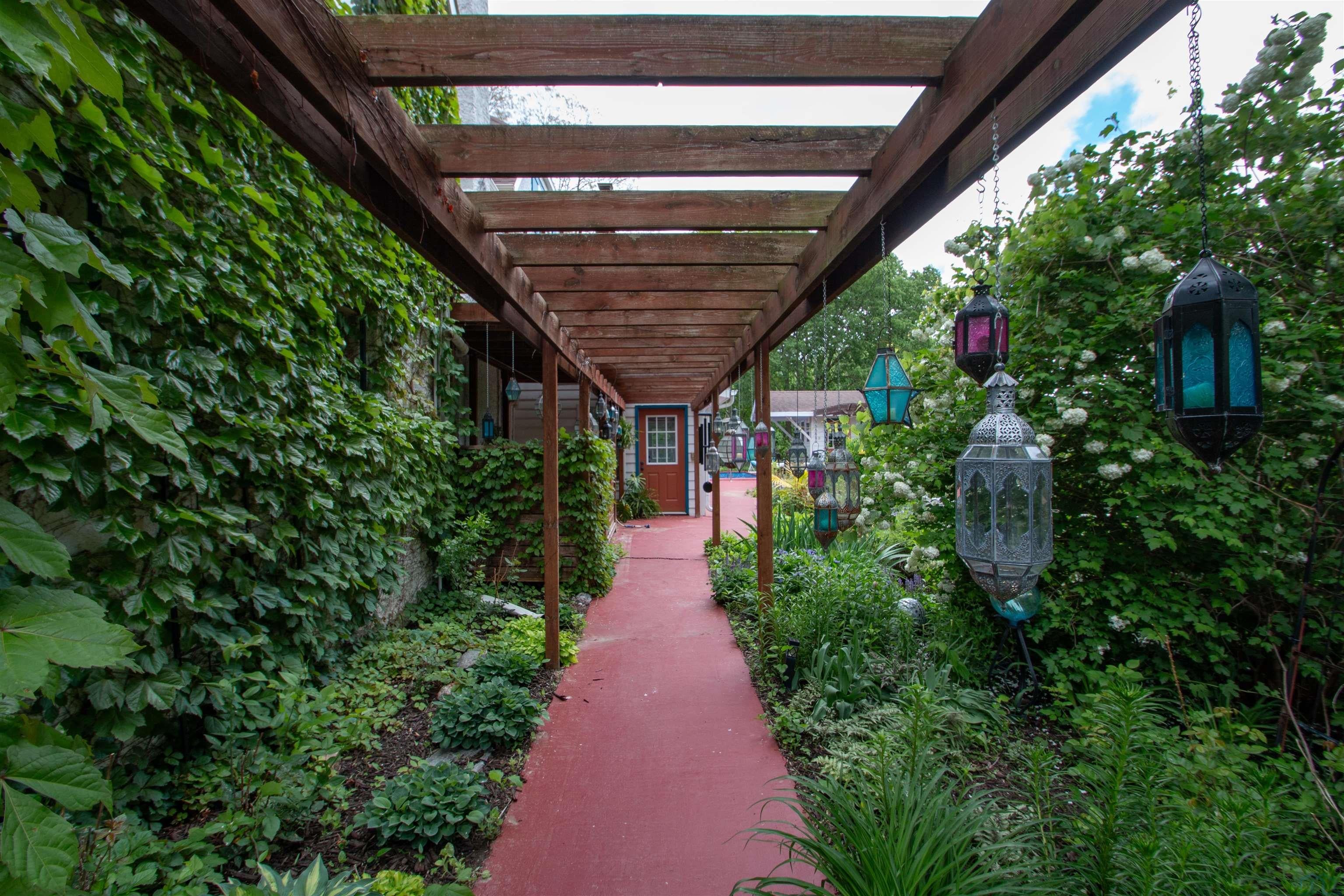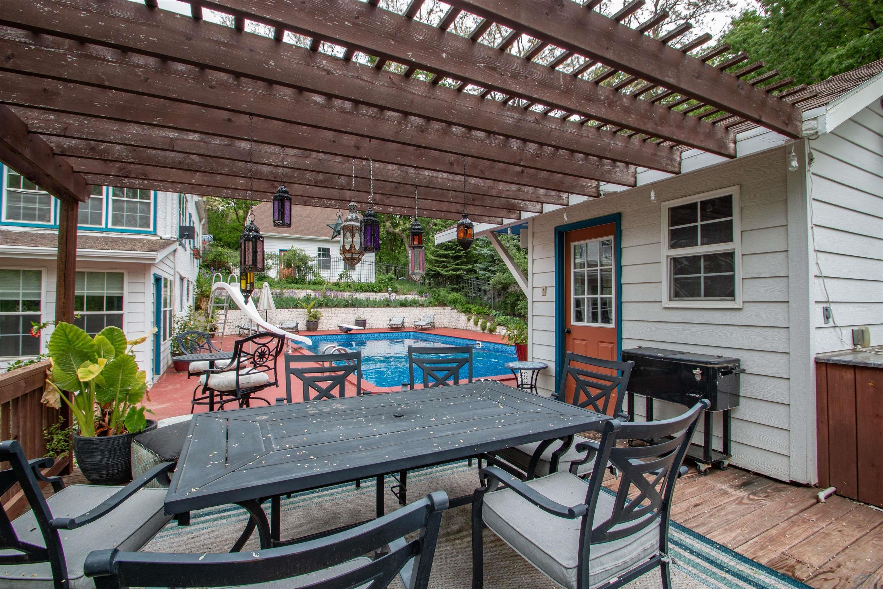 In town acreage, on hard surface street! This 1 1/2 story Bohemian Style stucco home, built in 1920 exudes all the character and charm of that vintage with wood floors and wood trim throughout. Rounded front door to the living room with wood burning fireplace, built in hutch, two french doors to deck, and open to large dining room ready to entertain guests. Kitchen was updated with 5 burner gas stove, island, walk in pantry, double oven and eating area with tile floor. Master bedroom on the main, main floor bath, and two other bedrooms. Upstairs is 2nd master suite with WIC: 22 x 10 8 x 27. 5th bedroom upstairs, all wood floors, another full bath. Lower level has laundry room, family room with barn wood finish, light and bright 3 season room with tile floor, 3/4 bath, wine cellar or safe room, and den area. Tuckunder garage, plus 24x24 detached garage and one single garage for storage: HIGHLIGHTS OF THIS PROPERTY: Garden areas, fruit trees: apples, pears, cherry, raspberries, strawberries. Greenhouse: 12 x 20 built in 2019, used year round. Flower beds, veggie beds, plantings galore. Pool house, Deck, Inground pool with new pool liner 2 years ago and pump and heater replaced 3 years ago, Hot tub stays. Oversized firepit area with seating area. MAJOR ADDITION: 48 X 96 insulated METAL BUILDING built in 2016. This amazing building is set up basketball, volley ball and tennis standards. There is an apartment above with small kitchen and viewing of the activities below. No need to leave home with this incredible property, entertaining area for all seasons. There is a pasture on the other side of the creek if you bring your pony. Underground pet fence for Fido. Seller will carry contract with 20% down payment at 4 percent APR to a qualified buyer.
