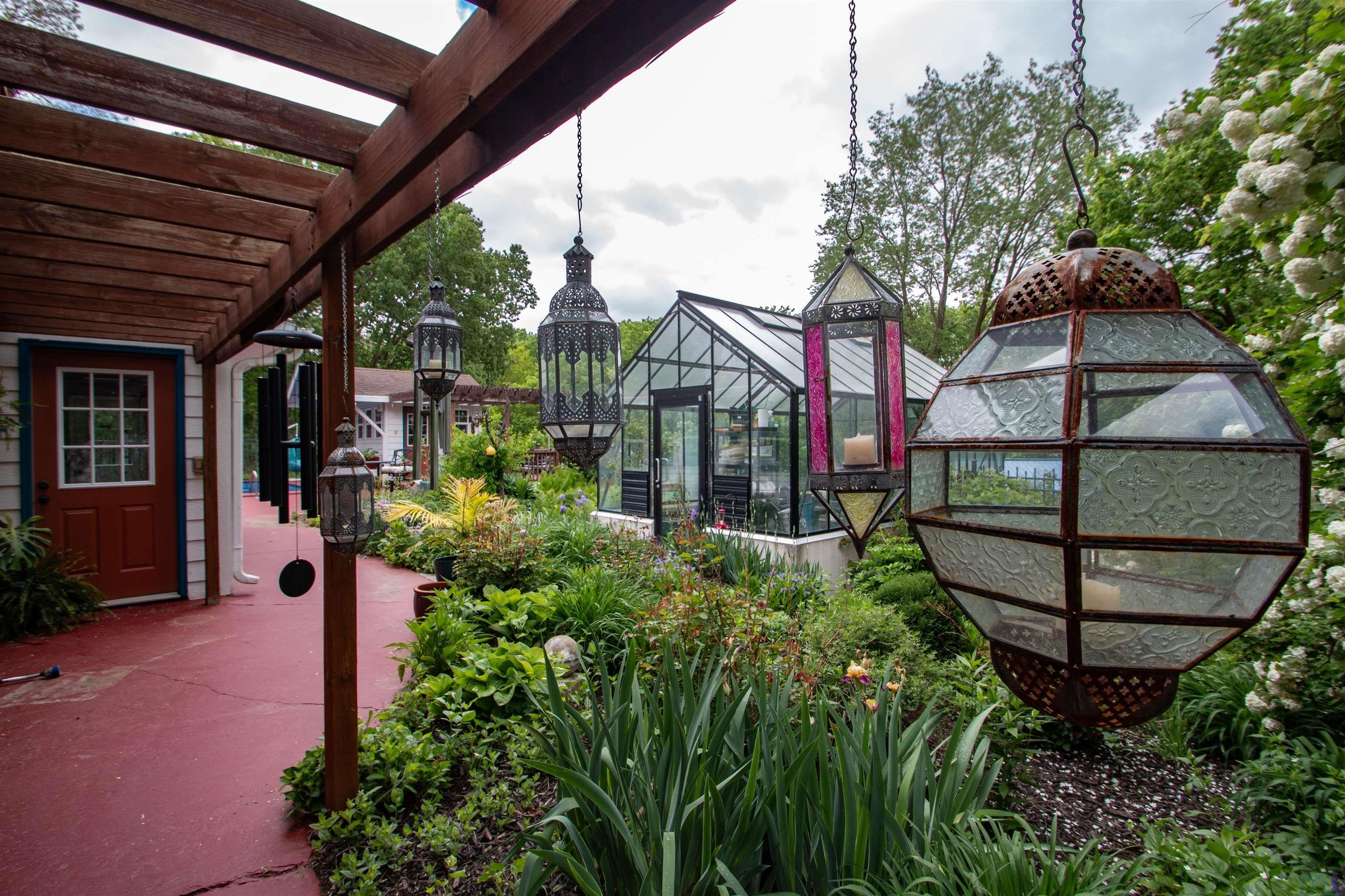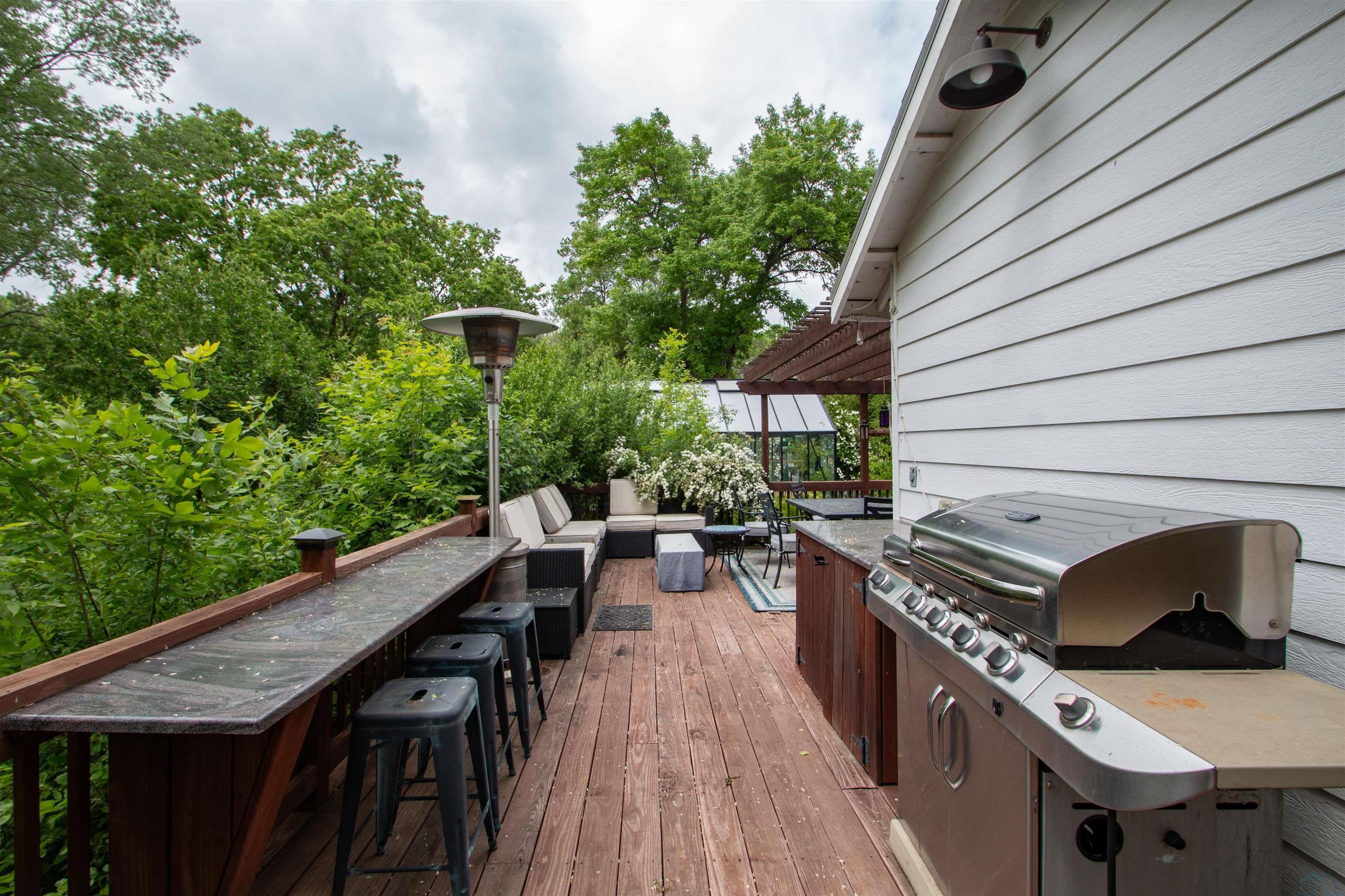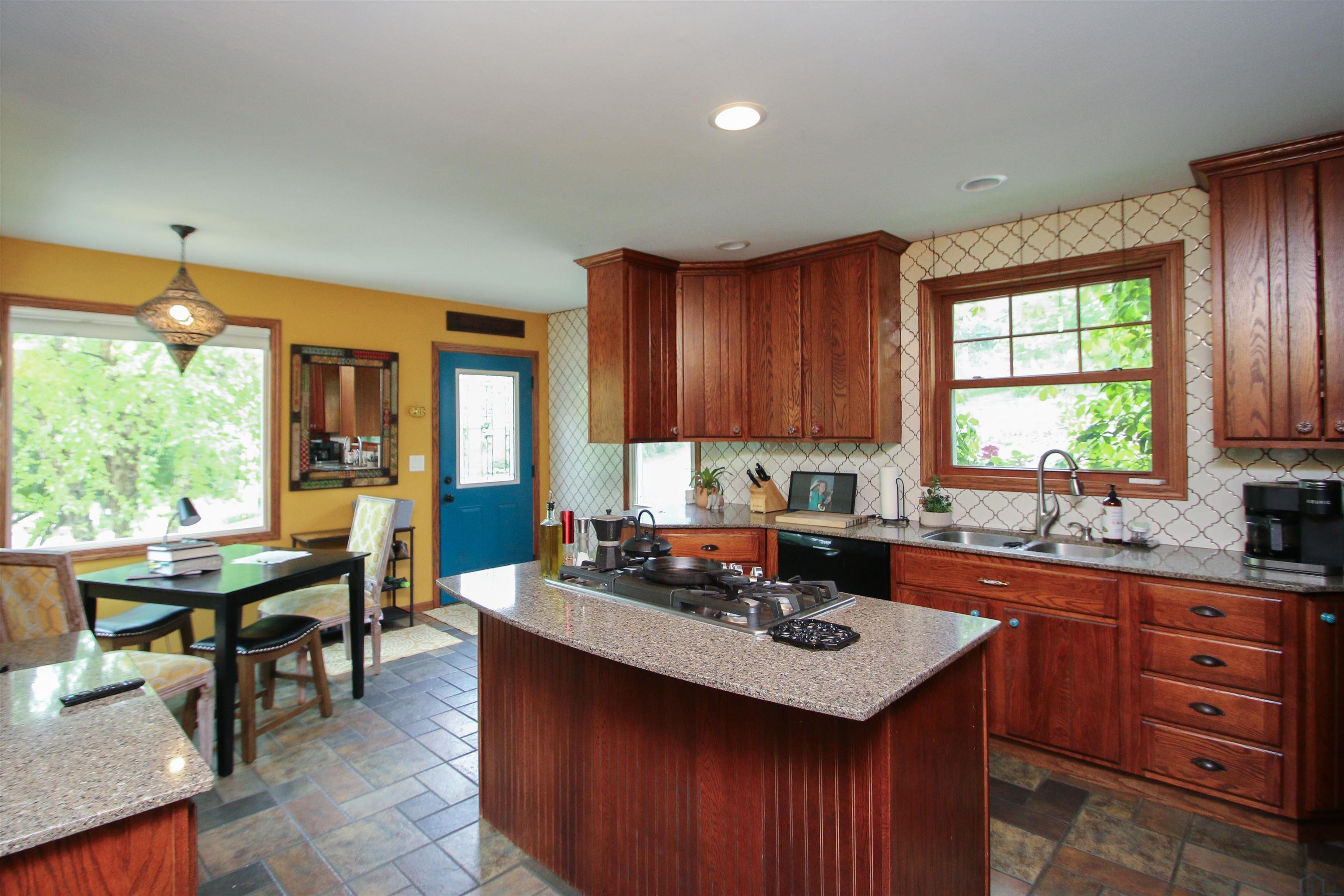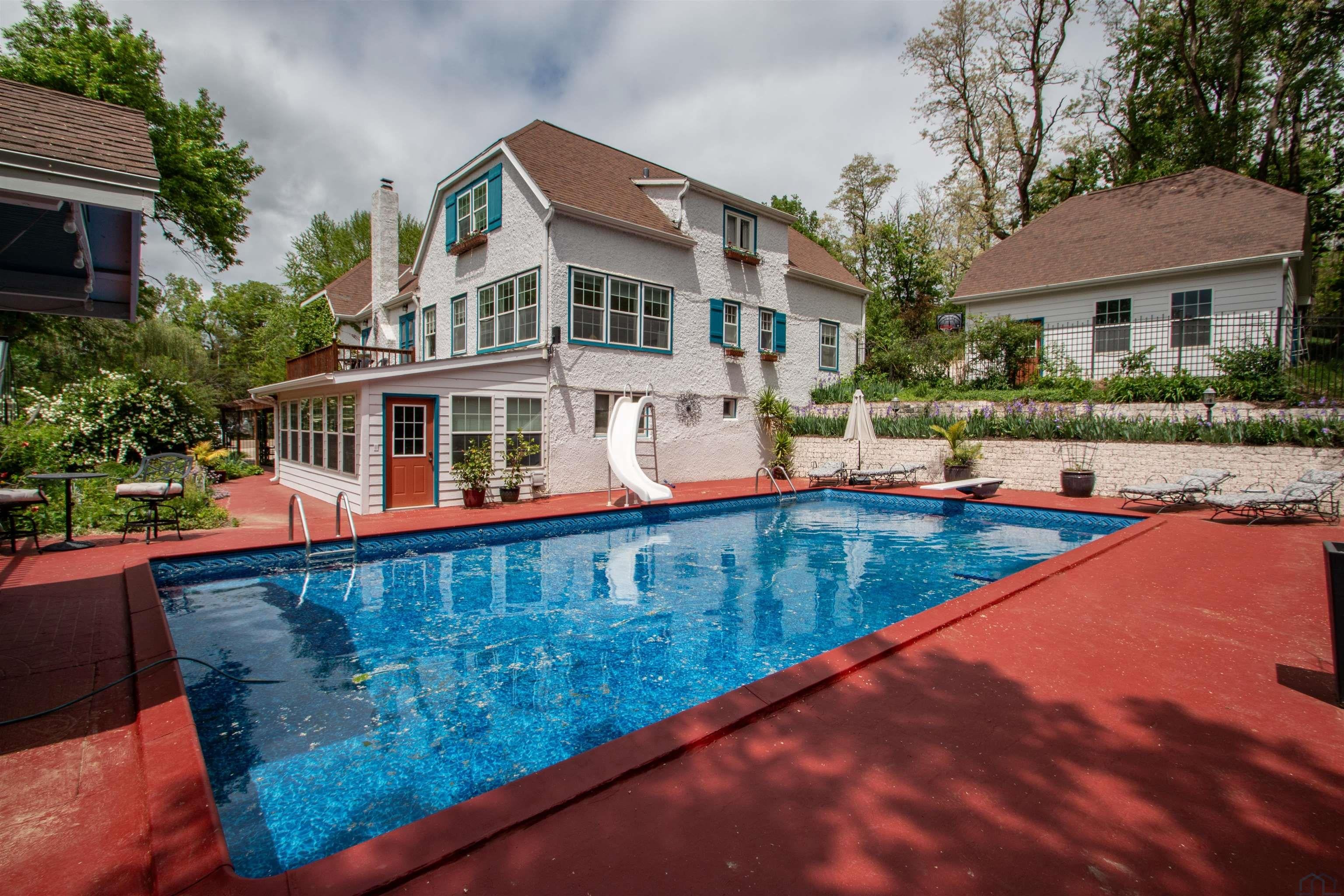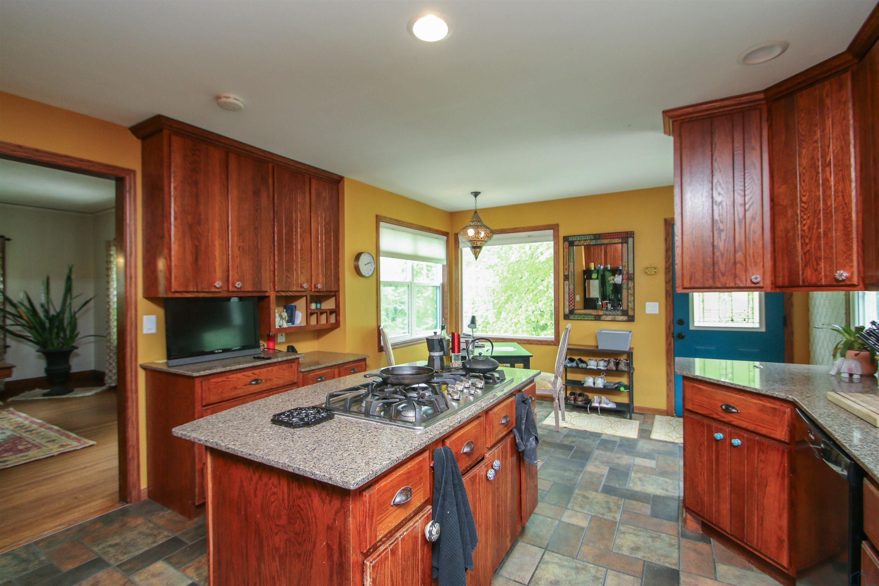 In town acreage, on hard surface street! This 1 1/2 story Bohemian Style stucco home, built in 1920 exudes all the character and charm of that vintage with wood floors and wood trim throughout. Rounded front door to the living room with wood burning fireplace, built in hutch, two french doors to deck, and open to large dining room ready to entertain guests. Kitchen was updated with 5 burner gas stove, island, walk in pantry, double oven and eating area with tile floor. Master bedroom on the main, main floor bath, and two other bedrooms. Upstairs is 2nd master suite with WIC: 22 x 10 8 x 27. 5th bedroom upstairs, all wood floors, another full bath. Lower level has laundry room, family room with barn wood finish, light and bright 3 season room with tile floor, 3/4 bath, wine cellar or safe room, and den area. Tuckunder garage, plus 24x24 detached garage and one single garage for storage: HIGHLIGHTS OF THIS PROPERTY: Garden areas, fruit trees: apples, pears, cherry, raspberries, strawberries. Greenhouse: 12 x 20 built in 2019, used year round. Flower beds, veggie beds, plantings galore. Pool house, Deck, Inground pool with new pool liner 2 years ago and pump and heater replaced 3 years ago, Hot tub stays. Oversized firepit area with seating area. MAJOR ADDITION: 48 X 96 insulated METAL BUILDING built in 2016. This amazing building is set up basketball, volley ball and tennis standards. There is an apartment above with small kitchen and viewing of the activities below. No need to leave home with this incredible property, entertaining area for all seasons. There is a pasture on the other side of the creek if you bring your pony. Underground pet fence for Fido. Seller will carry contract with 20% down payment at 4 percent APR to a qualified buyer.