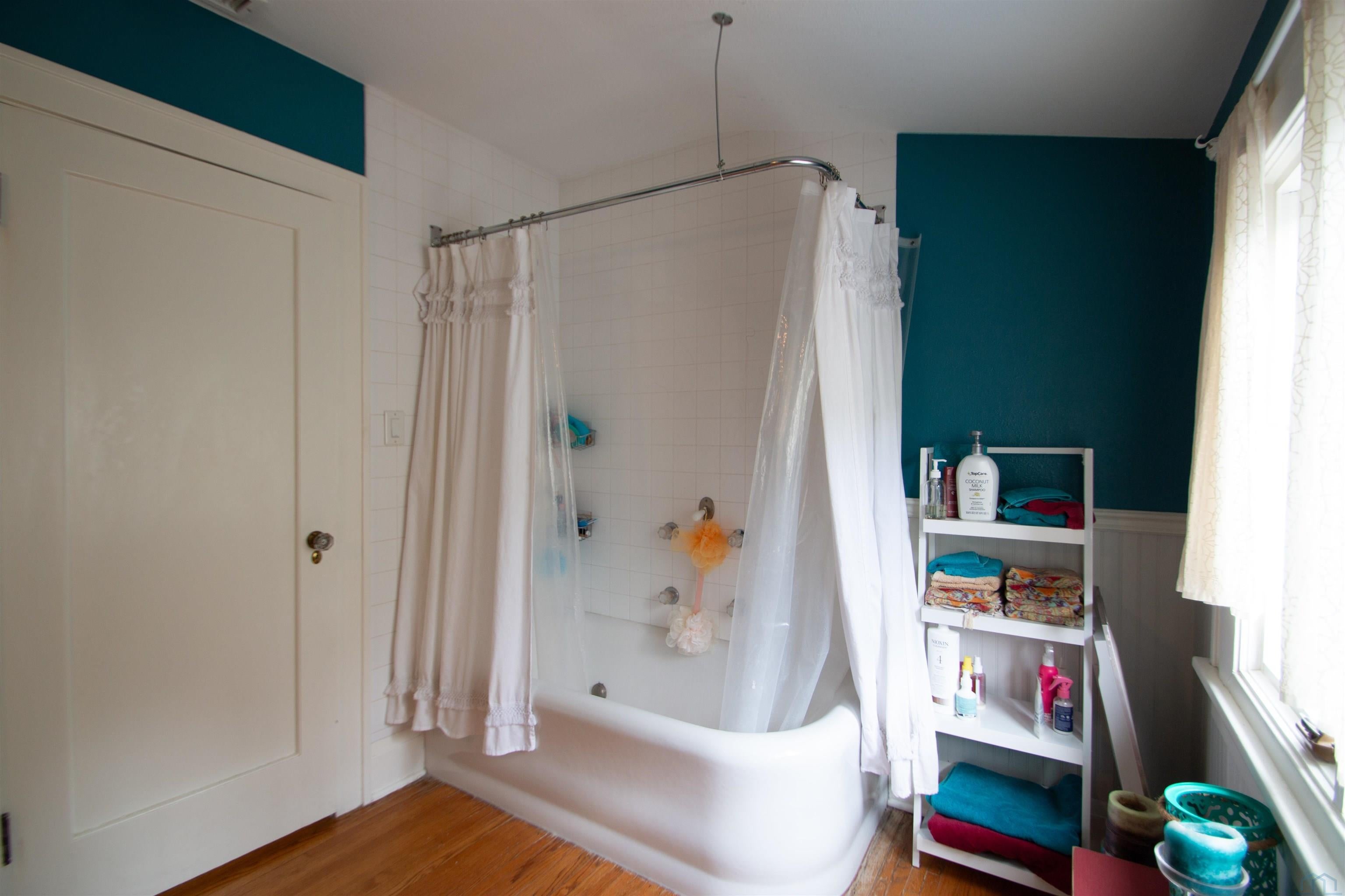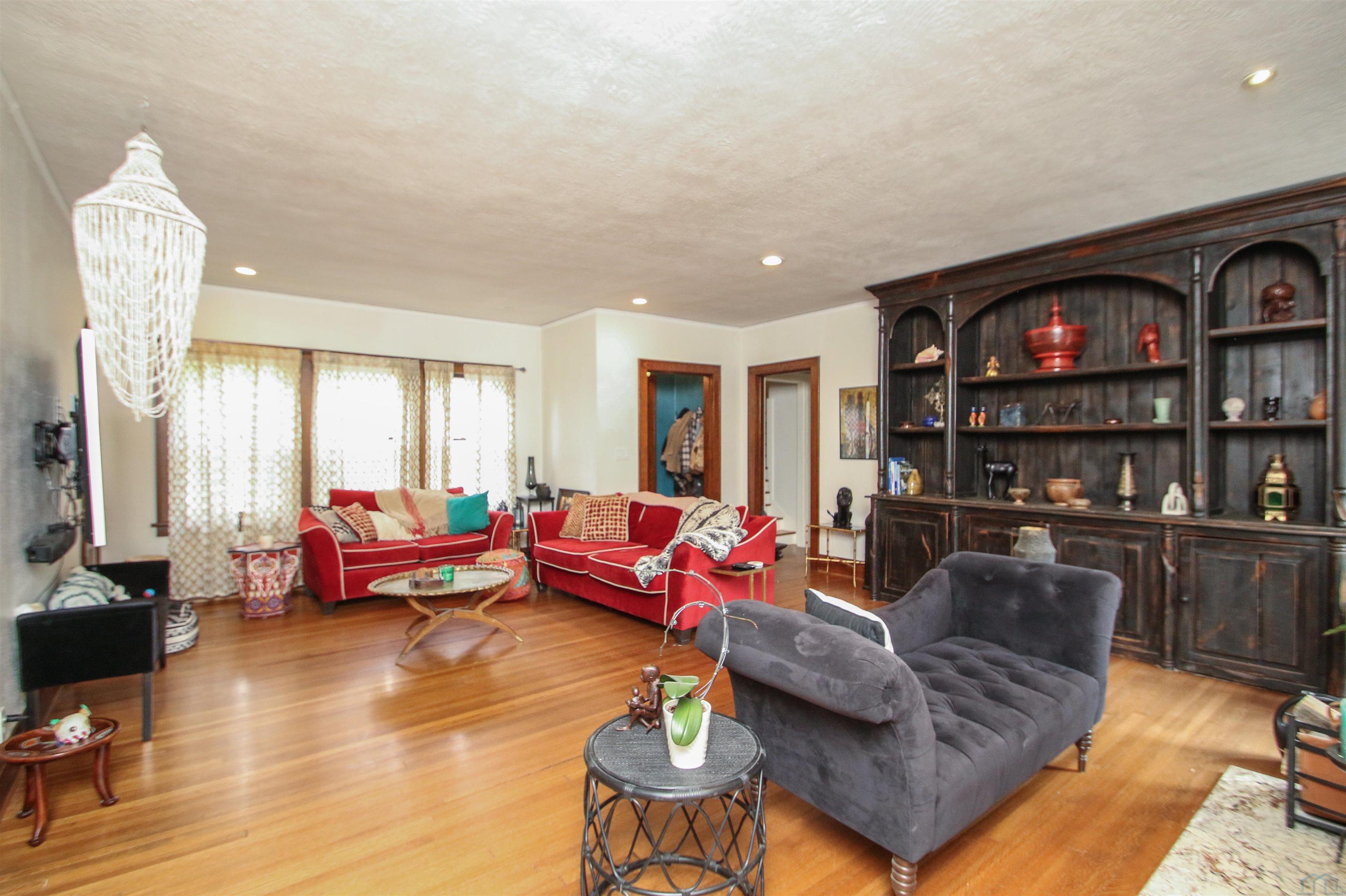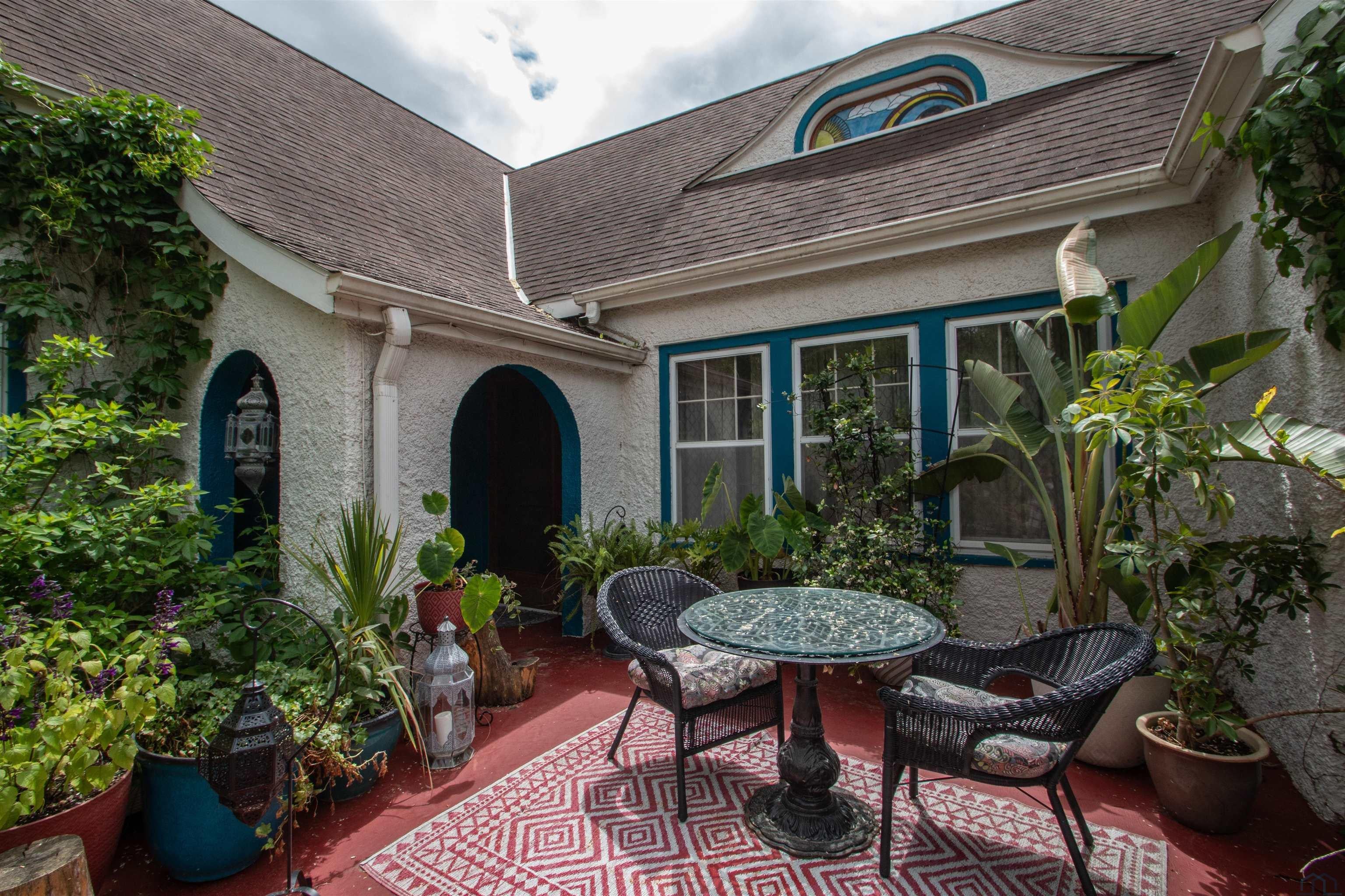 In town acreage, on hard surface street! This 1 1/2 story Bohemian Style stucco home, built in 1920 exudes all the character and charm of that vintage with wood floors and wood trim throughout. Rounded front door to the living room with wood burning fireplace, built in hutch, two french doors to deck, and open to large dining room ready to entertain guests.