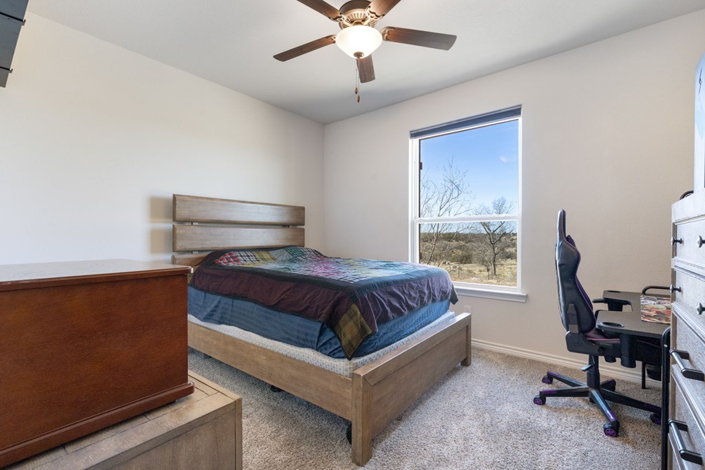 Panoramic views are here! This nearly new Hill Country home, built in 2022, welcomes your horses, green thumb, and large family or frequent guests. Situated on 15 ag exempt cross fenced acres in a gated rural subdivision, not far from the restaurants, shops and wineries of small-town Fredericksburg. On one side of the split floor plan is your owner suite which includes a full bathroom and two walk in closets, plus views! The opposite side of the house has three more bedrooms which share a full bathroom. In the kitchen, enjoy quartz countertops, stainless steel appliances, counter seating plus space for a breakfast table. Plenty of room for company while you cook. Outside you will find a small stable, raised garden beds, a flower garden and several outbuildings. This place is move in ready!