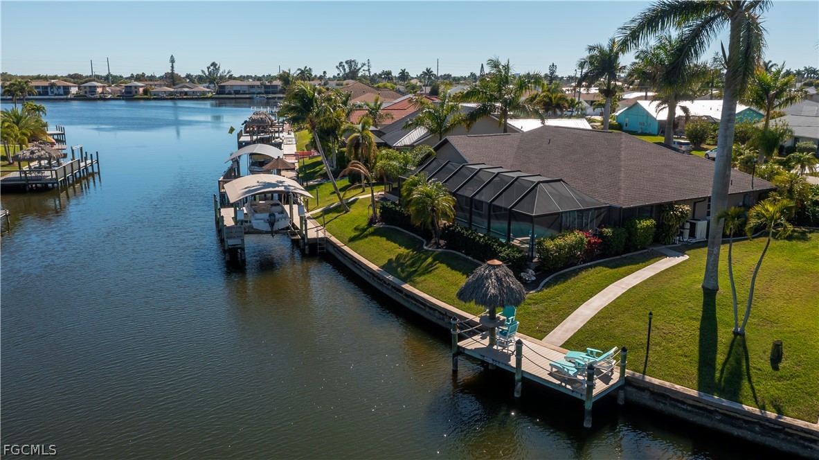 If you're looking for the perfect blend of luxury and Florida lifestyle…Look no further!! Welcome to this beautiful Gulf Access Pool Home located just minutes by boat from the river to restaurants, beaches and the Gulf. This property offers expansive outdoor space featuring a Tiki Bar plus an additional boat dock with 10,000 boat lift making it easy to enjoy the best of SW Florida's boating lifestyle. PLUS,,,,IT COMES WITH A 2004 20' HURRICANE DECK BOAT with 115 HP 4 stroke Yamaha outboard motor! Nestled in a quiet, desirable neighborhood in the sought-after SW Cape Coral area, this home offers 2168 Sq Ft of living space that includes 3 Bedrooms, 2 Full Baths, Den, Home Office or 4th Bedroom, and Pool/Spa. The interior is bright and modern throughout. The open-concept kitchen features a large island with granite countertops, breakfast bar seating, pantry and stainless-steel appliances. This space flows into the living and dining areas and it all overlooks the pool and canal, making it ideal for entertaining. For the ultimate relaxation, the primary bedroom offers an enclosed atrium where lush planters create a serene oasis. The outdoor living area offers ample space for dining and lounging. Whether you a hosting gathering or enjoying a peaceful evening, this space is thoughtfully designed to help you make the most of SW Florida's beautiful weather. Do not miss the opportunity to own this beautiful piece of paradise. Schedule your private showing today.