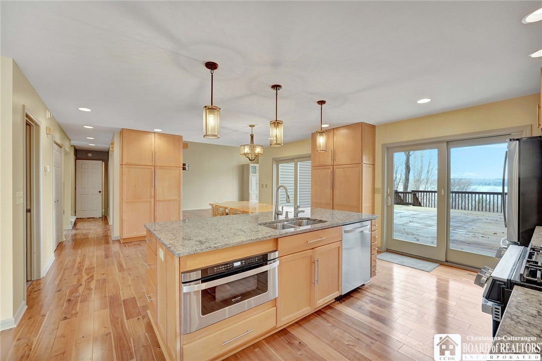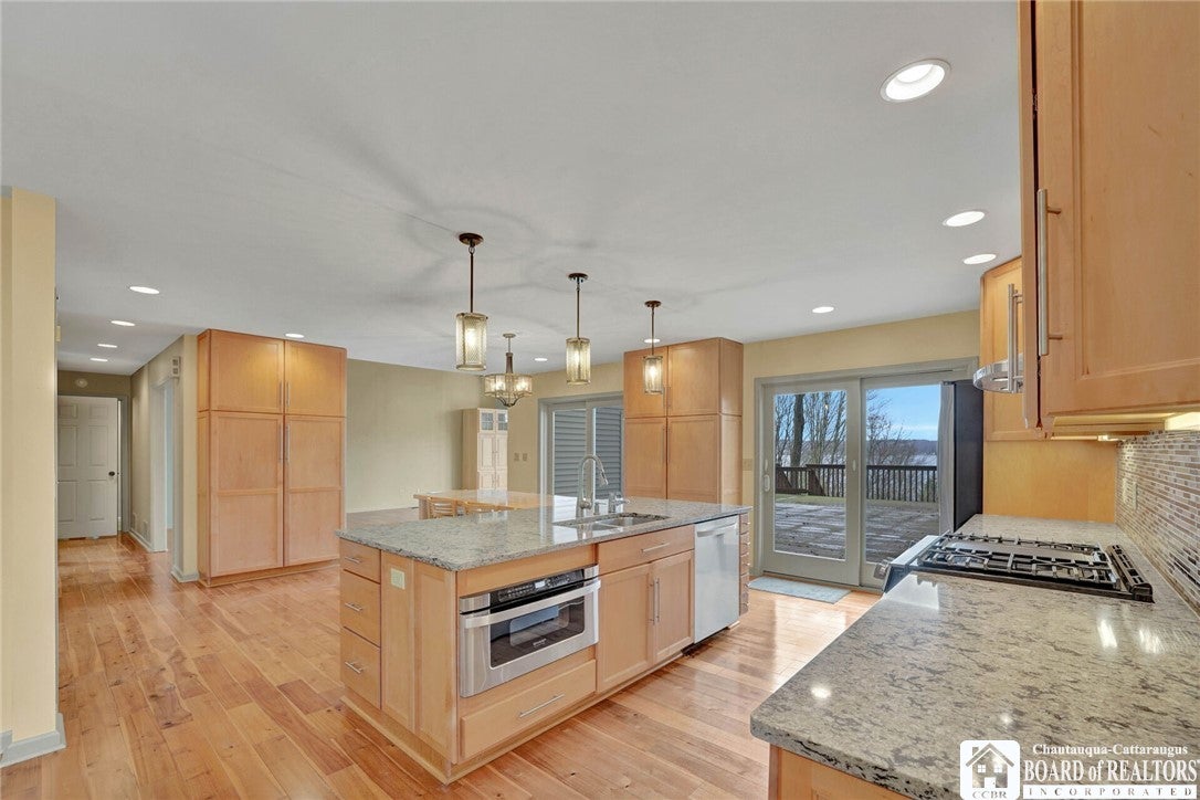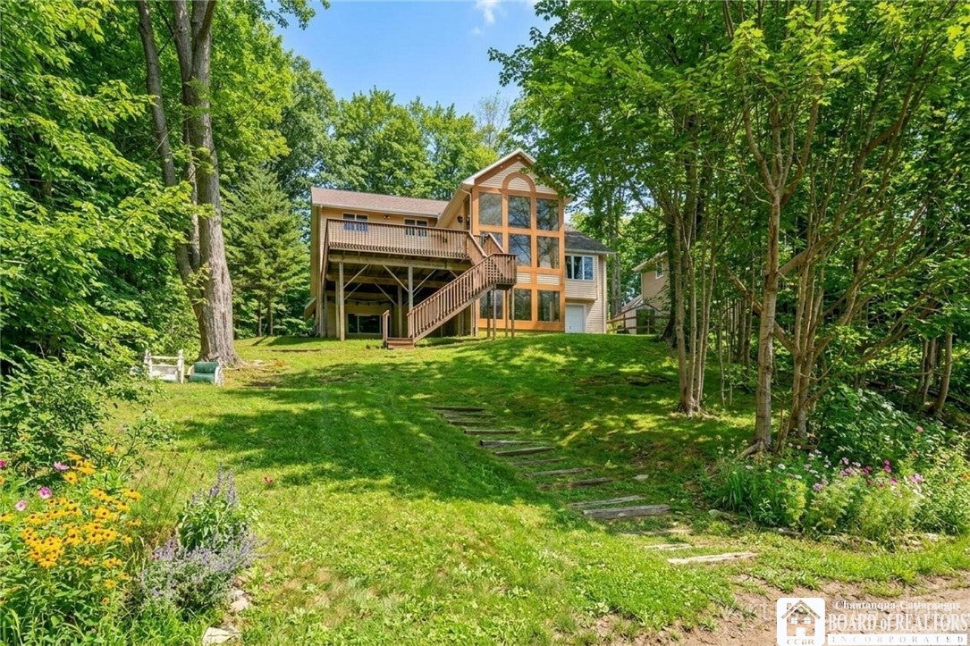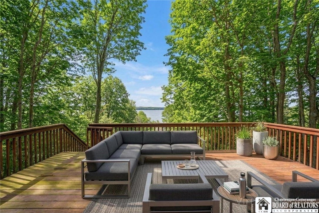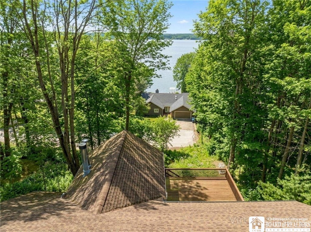 Set on a secluded lot with incredible views of Chautauqua Lake, this one-of-a-kind home offers over 4,300 square feet of living space designed to take full advantage of its surroundings. Large windows and open, airy spaces bring in tons of natural light while framing the lake from multiple vantage points throughout the home. The outdoor space is just as impressive, featuring a generous deck that’s perfect for relaxing, entertaining, or simply enjoying the sunset over the water. With deeded lake access and a boat slip included, you’ll have everything you need to fully enjoy lake life all season long. The interior offers a flexible layout with five bedrooms spread across three levels, giving plenty of room for both everyday living and hosting guests. The primary bedroom provides a quiet escape with its own private bath and peaceful views. Downstairs, the walkout lower level adds even more usable space, complete with additional bedrooms, a full bathroom, a second living area, and a wet bar—ideal for gatherings or extended stays. Offering a balance of privacy and convenience, this property is a great fit for anyone looking to enjoy the lake while still having space to unwind. Opportunities like this don’t come around often in the Chautauqua Lake area.