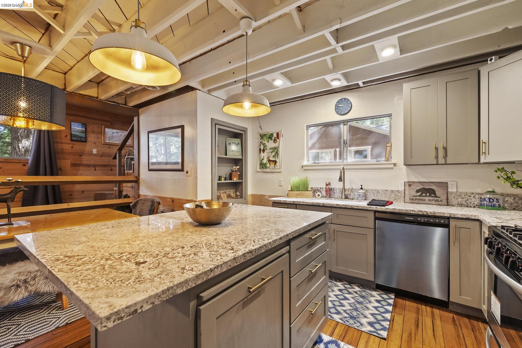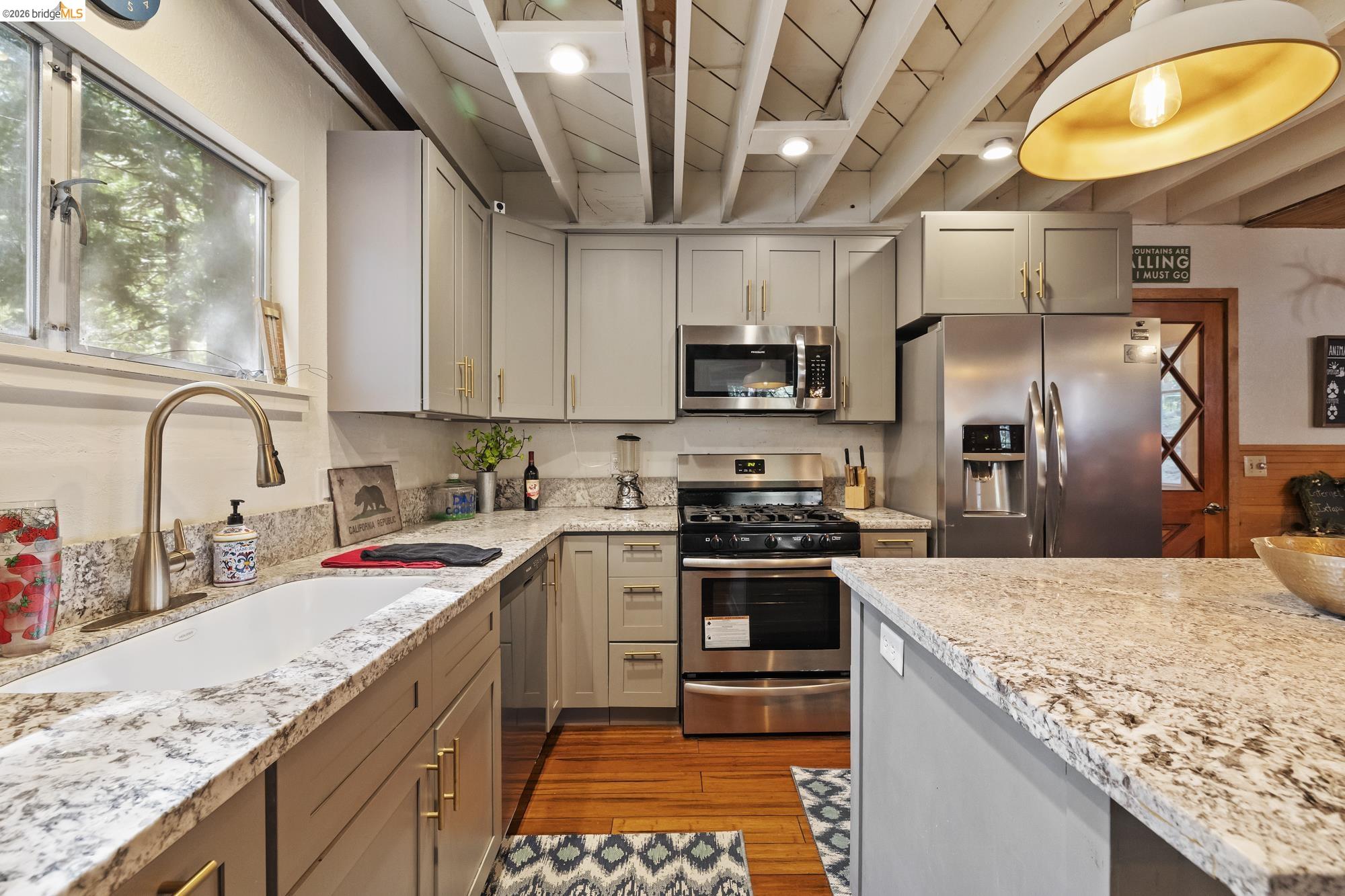 This Strawberry Cabin embodies all of the mountain charm you have been looking for. Listen to the sounds of the rushing river perfectly situated within walking distance. The Stanislaus River allows you to enjoy the soothing sounds of nature right from your doorstep. Beautifully remodeled, the kitchen has stainless steel appliances, granite countertops and modern lighting.