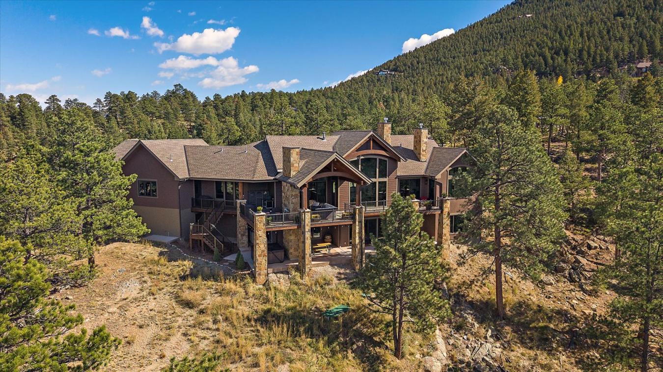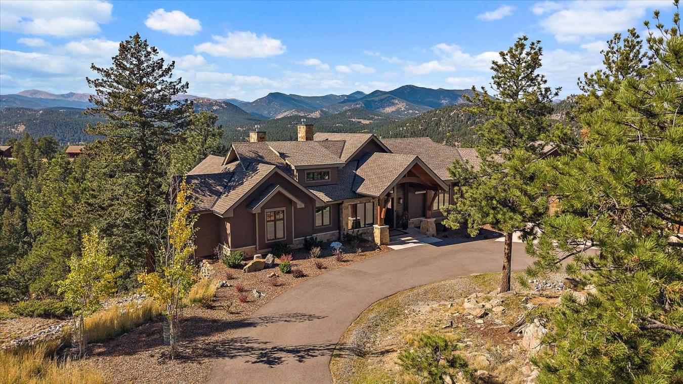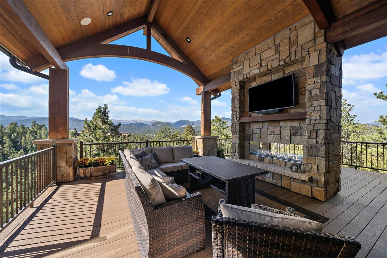This is the ultimate estate with a blend of convenience, privacy & perhaps the best snow-capped views in Evergreen. This custom home offers luxurious, yet comfortable, mountain living with stunning architectural touches. There is a harmonious blend of rustic and modern finishes. As you enter the foyer, Mt. Blue Sky is optimally framed in the windows beyond. The great room offers a large entertaining area with a warm wood-paneled ceiling & over-sized fireplace. This area flows seamlessly into the dining area that has been designed for gatherings large or small & open to the gourmet kitchen w/ the epicurean in mind. From the gas range to enormous pantry and island, you will love cooking and engaging with family. Thoughtfully constructed with aging in place in mind, the home offers true main level living. A sumptuous primary suite captures the expansive views and a fireplace while the bath is magazine-worthy. Enjoy the huge closet that conveniently connects to the stunning laundry room. The main level office might be difficult to work in given the snow-capped vistas, but it is worth a try. The lower level is the ideal space for entertainment. A game room/family room welcomes you where the pub-like bar will become the hub of the space island & brick surround. A media room makes the perfect space for movie watching & there are two generously-sized bedroom (one has its own en-suite bath). The home gym means less trips leaving your private oasis. A huge bonus is the 2300 sqft unfinished space w/separate garage door. This is a blank slate for your storage, living expansion, hobbies. The attached 3 car garage is heated, and offers a shower and entrance into a mud room that was designed with 4-legged friends in mind. As astonishing as the interior is, the exterior is awesome w/ upper level deck offering an outdoor living room w/ gas fireplace, TV space and multiple seating areas. The lower patio has a private hot tub. Enjoy a real yard, & gentle driveway.