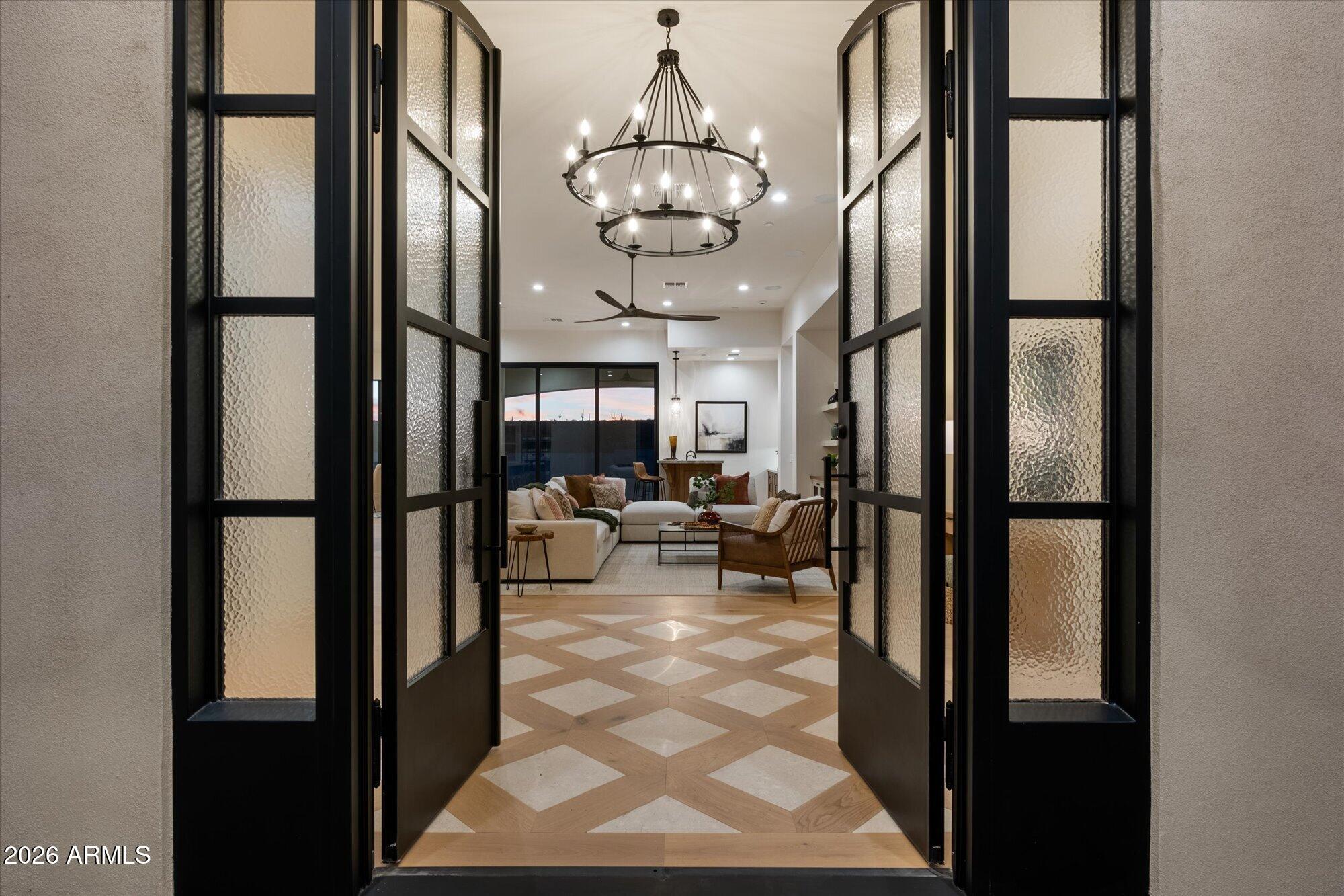 BRAND NEW Modern Spanish Mediterranean architecture, thoughtfully designed on 1.6 acres with breathtaking panoramic mountain views and unforgettable Arizona sunsets.Offering 4,200 square feet, 4 ensuite bedrooms, 5.5 baths (1 outdoor) and an expansive 3-car garage with attached RV garage. This home delivers luxury, functionality, and elevated design at every turn.Solid white oak flooring flows throughout the main living areas, complemented by carefully curated designer tile in the bathrooms and laundry. The chefs kitchen is a true showpiece featuring dual oversized islands--each with its own sink, one with bar seating--custom Alder cabinetry with built-in spice racks, utensil bins, silverware drawers, trash pulls, a Sub-Zero refrigerator, Wolf 6-burner gas cooktop with custom designer hood, double ovens, dishwasher plus dishwasher drawer, and a stunning backsplash that ties the space together beautifully.The split floor plan provides ultimate privacy, with all four bedrooms offering ensuite baths, curbless walk-in showers, and walk-in closets. The primary suite is a retreat of its own, introduced by a private wet bar with seating before entering the bedroom. The tall statement windows that flow to the floor capture spectacular mountain views. The spa-inspired primary bath features dual split vanities, a dual-entry walk-in shower, two private toilet rooms (one with urinal, one with bidet), and a massive custom closet complete with built-ins and its own stacked washer and dryer.The uniquely designed laundry room is both functional and charming, featuring custom frameless cabinetry, a sink, Frigidaire refrigerator, and a dedicated wrapping station--finished in distinctive light blue tones that make it truly one-of-a-kind.The 1.6-acre lot offers a blank canvas backyard ready for your custom pool, outdoor living, or resort-style vision. Endless possibilities. Unmatched views. A rare opportunity to own a brand-new custom move-in ready luxury home that captures everything Arizona living is about. 2 Water heaters, RV dumping station, extended garage, RV gate, Surround sound, wired throughout with Speakers, Alarm system and so much more.