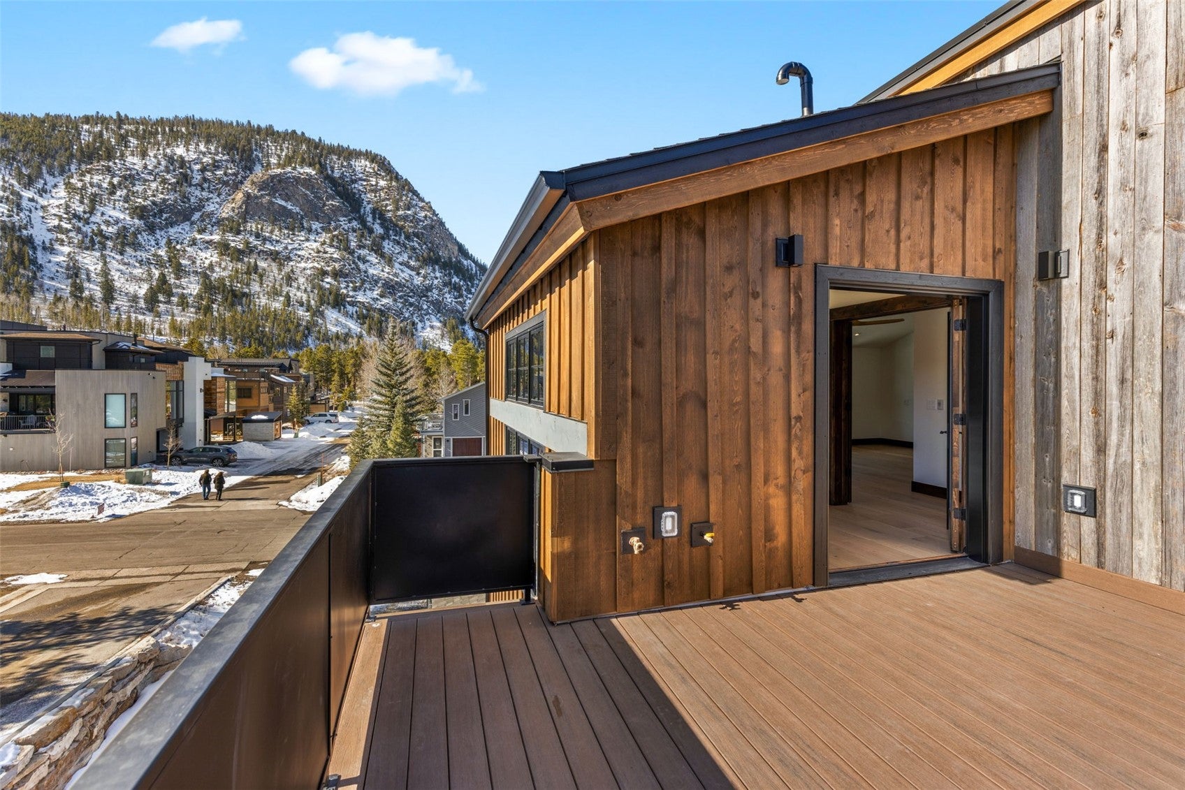 COMPLETE! END UNIT - IN THE HEART OF FRISCO! NEW CONSTRUCTION Located two blocks from Main Street on the south side of town close to the trails. This exceptional townhome offers a spacious living area, large primary bedroom, with a five-piece bath, and incredible chandelier in the stairwell. Two car heated garage with epoxy floor. The standout feature is the incredible mountain views from multiple decks of the Ten Mile and Gore Range. The rooftop deck is structurally designed to support a hot tub or firepit. Each residence includes 3 bedrooms, 3 bathrooms, en-suite with two laundry locations, and open great room with custom mantel and stone-surround gas fireplace. The primary bedroom features an additional gas fireplace with a custom accent tile wall. Incredible views form the primary window of Peak One and Mt. Royal. All units have their own unique tile and light fixture selections, Monogram appliances, hardwood and tile flooring, metal railings, natural stone countertops in the kitchen and primary bath, quartz countertops in secondary bathrooms, a beverage bar, pre-wired for EV charging station and pre-wired for solar hookups. Ideally located just steps from the bike path and trail system, offering easy access for hiking, biking, running, snowshoeing, and backcountry skiing or riding. The free Summit Stage is only three blocks away for convenient transportation, and Frisco is just minutes from multiple world-class ski areas. Walk to Main Street and the Frisco Marina for concerts, restaurants, festivals, and more. Homes are energy efficient with HERS Home Energy Ratings and Zero Energy Ready Home (ZERH) certification. Includes a one-year builders warranty from date of closing. Low HOA dues cover all exterior maintenance, roof, landscaping, and snow removal. Townhome platting, you own from the ground to the roof. Great opportunity. MUST SEE! Landscape starting soon.