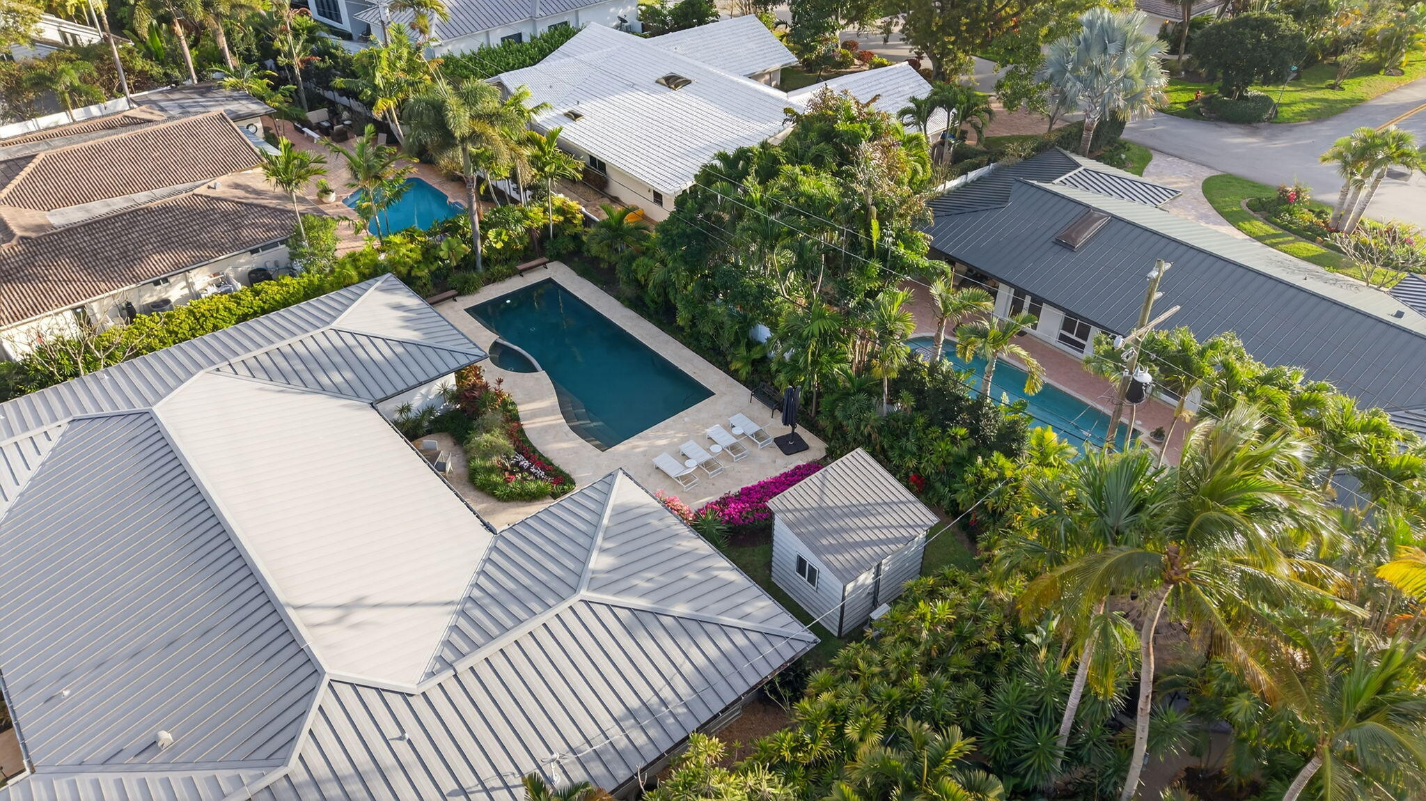 An exceptional opportunity to own a beautifully renovated residence in the prestigious Coral Ridge Country Club neighborhood of Fort Lauderdale, where timeless elegance meets modern luxury.This fully remodeled home offers 3,422 square feet of refined living space, featuring four spacious bedrooms, a dedicated home office, and three and a half beautifully updated bathrooms. A bright open-concept layout showcases porcelain tile throughout the main living areas, hardwood floors in the bedrooms, and seamless indoor-outdoor living through three expansive sliding glass doors. Step outside to a stunning 15x40 resort-style pool surrounded by lush landscaping and mature trees, creating a private setting ideal for entertaining or relaxing. The oversized lot provides exceptional outdoor space and privacy. A separate air-conditioned cabana offers the perfect space for a gym, office, or guest retreat, complemented by an outdoor storage shed with a concrete foundation and a charming side brick patio.Upgrades include brand-new impact windows with power shades, a 2020 metal roof, 2024 A/C system, tankless water heater, new pool heater, cast iron plumbing replaced with PVC, custom-built closets, and a renovated garage featuring high-end cabinetry, epoxy flooring, and A/C.Meticulously upgraded and truly move-in ready, this home delivers luxury, comfort, and peace of mind just minutes from world-class dining, beautiful beaches, and premier golf in one of Fort Lauderdales most desirable communities.