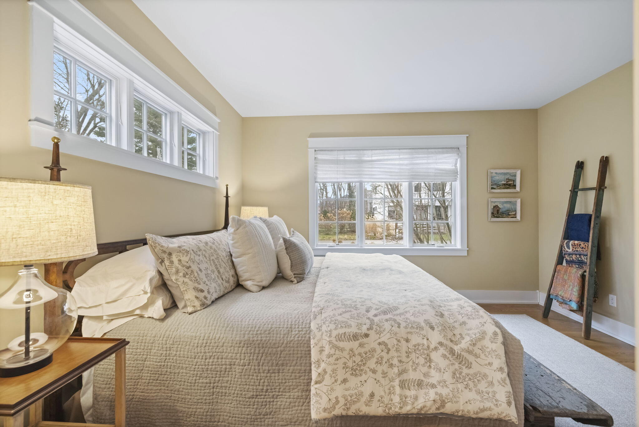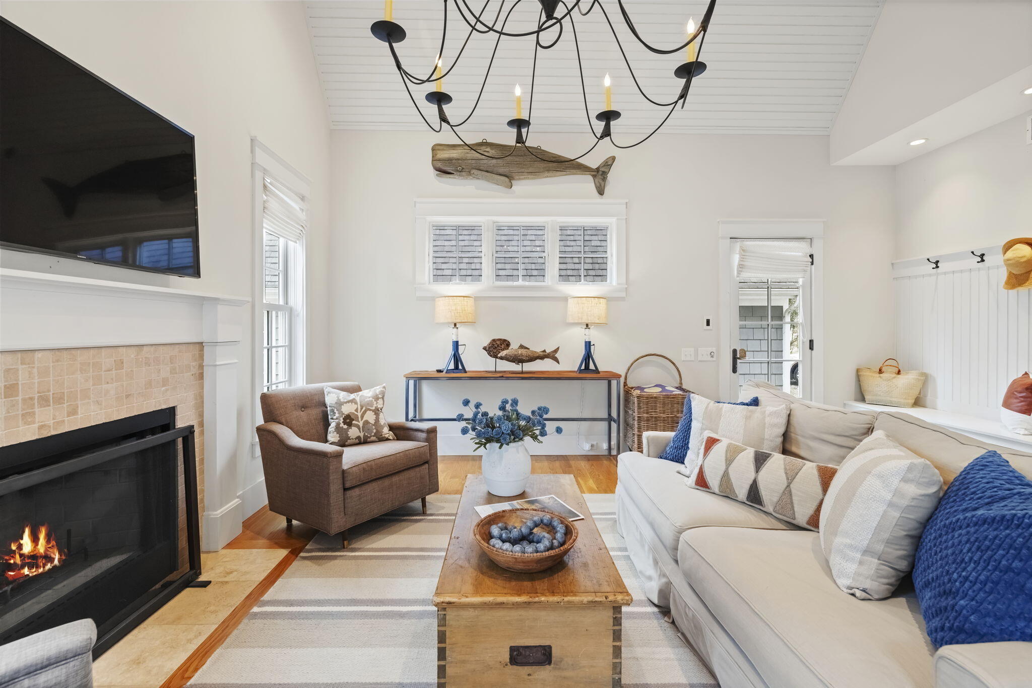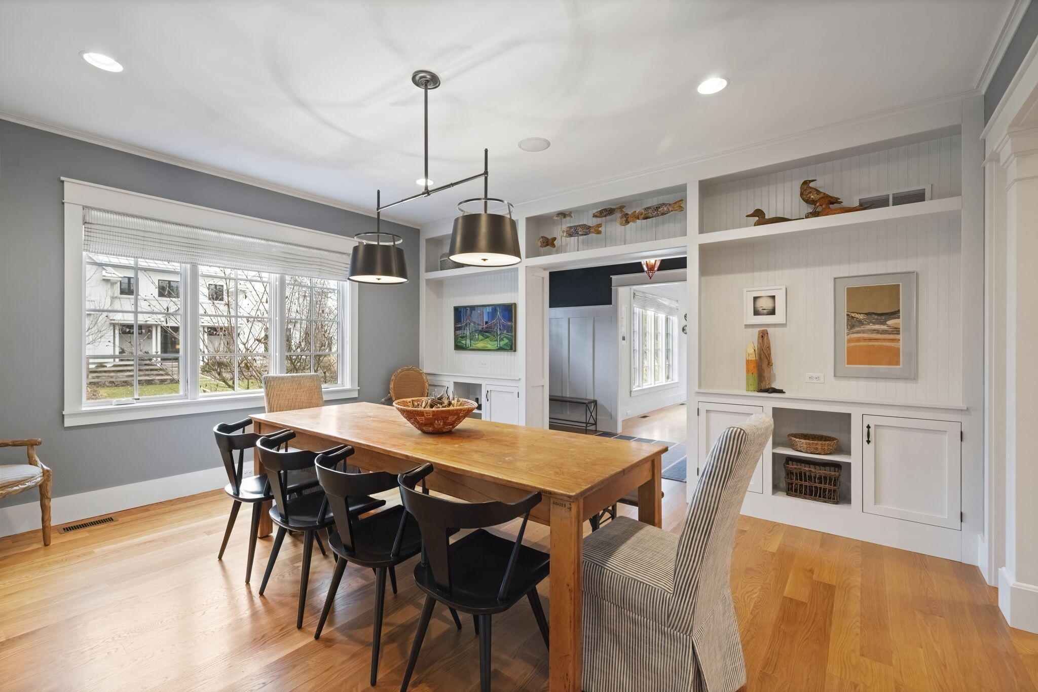 Located off Marquette Drive in the coveted Riviera neighborhood, sits a beautiful Nantucket shingle-style home, ready for your Michigan memories. The heart of the home is a custom central kitchen, designed for gathering and entertaining, featuring Wood-Mode Brookhaven cabinetry, Wolf range, Sub-Zero refrigerator, Bosch appliances, and a wine cooler. A generous center island and southern-facing windows overlook the serene backyard, offering space and sunlight. Built-in vintage cabinetry, custom millwork, wainscoting, and white oak flooring throughout, elevate every space with quiet sophistication.Multiple living areas invite year-round enjoyment, anchored by three fireplaces in the living room, family room, and the show-stopping three-season screened porch overlooking the pool--a favorite space for dining, relaxing, and enjoying peaceful backyard views.