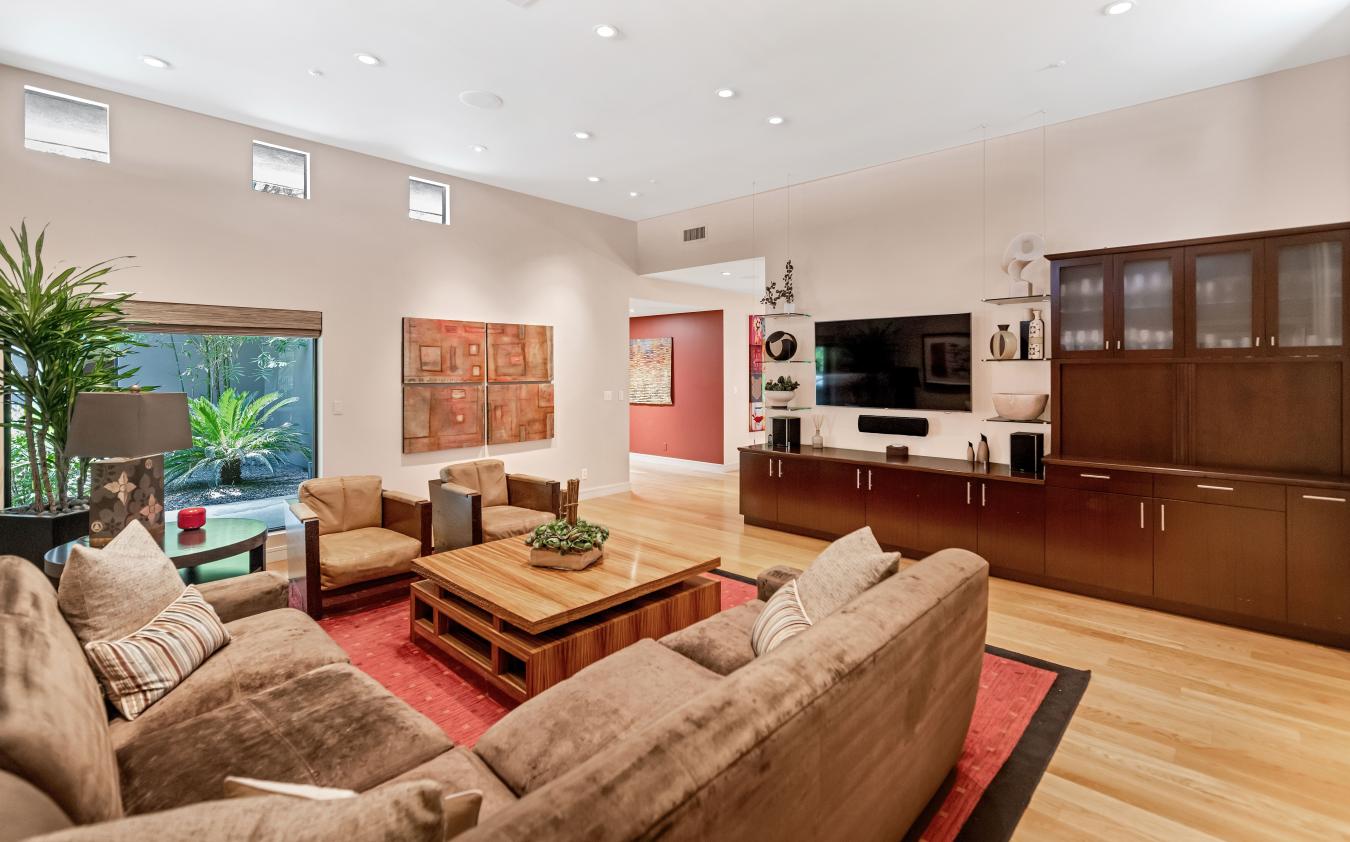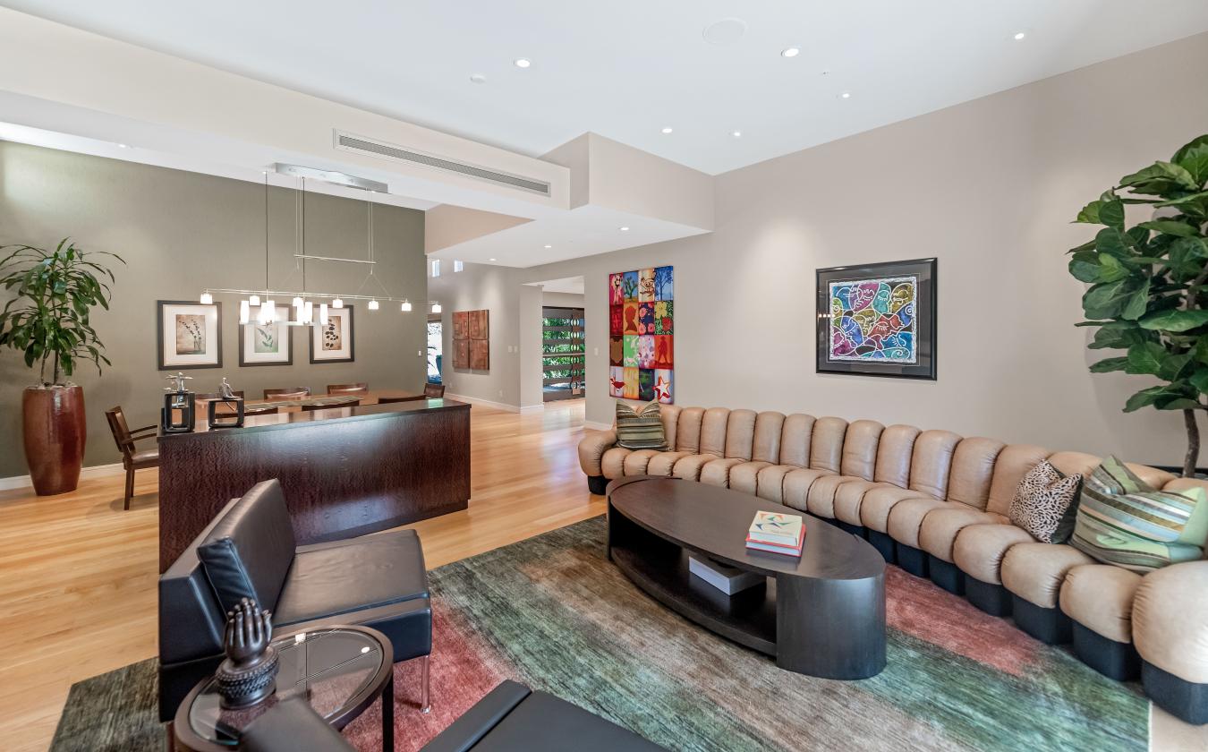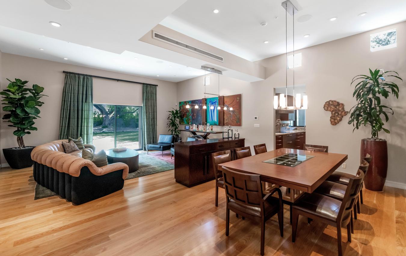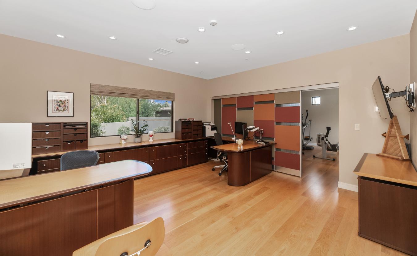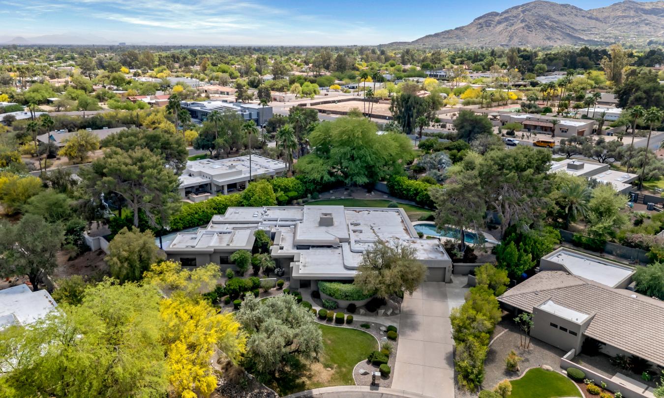 Welcome to this exceptional home, a true architectural gem, originally designed by world-famous Taliesin Architects and reimagined in 2005 as a tribute to the legendary Frank Lloyd Wright. Taken down to the studs and thoughtfully expanded, this residence was transformed to offer an open and functional floor plan, perfect for modern living. From the moment you arrive, youre greeted by a true work of art-the custom hammered steel pivot front door sets the tone for the craftsmanship found throughout the home. Step inside and youll be welcomed by soaring ceilings and celestial windows that bathe the interior in natural light. The spacious layout includes two distinct living areas, offering flexibility and comfort, plus a dining area ideally situated just off the kitchen. A chefs dream, the kitchen features sleek stainless steel Wolf & Sub-Zero appliances, multiple ovens, a warming drawer, a large walk-in pantry with a wine fridge, Poggenpohl cabinetry and plenty of space to gather and create. On one wing of the home, youll find three generously sized bedrooms, with walk in closets, and two beautifully appointed bathrooms. On the other side, the primary suite is a private retreat with a large sliding glass door, built-in bookcase, and a spa-like bathroom featuring honed slate floors, granite countertops, custom cherry wood cabinetry, a jetted tub, steam shower, and a spacious walk-in closet. Additional highlights include a large office with custom-made Herman Miller casegoods designed for the room and a dedicated workout room & flex room ideal for those who work or train from home. Step outside to your own private oasis - lush, mature landscaping surrounds a diving pool, a sport court, and one of the most beautiful mesquite trees youll ever see. The covered patio features a pass-through window to the kitchen, a misting system for comfort, and ample space to entertain or unwind. Located in Mountain View Estates, a secluded enclave of just 56 homes, this property offers both privacy and convenience, close to top restaurants, shopping, and more. This property is truly a one-of-a-kind home in an unbeatable location.