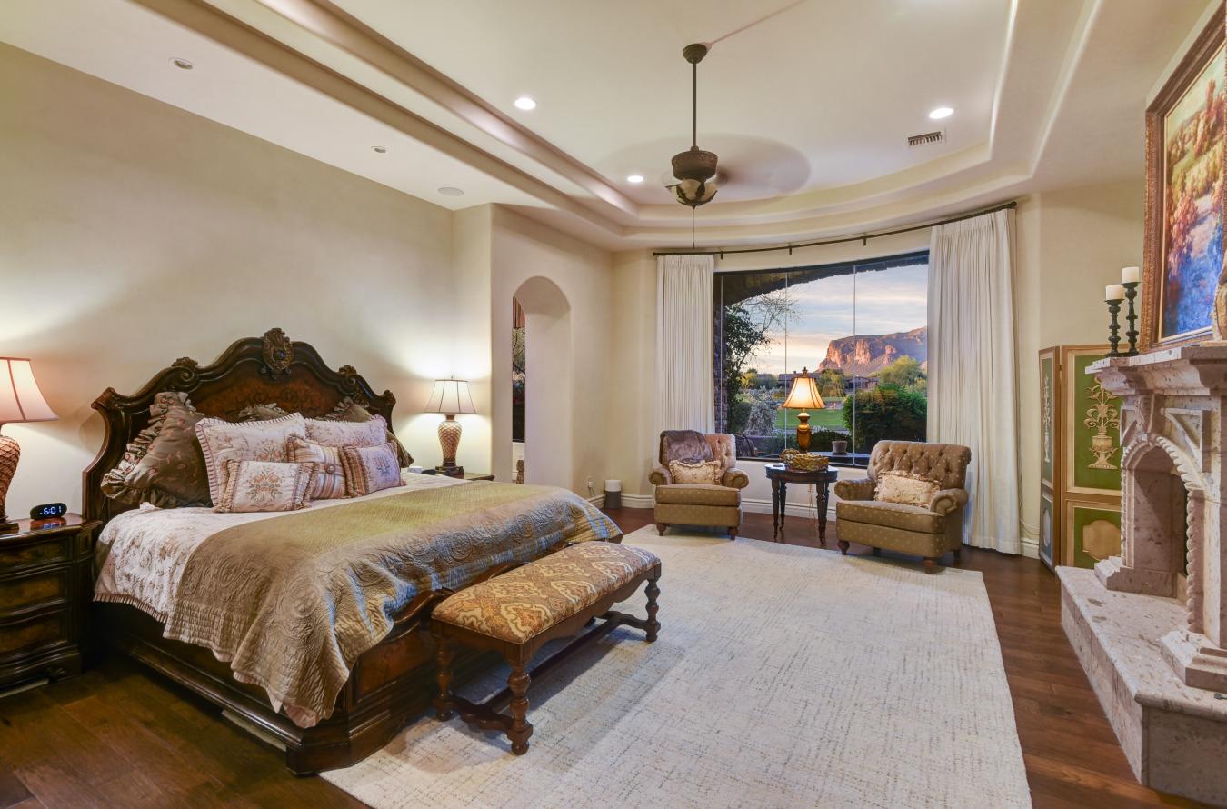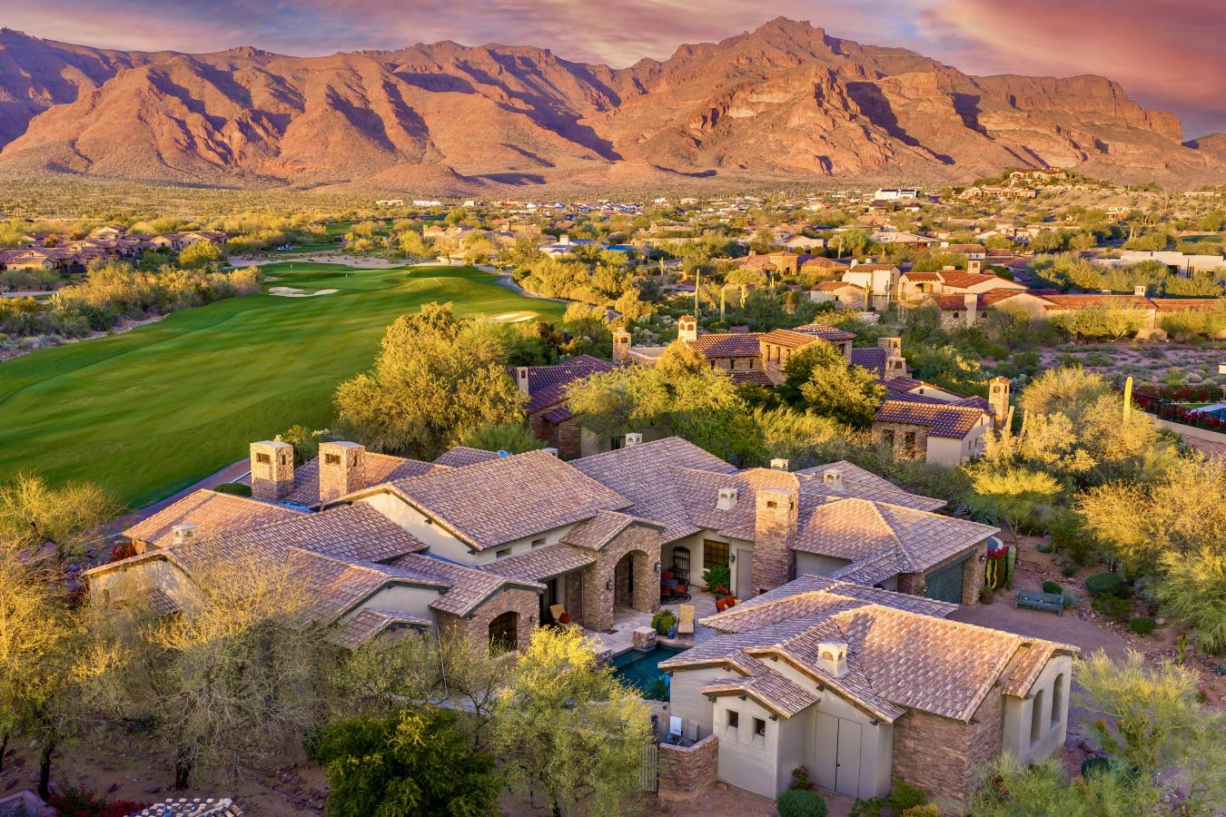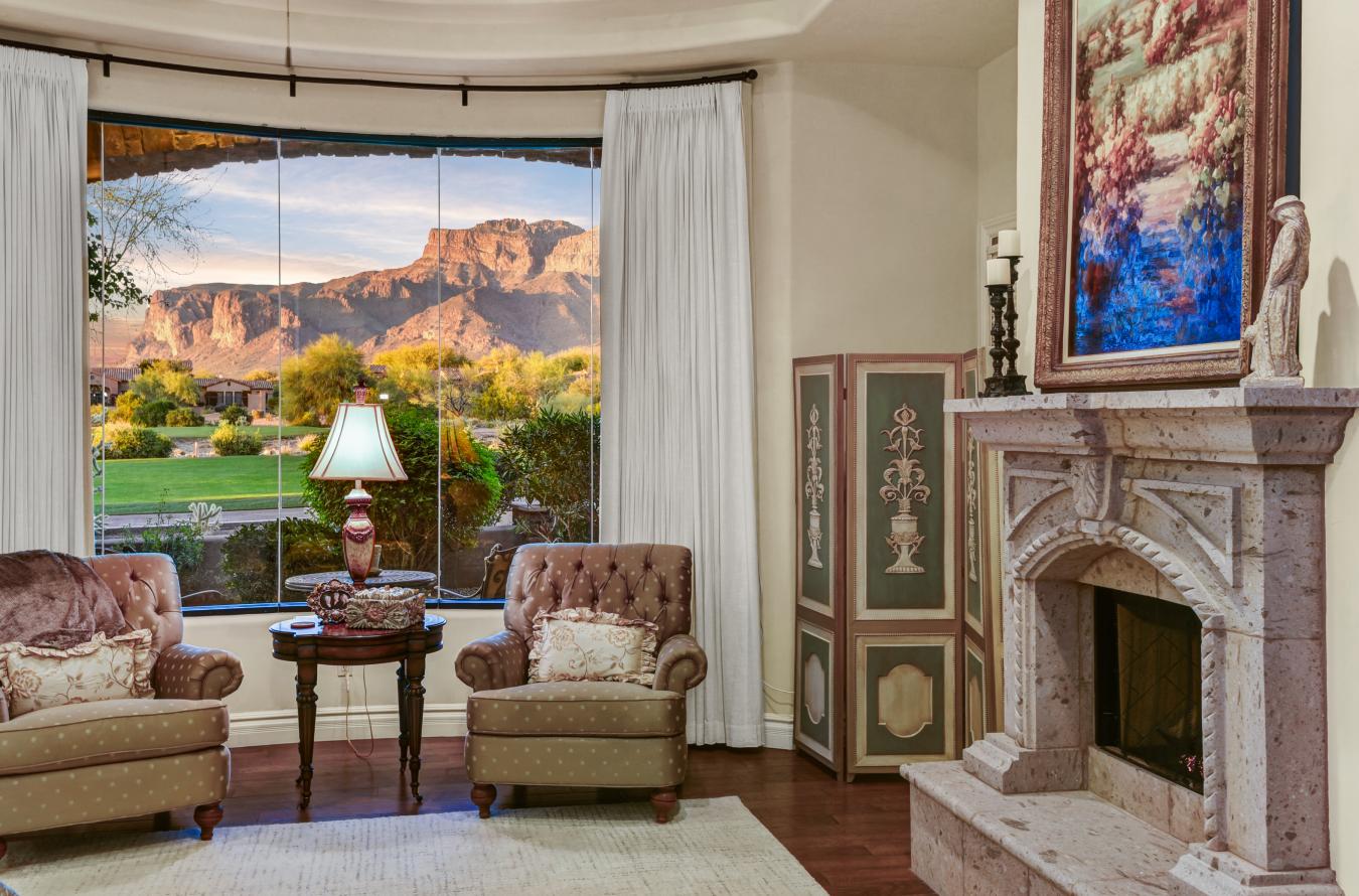 Once in a great while, an exceptional residence becomes available which excels remarkably in all that it has to offer in location, views, timeless architecture, upgraded features & its livability for daily activities & entertaining. OFFERED TURNKEY FURNISHED, this impeccably maintained home features incredible unobstructed views of the Superstition Mountains over 2 fairways of the Lost Gold course. Upgraded Viking appliances, exquisite true craftsman custom cabinetry t/o, light-colored granite counters t/o, designer lighting, ceilings vary from 10 to 19.5 with no two ceilings the same--tongue & grove to wood beams to coffered. Flooring is either wood or travertine. Separate complete guest casita. Heated pool & spa. Gated Lyle Anderson Community w/36 holes of Nicklaus-designed golf. Entire exterior newly painted. Quiet cul-de-sac and no traffic-secluded. All travertine flooring in the home is chiseled edge, all interior doors are 8 solid core, with Emtec hardware; whole house central vac, and stone showers. All bedrooms have ensuite baths with granite counters; all have walk-in closets with buildouts, and ceilings 10 or higher. Clerestory windows provide accents. A delightful sitting area graces the end of a hallway with a lighted art niche. The gourmet kitchen features granite on counters, backsplash, and a large kitchen island with sink. Double wall Viking thermal convention ovens, Viking 6 burner gas cook top with griddle. Side by side stainless 50" Viking refrigerator/freezer. Two brand new dishwashers. The highest quality custom made cabinetry is throughout the entire home. Breakfast bar and a kitchen breakfast nook with wonderful mountain views. Pass through to patio over the kitchen counter to bar style eating on the back patio through a disappearing wall of glass. A walk-in pantry has granite, travertine and a key-drop. Generous formal dining room, 17 x 14, opens to the pool patio, has a coffered ceiling, large buffet server and an entire wall to wall granite countertop as a butlers workstation featuring fine cabinetry and an under counter refrigerator with matching front, and a sink. A separate wine cellar opens to the dining room. Oversized covered back patio is home to a large built-in gas BBQ, cozy fireplace, fountain, and resort style 5 conversation areas, and an enchanting gas fire pit seating area to enjoy the evening sunset glow on the face of the mountain. The great rooms stage is set with the 19.5 vaulted ceiling accented by wood beams and an attractive tongue and grove application. 12 tall sliding glass doors 18 feet wide telescope in the wall allowing (as needed) allowing the back patio and the great room to be joined as one. The architects grand patio cover design perfectly framed the iconic Flat Iron and mast head of the storied mountain. A stately Cantera stone gas fireplace compliments the ambiance of this lovely and comfortable area perfect for family gatherings. A unique coffered ceiling, plantation shutters, and wood flooring create the ideal atmosphere for the polished office, 12 x 11.5, perfect for any executive, which has views of the central pool patio. The grand primary suite has 12 ceilings, wood floors, stunning mountain views, a Cantera fireplace, an exit to a patio, and an extra-large closet with a complete, attractive custom build out. A bar area with granite counters, sink, and refrigerator. A smaller office compliments the primary suite. The bath ensemble has travertine flooring, separate sinks, granite counters, exit to pool, jetted tub, bidet, 2 water closets, snail shower. Split plan bedrooms 1 and 2, from primary suite, have wood flooring, walk-in closets with built-ins and ensuite baths. Bedroom 1 serves as a junior primary with double sinks, large stone shower and a jetted tub. A designer inspired powder room graces the hallway. Upgraded lighting throughout. The resort style large pool terrace separates the main home from the casita. Heated Pebble Tec pool with 6 fountains and a spillover from the heated spa into the pool. The pool area is located on the south side of the main home for winter sun, ideal for winter visitors, and privacy from the golf course. The complete laundry has numerous cabinets, travertine counters, sink, and a built-in ironing board. Garages are oversized with 2 of the bays are as long as 26.5 and 28 long, epoxy floors, abundant storage cabinets and a sink. Gold Canyon is Arizonas best kept secret. Superstition Mountain is the only 36-hole private golf club in all central Arizona, with a limited membership, allowing one of the lowest golfer to course ratios to be found. The golf club has hosted 8 nationally televised tournaments on the LPGA and Champions Tours. The community is only 35 minutes from Sky Harbor and 20 minutes to Mesa Gateway. Only one traffic light separates the members form the Atlantic and Pacific Oceans. Where Else? Nowhere else but here!