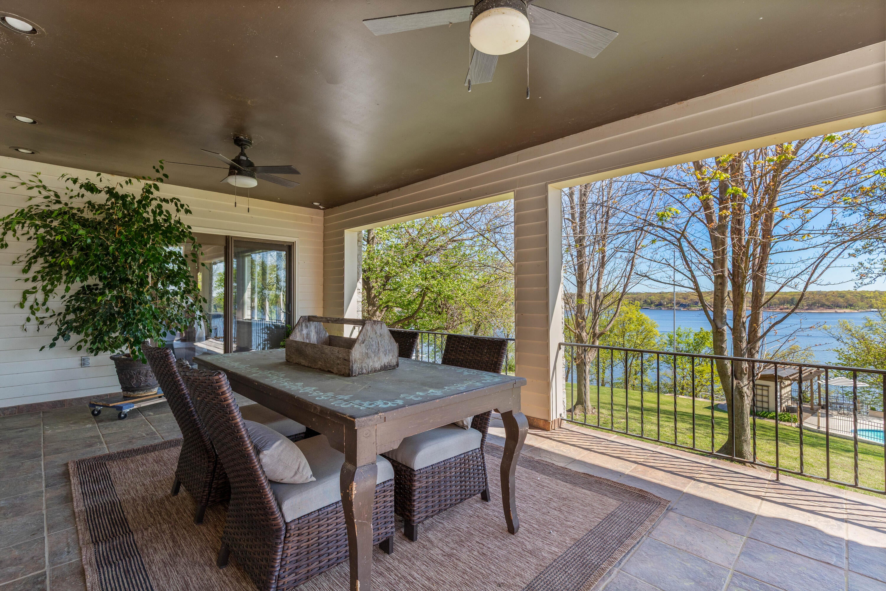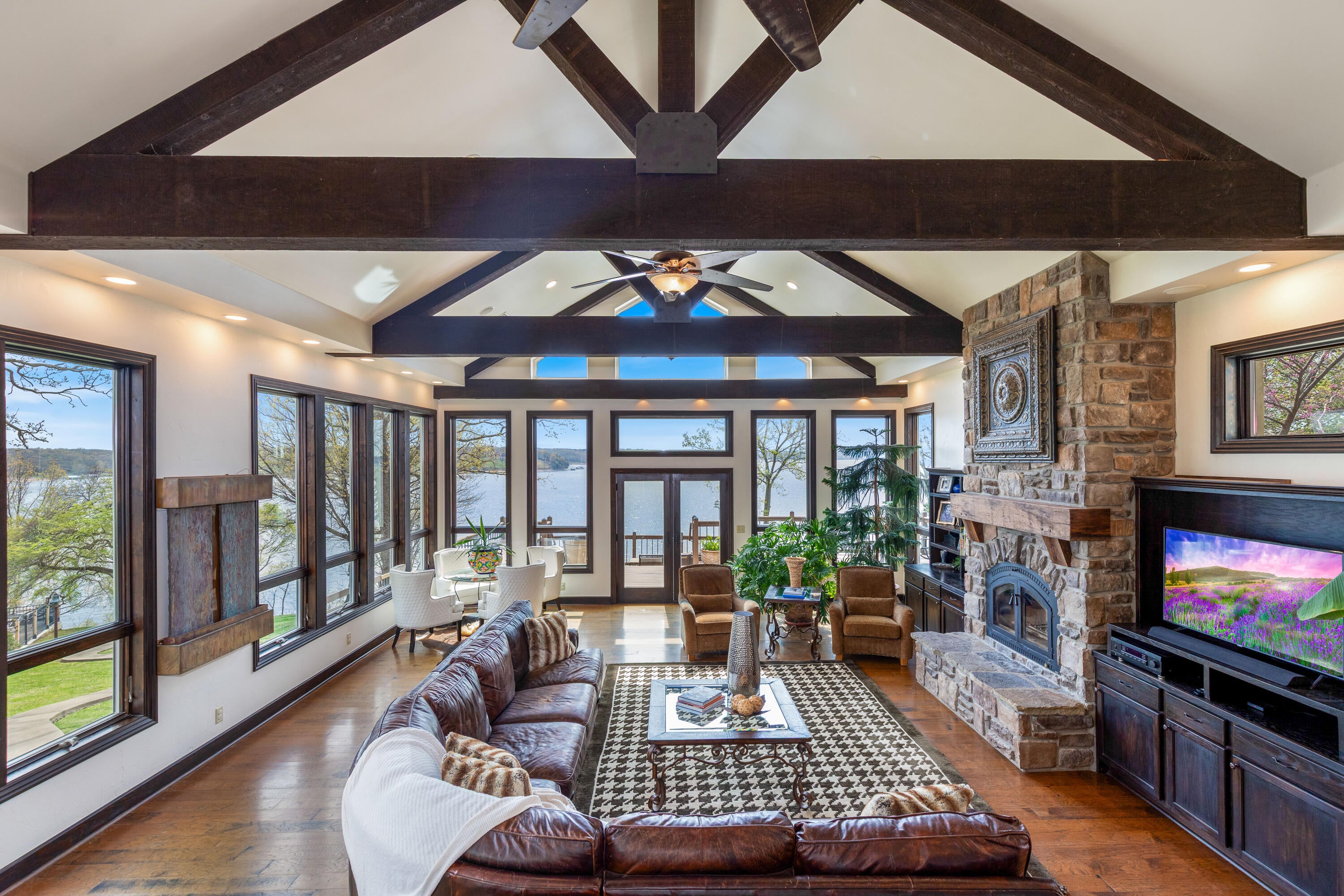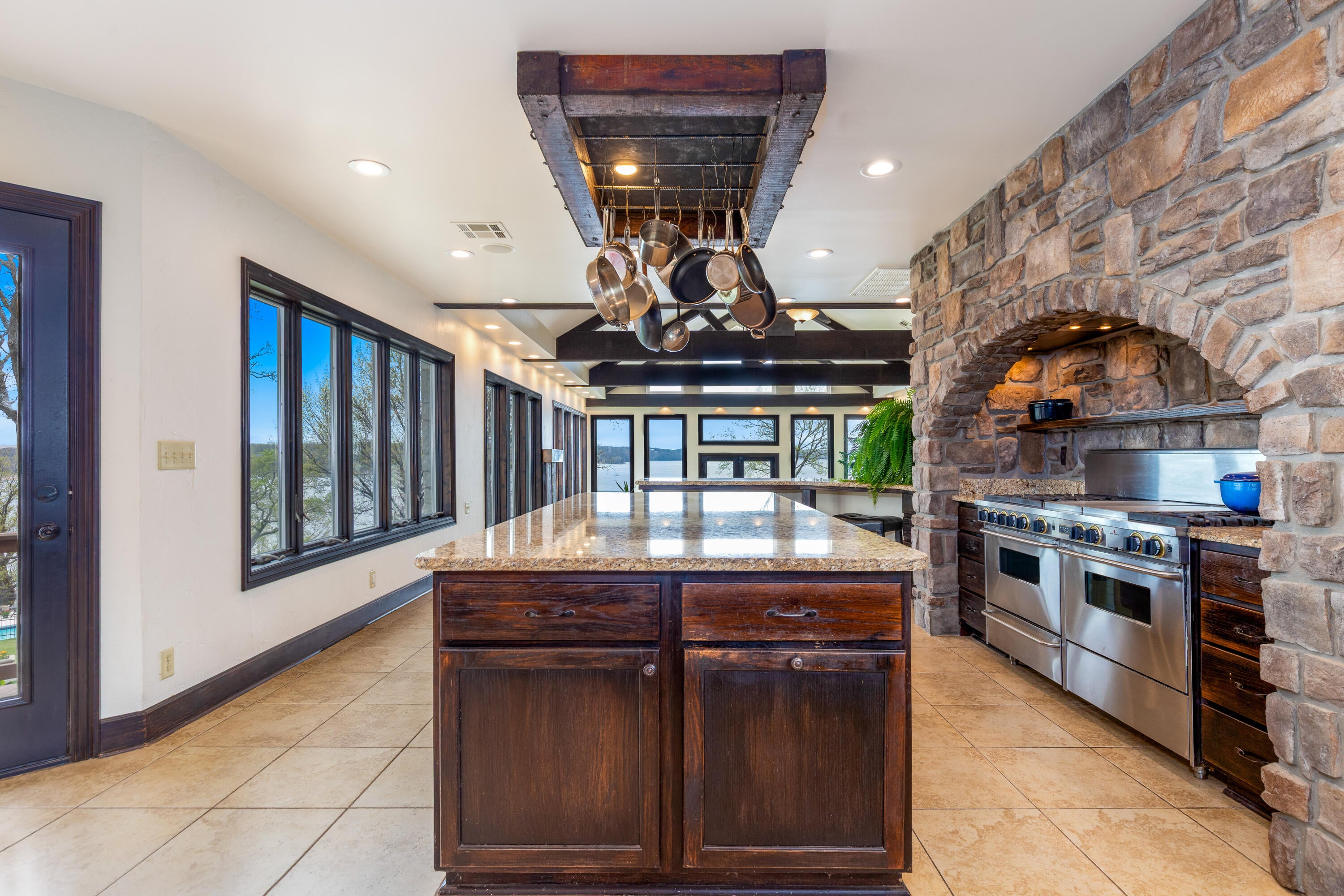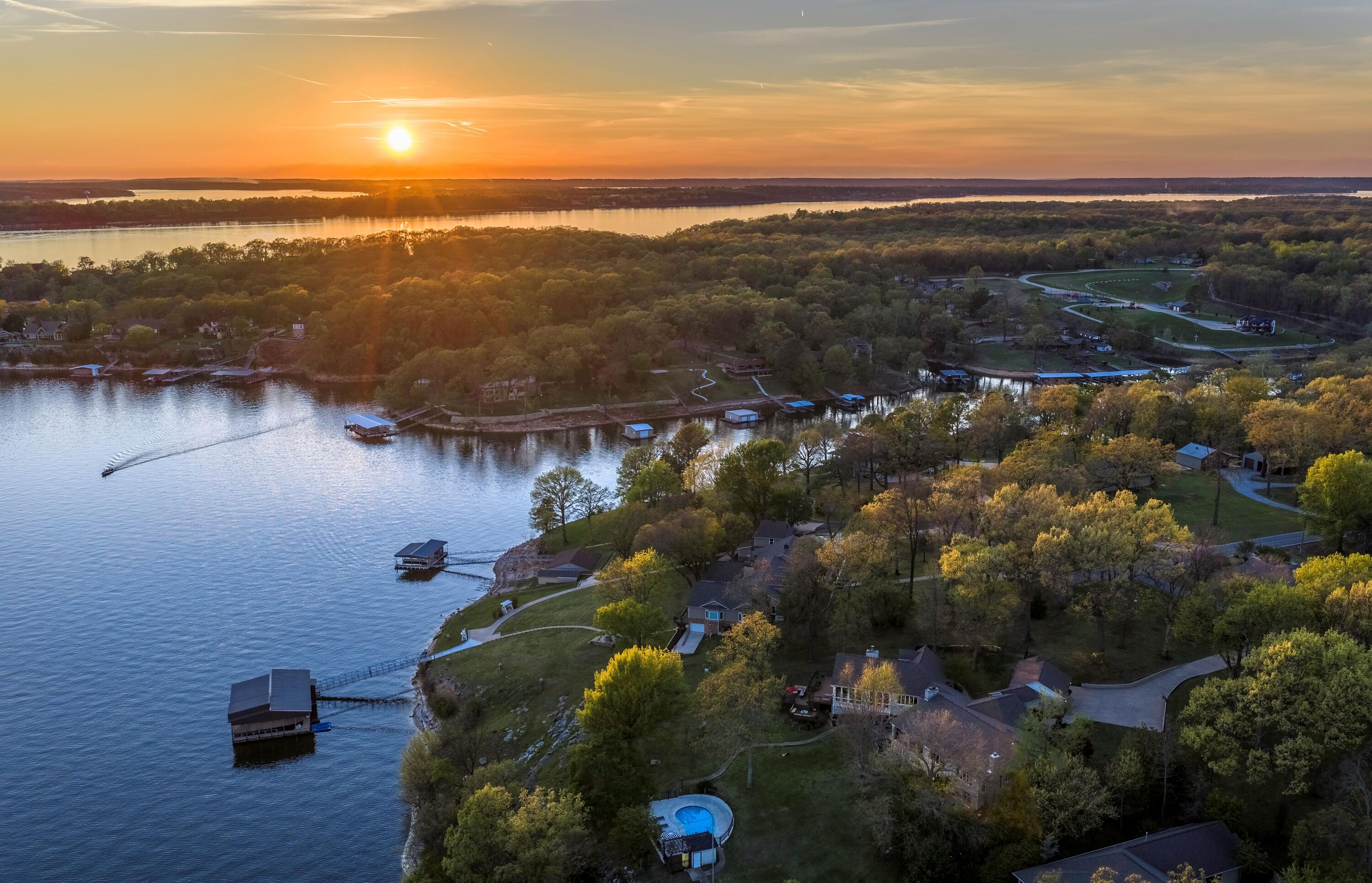 EXCEPTIONAL LAKEFRONT ESTATE on the Honey Creek arm of Grand Lake, offering premier setting, privacy, and resort-style living in Grove, Ok. Situated on 2.3 acres with 227 feet of shoreline,. This stunning 7,500 sq ft walkout style home features a charming natural stone exterior, 5 bedrooms, 6 baths, multiple living areas, media room, and wine room. The newly added Great Room opens to a spacious wood deck with sweeping lake views, complemented by a gourmet kitchen designed for entertaining. Outdoor amenities include an inground pool and private day dock. A 680 sq ft guest house offers 2 bedrooms, 1 bath, and a 2-car carport--perfect for guests. Two additional flex rooms, perfect for providing endless possibilities, whether used as a home office, fitness space, or playroom. Walls of windows capture sweeping lake views, while outdoor living takes center stage with a resort-style pool overlooking the water--ideal for relaxing or hosting unforgettable gatherings.Guests will feel right at home in the charming 2-bedroom, 1-bath guest house, offering comfort and privacy for extended stays.With deep water access in one of Honey Creeks most sought-after locations, this estate is a rare opportunity to own a true lakefront retreat where luxury meets lifestyle.