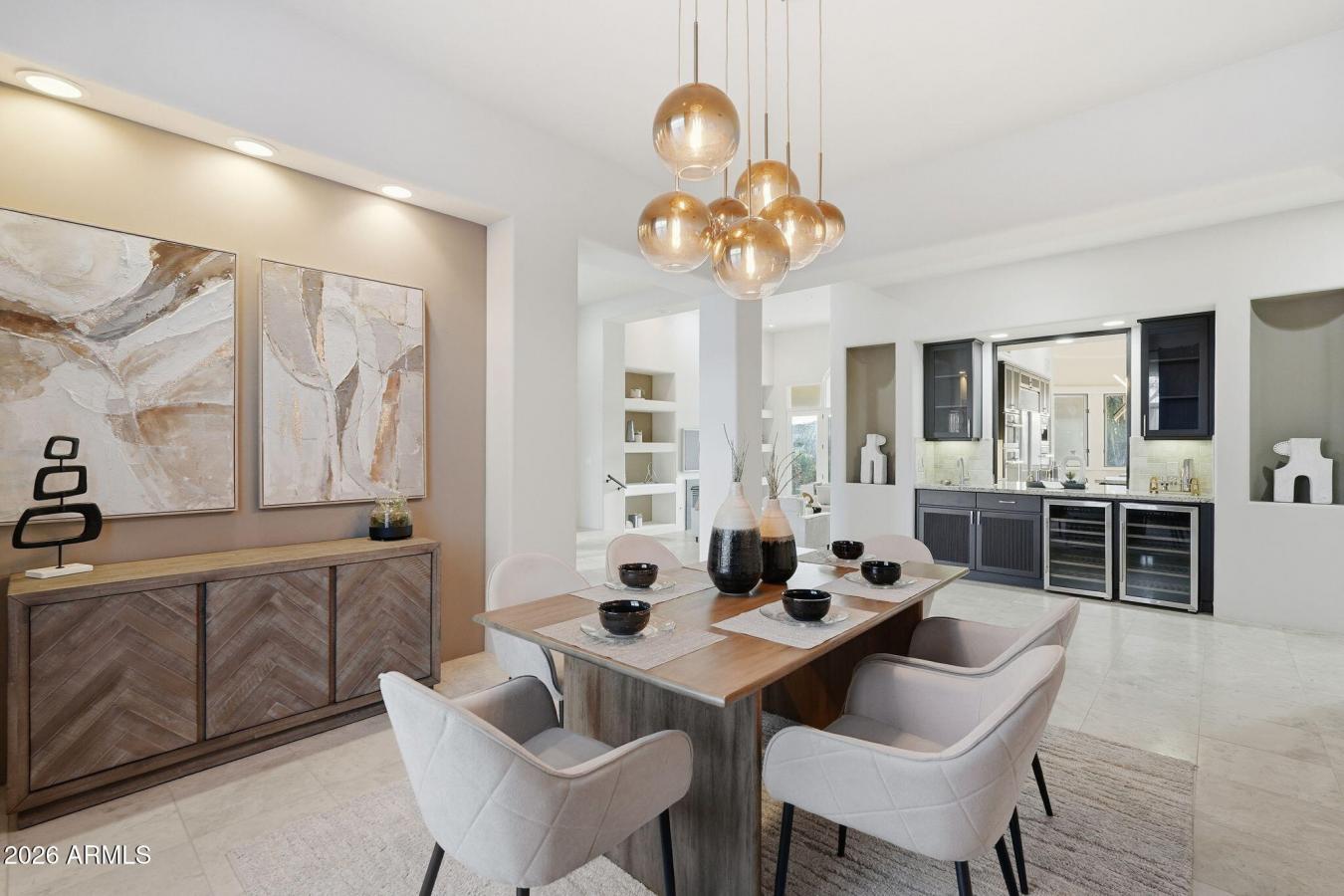 From the moment you enter, stunning hardwood floors and coffered ceilings set the tone for a refined yet inviting atmosphere. The formal dining room, bathed in warm natural light, provides the perfect backdrop for memorable gatherings. Just steps away, a fully equipped bar awaitsan entertainers dream designed for both sophistication and fun.