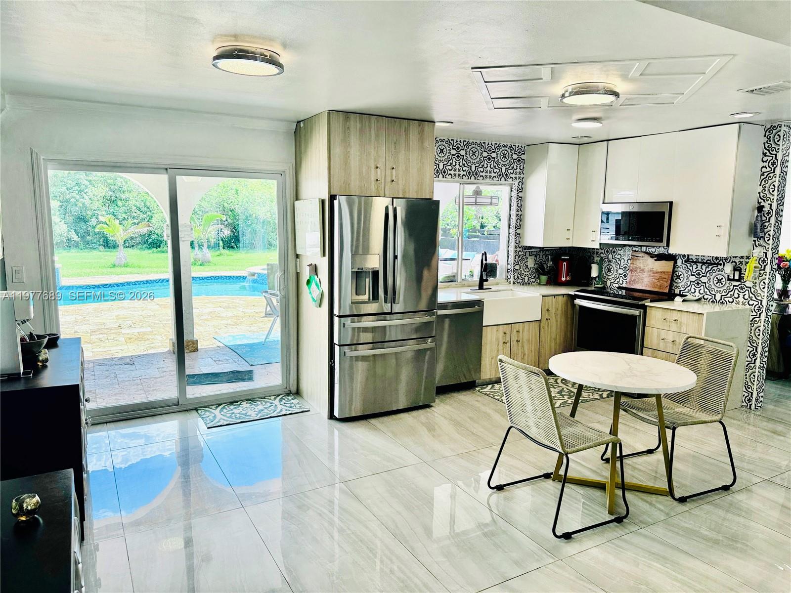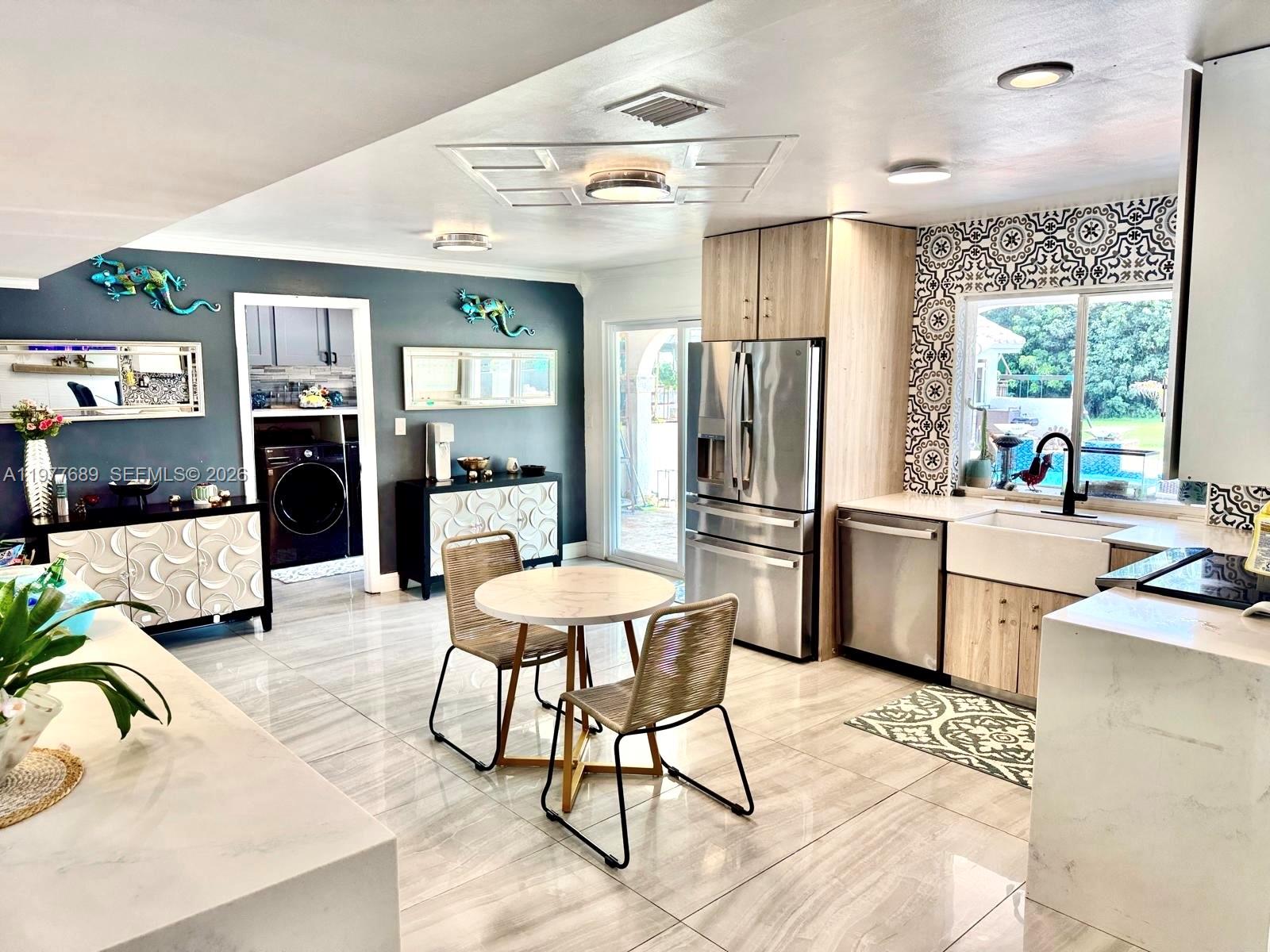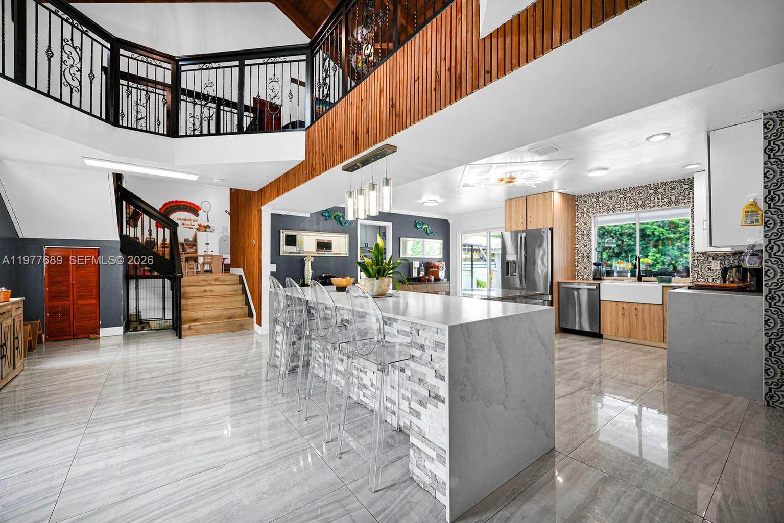 Set on over two landscaped acres in Southwest Ranches, this private estate offers space and privacy rarely found. Renovated in 2021, the residence is defined by 24-foot ceilings in the main living area, oversized 2 x 4 porcelain tile flooring, and a kitchen with custom cabinetry imported from Spain, quartz surfaces, stainless appliances, and a large island for everyday living and gatherings.
