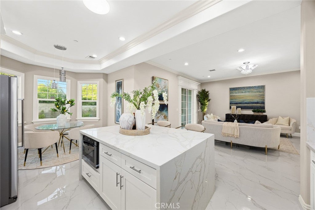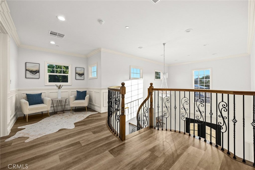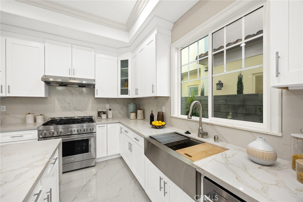 Completely reimagined and meticulously remodeled, this exceptional residence in the highly sought-after Rancho Cielo community of Trabuco Canyon blends luxury, comfort, and modern efficiency. Featuring 5 bedrooms, 3.5 bathrooms, approximately 3,728 square feet, plus a large bonus room and a private library/retreat off the primary suite, this home is designed for both everyday living and entertaining.A custom solid wood front door welcomes you into a beautifully upgraded interior with hardwood flooring, wainscoting, crown molding, plantation shutters, and a striking wrought iron staircase. The chef's kitchen showcases custom double-stacked alder cabinetry, granite countertops, a large center island, Sub-Zero refrigerator/freezer, Bosch dishwasher, six-burner gas cooktop, double ovens with warming drawer, Shaw's fireclay farmhouse sink, under-cabinet lighting, and a butler's pantry. An extended slider creates seamless indoor-outdoor flow.Modern upgrades include solar, new HVAC and ducting, dual-pane windows, NEST climate control, Simply Safe security, built-in speakers, recessed lighting, and ceiling fans throughout. The primary suite offers a fireplace, spa-inspired bath with dual-head shower, and a private balcony with glass panels to capture sweeping views. Additional fireplaces in the dining and family rooms add warmth and charm.The backyard is a true retreat with a custom-tiled pool, paver decking, built-in BBQ island, and covered patio with shiplap ceiling, lighting, fans, outdoor TV, and drop-down shades. Professionally landscaped with synthetic turf, olive tree, lighting, glass fencing, and smart irrigation.Ideally located near Santa Margarita Lake, top-rated schools, scenic trails, and golf, this home offers incredible sunset views with ocean glimpses on clear days and views toward the Palos Verdes hills.