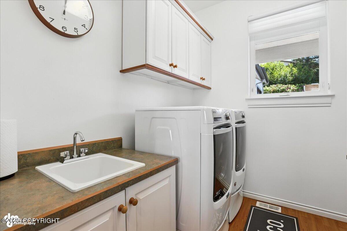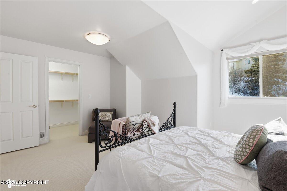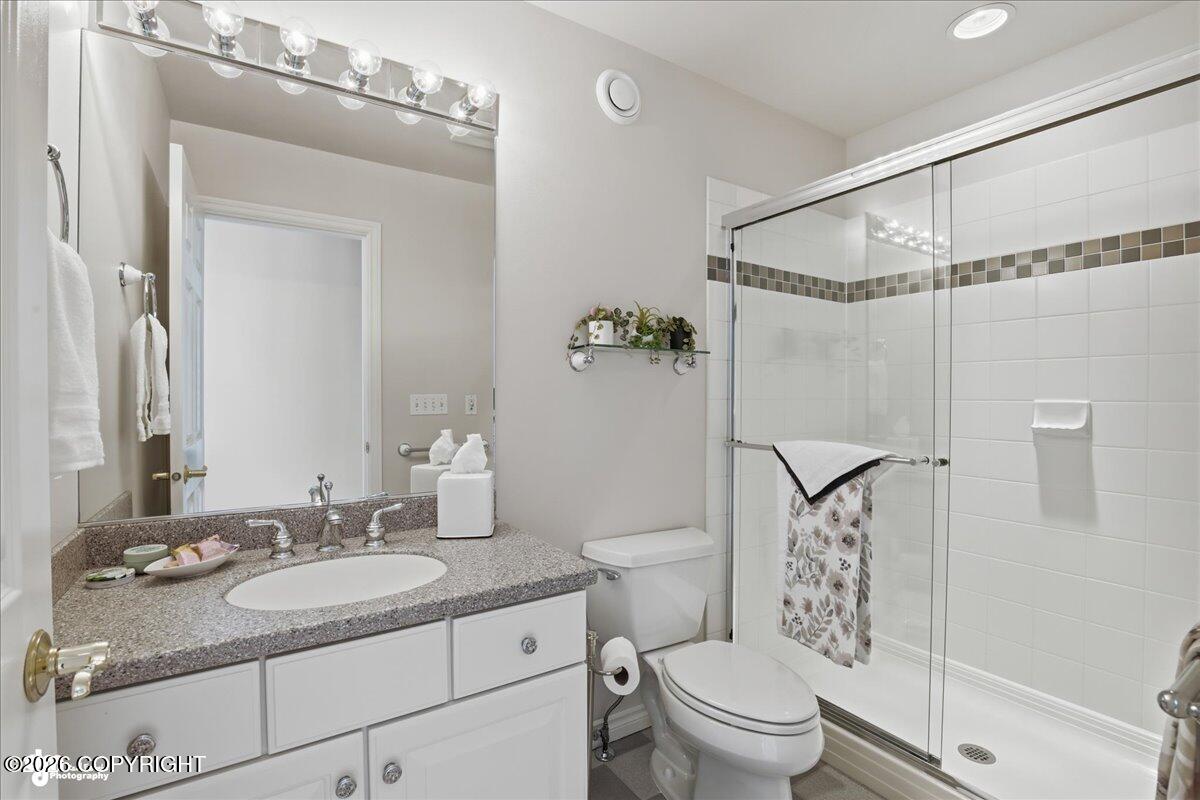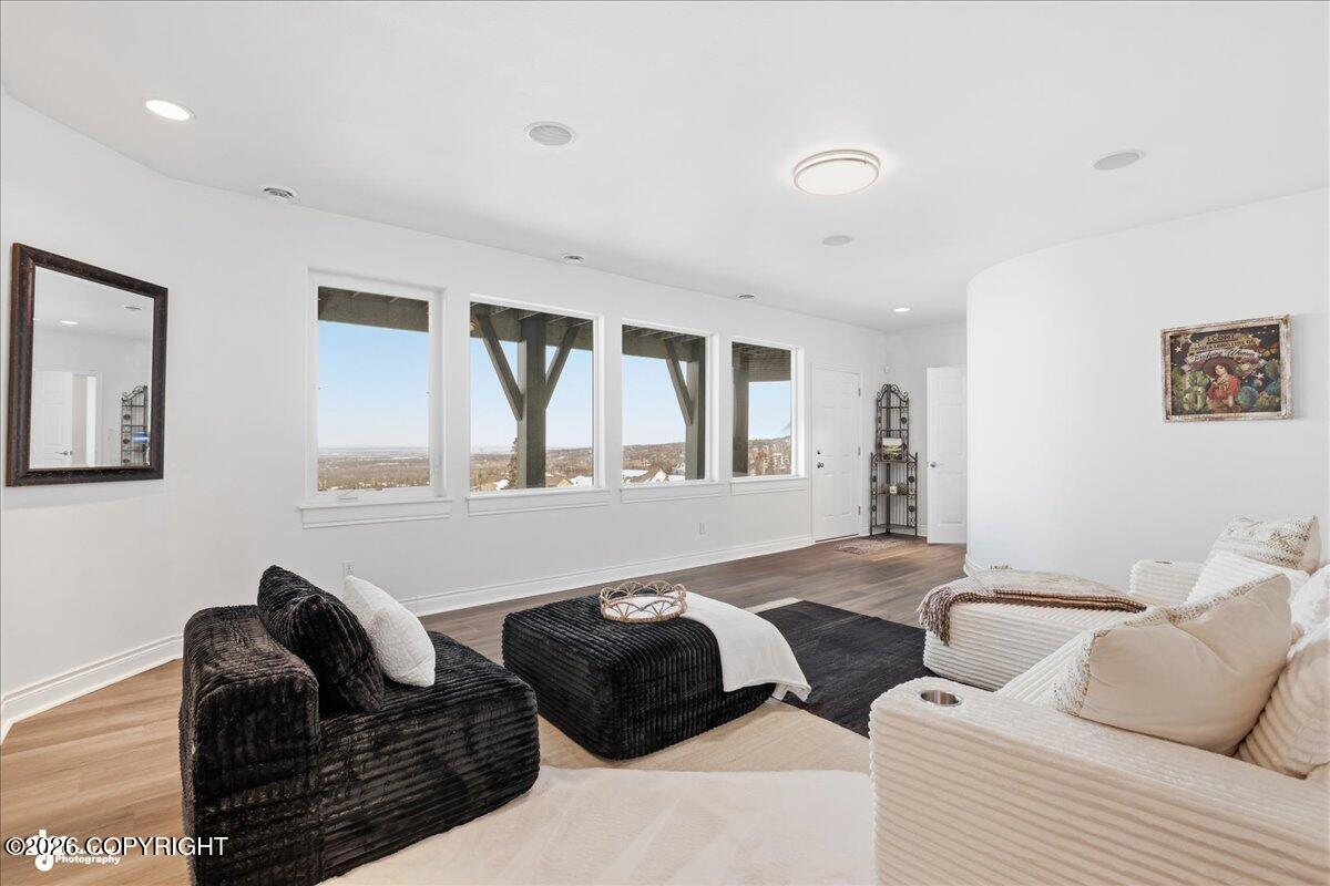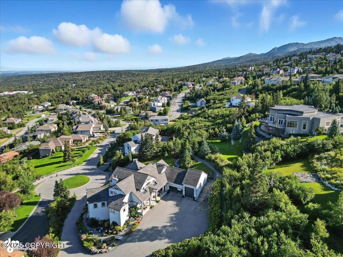 Situated at the end of a peaceful cul-de-sac, this beautifully designed Crown Pointe home offers exceptional living inside and out. With over 10 parking spaces, a gravel pad for RV parking or snow storage, and professionally landscaped grounds featuring extensive rockwork and perennial gardens, every detail has been thoughtfully planned. Inside, the chefs kitchen is the heart of the home,boasting a 48 Wolf 6-burner gas range with griddle and double ovens, Sub-Zero refrigerator, two large islands, and cherry DeWils cabinetry. The main floor features 10-foot ceilings, formal living and dining rooms, custom cherry built-ins at every turn, and three gas fireplaces for added warmth and ambiance.The primary suite has its own fireplace, a spa-like ensuite with granite counters, frameless glass shower with custom tiled walls, a jetted tub, and unmatched 180-degree views of Denali and the Alaska Range. There is also private access to the large Trex deck where you will enjoy western sunsets.A wheelchair-accessible mother-in-law suite includes a private deck, kitchenette with Sub-Zero fridge and built-in microwave--ideal for extended guests or multi-generational living.The 2,100 sq ft basement has been finished with all new LVP flooring and includes one bedroom, two bathrooms, a storage room, and two large flex rooms--perfect for a home theater, gym, or recreation space.Additional highlights include radiant in-floor heat (including garage), air conditioning, Guardian security system, whole-house audio, updated heating system with HRV air recovery system.