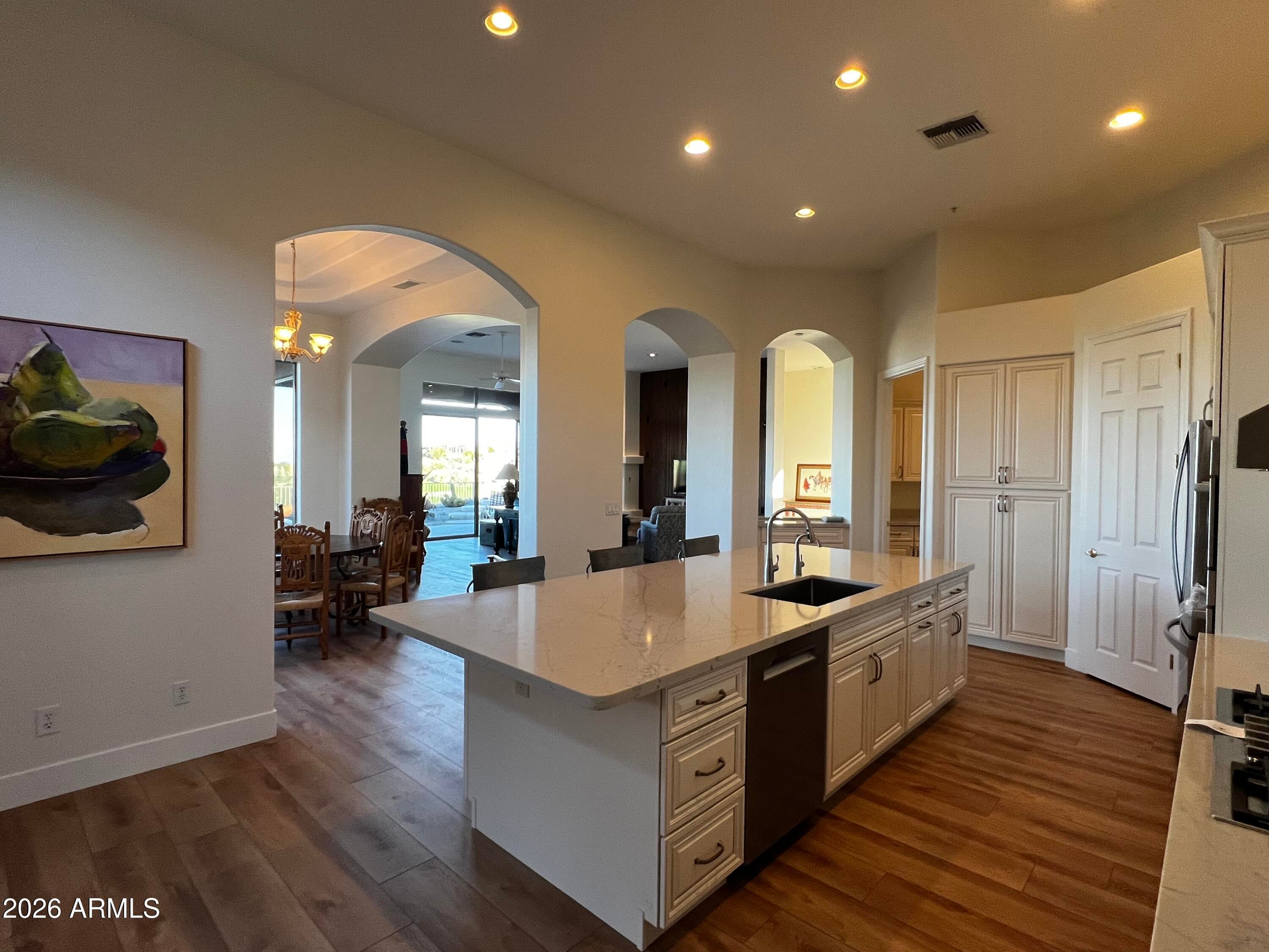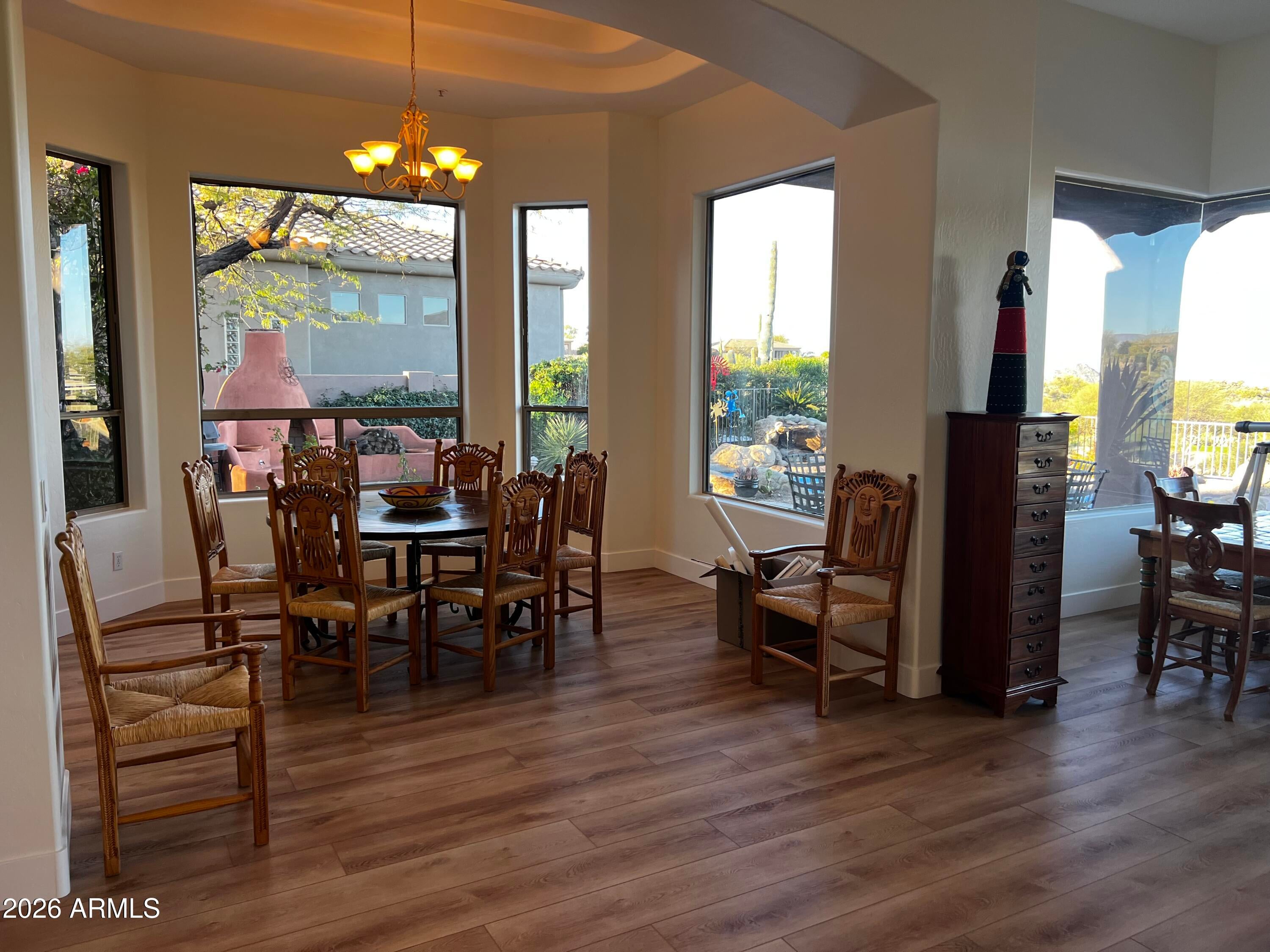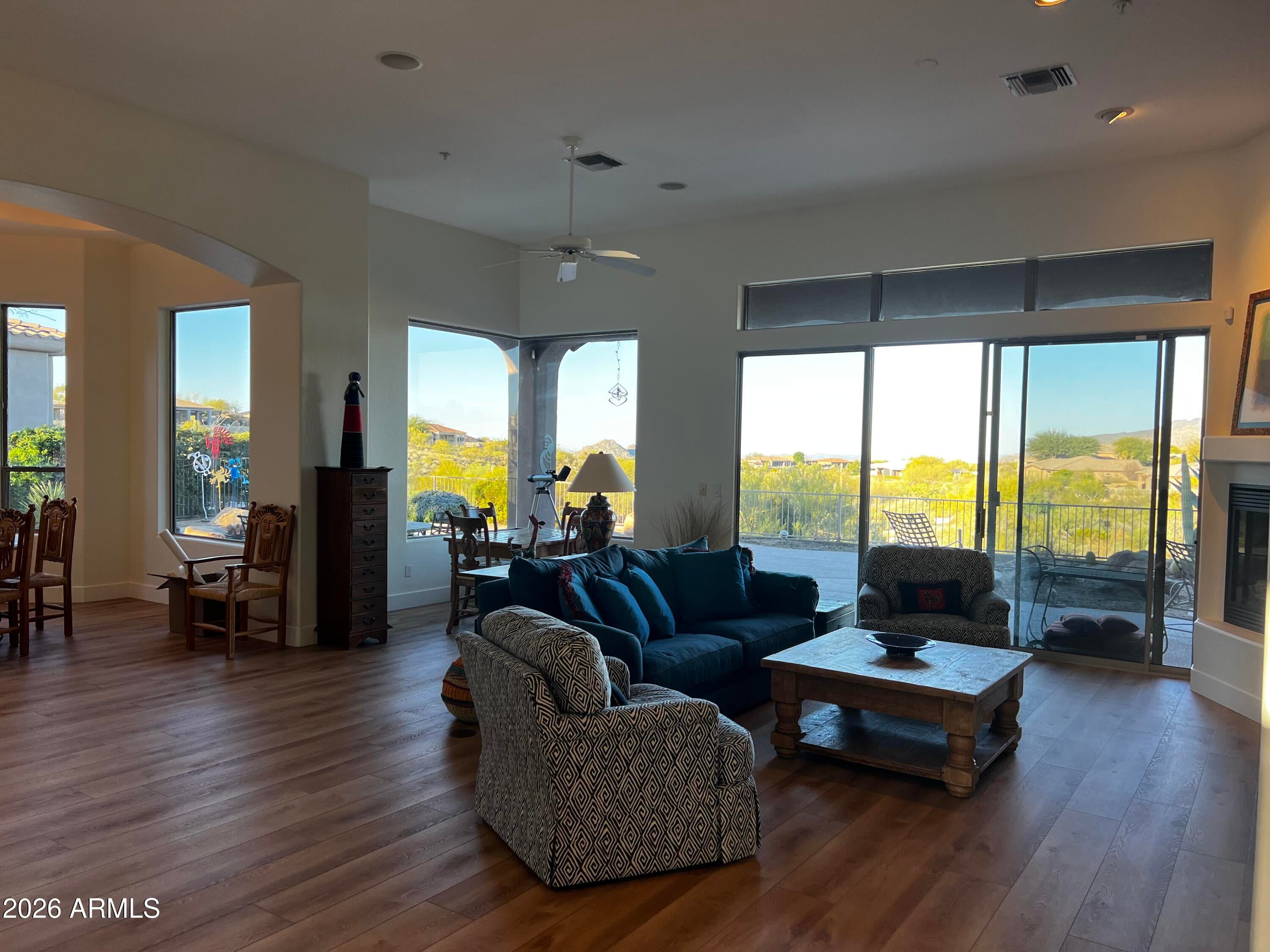 WELCOME HOME to LEGEND TRAIL where youll enjoy Sweeping golf course, mountain & sunset vistas! This 3032 sq ft GREAT ROOM design features 3 bedrooms incl a guest casita, den, 3.5 baths, plus an art studio/fitness room! Enjoy the dramatic great room with expansive walls of glass that captures jaw dropping, elevated views of the golf course! Beautifully updated with brand new kitchen, luxury vinyl flooring, updated roof and HVAC! The open flow design seamlessly merges indoor and outdoor living by allowing natural light to flood the vaulted ceiling space! Outdoor resort with pool, spa, kiva fireplace and large wrap around patio! Legend Trail offers first class amenities incl golf, fitness ctr, pickleball and access to miles of hiking and mountain biking trails on the Sonoran MM Preserve
