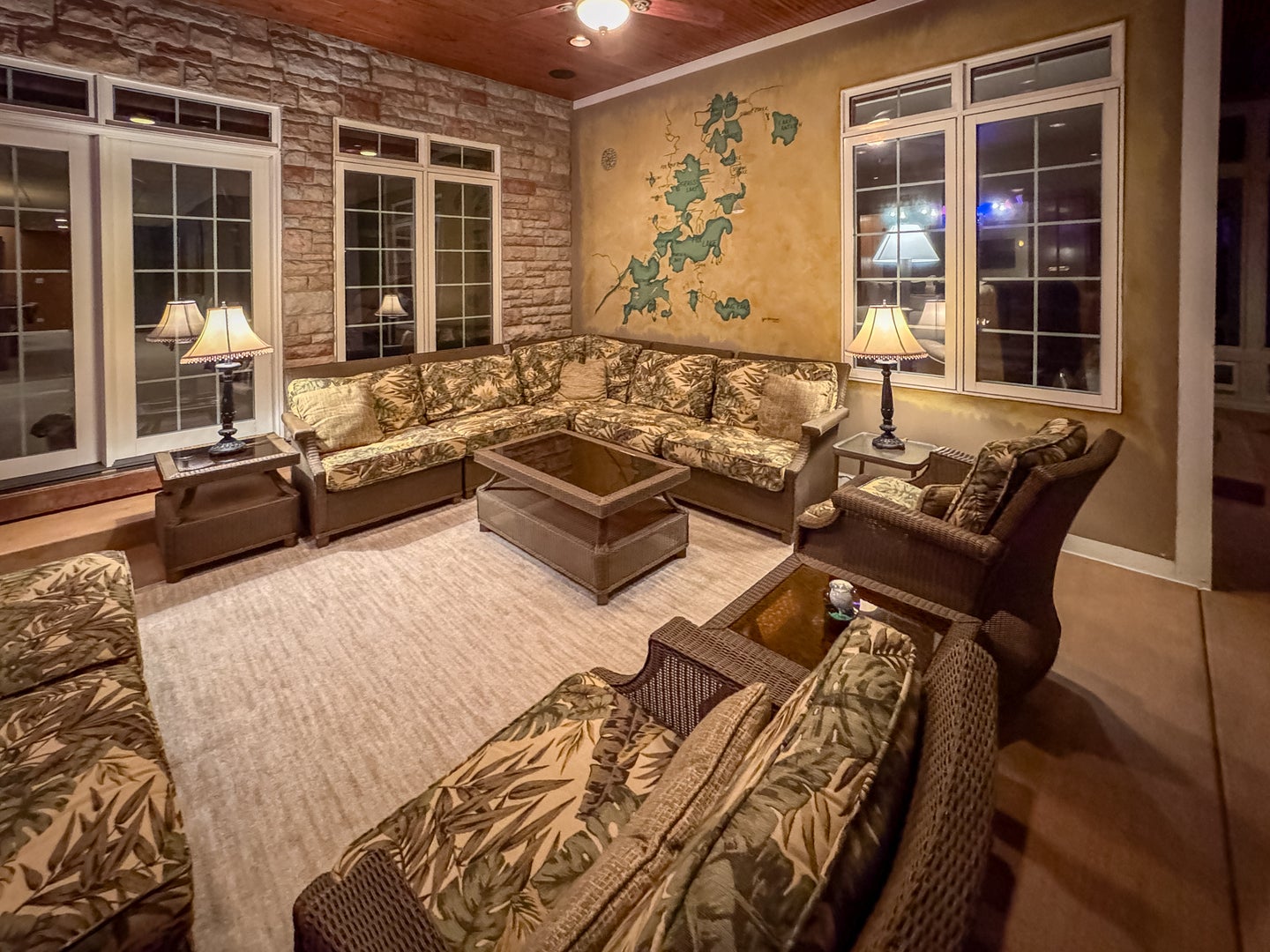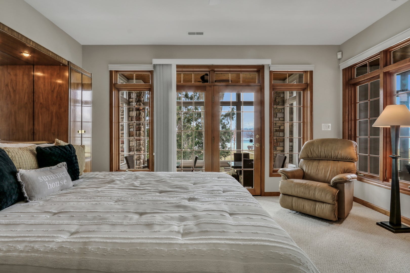 Welcome to this custom-built lakefront home on Petite Lake, offering stunning panoramic views and seamless indoor-outdoor living on a 0.433-acre lot. Rare opportunity to own a lakefront home featuring a walkout lower level with level,easy access to your private pier-no step terrain or exterior stairs, a true standout among lakefront properties. Custom-designed to capture beautiful lake views while enhancing the comfort and ease of lakefront living. The stone-accented exterior features multiple patios, a lakeside deck, and enclosed porches-ideal for entertaining and relaxing. Inside, the two-story great room showcases a floor-to-ceiling fireplace and a wall of windows overlooking the lake. The open-concept kitchen includes a large island, abundant cabinetry, and flows into the dining and living areas. Main-level primary suite features dual walk-in closets, spa-like bath with whirlpool tub and Opulent spa shower with body jets, direct laundry access, and a private three-season porch. Upstairs offers two bedrooms, full bath, and loft. The walkout lower level includes a large recreation room with fireplace, an additional three-season porch, and a fourth bedroom-perfect for guests or extended stays. Recent updates include two Trane furnaces with humidifiers (2024). This turnkey opportunity includes pier, all appliances (including additional lower-level units), TVs with surround sound, outdoor and porch furniture (Lloyd Flanders), pool table, basketball game and gas grill. Opportunities like this-combining level lake access, panoramic views, and a custom designed home-are rarely available on the Chain OLakes, let alone Petite Lake. Schedule your private showing today and experience lakefront living at its finest.