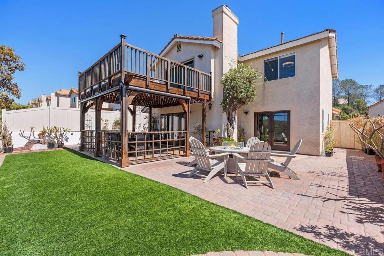 A rare water view and sunset backdrop distinguish this Camino Bernardo residence, offering one of the most coveted settings in Rancho Bernardo. Overlooking the water and the tranquil trails of Black Mountain Open Space Reserve, the home enjoys a refined sense of privacy, natural beauty, and serenity, all while remaining close to premier schools, shopping, dining, and convenient commuter access. Inside, the home is beautifully maintained and thoughtfully designed, with a spacious living room, an inviting dining area, and a bright family room that opens to the kitchen and lanai. The layout is comfortable and functional, creating an easy flow for everyday living and entertaining. Central A/C adds year-round comfort, and the attached two-car garage features epoxy flooring and built-in storage. The upper Brazilian wood deck offers a quiet retreat with beautiful water views, ideal for morning coffee, sunset watching, or simply taking in the peaceful surroundings. Below, the backyard is designed for entertaining and gathering, with a covered lanai, recessed lighting, drought-tolerant landscaping, and multiple seating areas that create a welcoming outdoor extension of the home. Residents of Camino Bernardo enjoy resort-style amenities including a pool, spa, clubhouse, and tennis courts. Nearby Turtleback Elementary, Bernardo Heights Middle, and Rancho Bernardo High further enhance the appeal, along with easy access to scenic recreation in Black Mountain and beyond. This is a rare opportunity to experience a truly special Rancho Bernardo lifestyle.