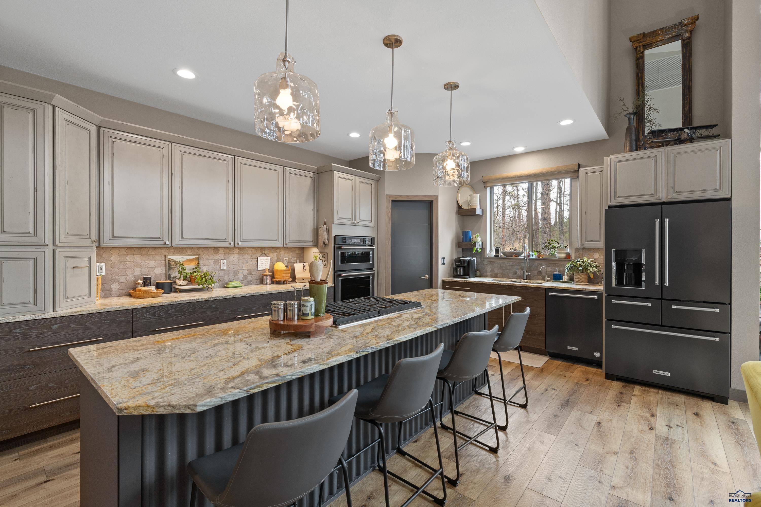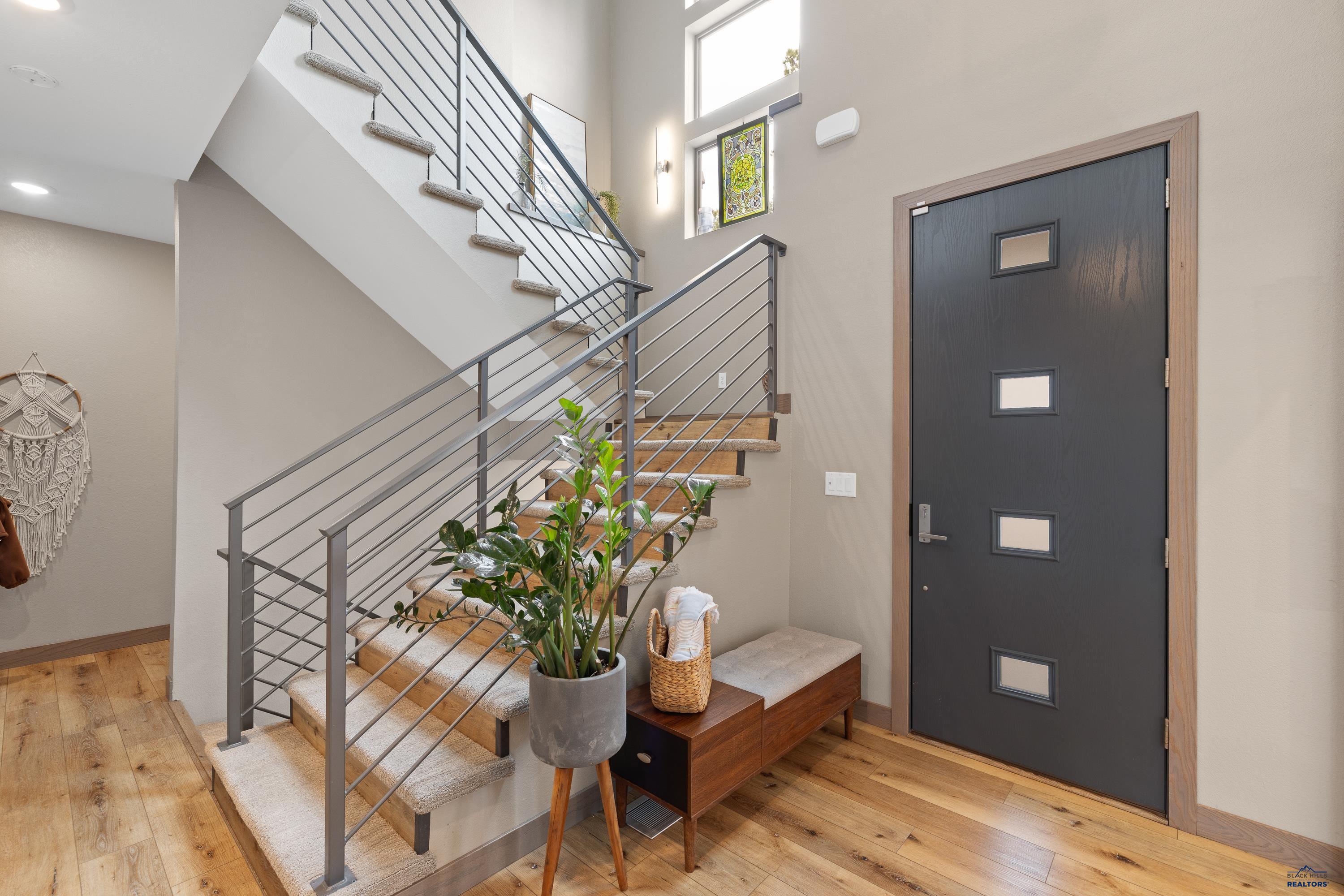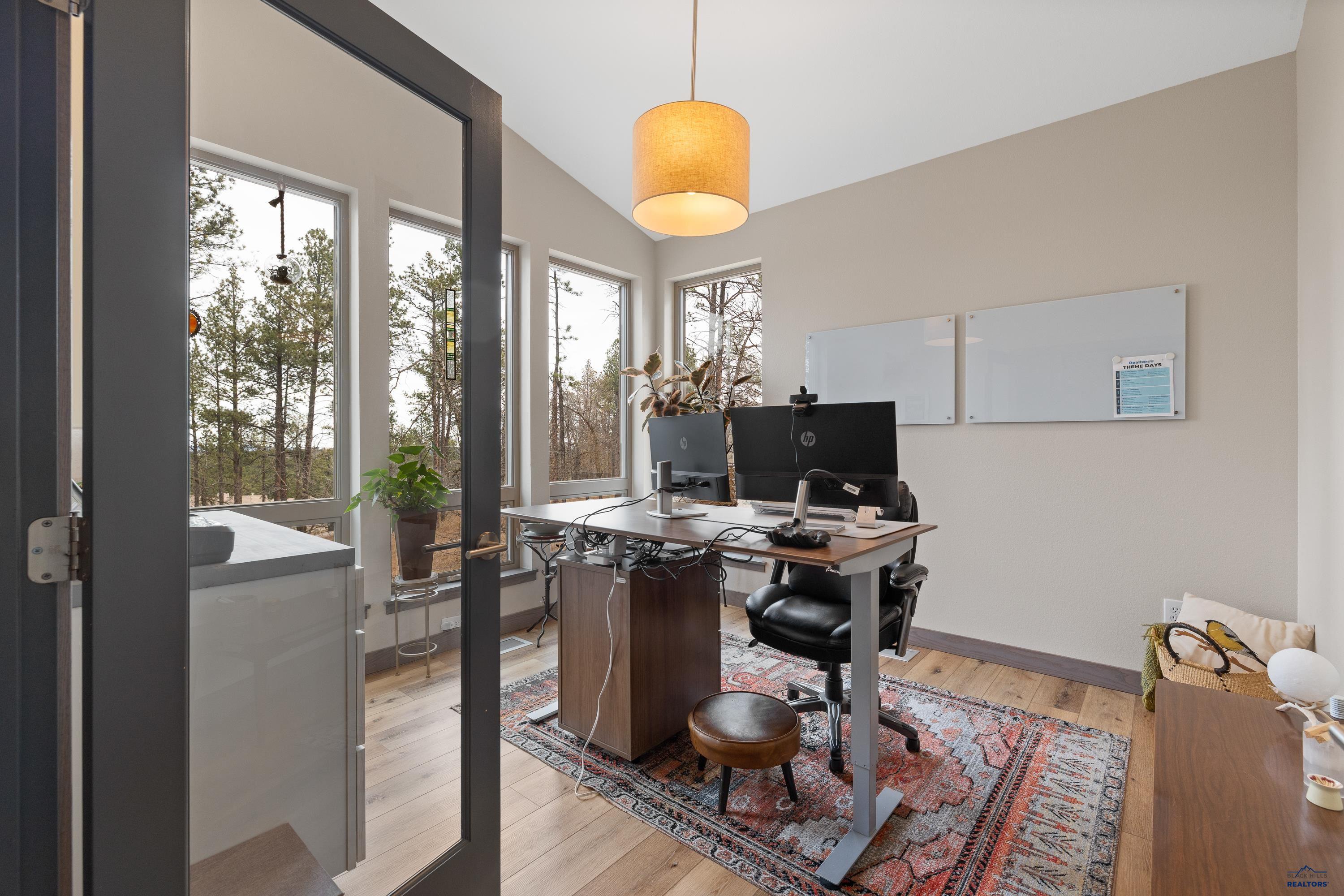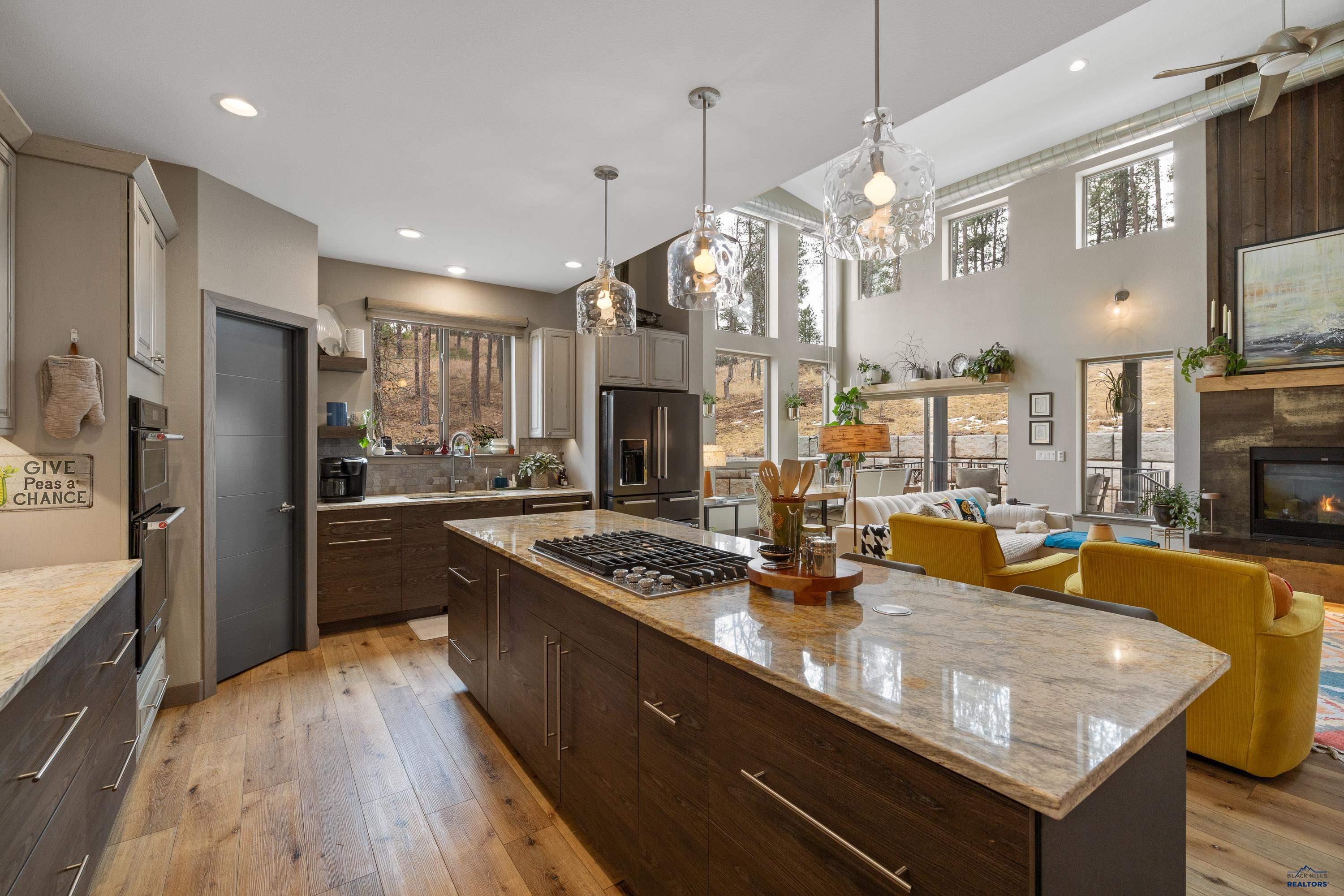 Lets start with the showstopper: a MASSIVE 51x31 attached oversized heated garage/shop with in-floor heat, its own half bath, and dog wash station. If you need serious space for vehicles, hobbies, projects, or outdoor gear, this is it. Two 9 overhead doors with 710 clearance plus a 12 door offer excellent height for trucks, trailers, and toys. Set on 1.97 acres surrounded by mature pines in the paved Copper Oaks Subdivision, just 10 minutes from Rapid City, this striking 1.5-story home is designed to capture the setting. Walls of windows frame pine views and flood the home with natural light, while exposed ductwork and modern architectural detail give the space a distinctive edge. The kitchen is anchored by a statement island with a gas cooktop that keeps you at the center of it all, along with double wall ovens and stainless steel appliances. Its built to perform and designed to gather, flowing seamlessly into the living and dining areas. The dining area is bright, open, and positioned to take in the views, with direct access to the covered patio for effortless indoor-outdoor living. The primary suite is a true retreat with soaring ceilings, a large window that brings the outdoors in, and a layout that easily accommodates a king bed plus seating. The ensuite bath delivers spa-like comfort with a walk-in tiled shower with glass surround, deep soaking tub and heated floors. Also on the main: a dedicated office with killer views, and a functional mudroom and laundry area. Upstairs, an open loft overlooks the main level, along with two bedrooms and a full bath. Step outside to a covered patio tucked into the pines with a natural hillside backdrop. The finished basement adds flexibility with a 2nd kitchen, large family room, two bedrooms, and a full bath. An additional 25x16 shed provides extra storage for tools, gear, or seasonal items. You have to see this one for yourself: Call for your private tour!