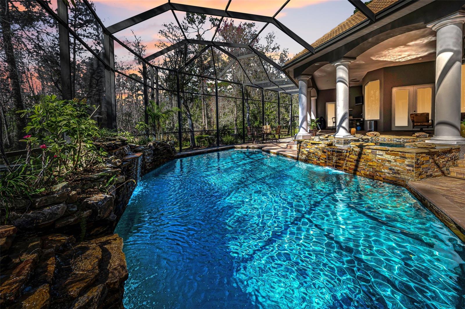 Welcome to this exceptional 5-bedroom, 4-bath luxury estate in the highly desirable Aristida community, offering over 4,300 square feet of living space on a private 2.73-acre conservation lot. Nestled at the end of a quiet cul-de-sac, this custom home delivers the perfect blend of privacy, nature views, and convenience just minutes from top-rated schools, shopping, dining, medical facilities, and Starkey Market in the Trinity/Odessa area. Impressive curb appeal begins with dual brick paver driveways, a grand double-door entry, and an elegant tile roof. Inside, youll find tile flooring throughout the main living areas, crown molding, tray ceilings, decorative niches, and a fireplace in the formal living room. A separate dining room, spacious family room filled with natural light, and a dedicated office create an ideal layout for both everyday living and entertaining. The chefs kitchen features quartz countertops, stainless steel appliances, glass cooktop with custom range hood, center island, breakfast bar, oversized walk-in pantry, and a bright breakfast nook overlooking the pool. Just off the family room, the private media/theater room with stadium seating offers the ultimate at-home movie experience. An attached in-law apartment with a private porch provides flexible multigenerational living or guest accommodations. French doors open to a resort-style outdoor living space designed for entertaining, complete with a paver pool deck, sparkling pool and spa, stacked stone water features, and a fully equipped outdoor kitchen with granite counters and stone accents. The outdoor amenities continue with a firepit seating area, basketball court, and ample space to add pickleball or other recreational features. The expansive primary suite is a private retreat with a sitting area, spa-like bath featuring a jetted tub, walk-in tile shower, dual vanities with makeup station, and large walk-in closets. Additional highlights include freshly painted bedrooms, an oversized 4-car garage with newly sealed floors, and breathtaking conservation views throughout the property. This is a rare opportunity to own a one-of-a-kind custom estate with luxury upgrades, acreage, and unmatched privacy in one of the areas most sought-after communities. Schedule your private showing today.