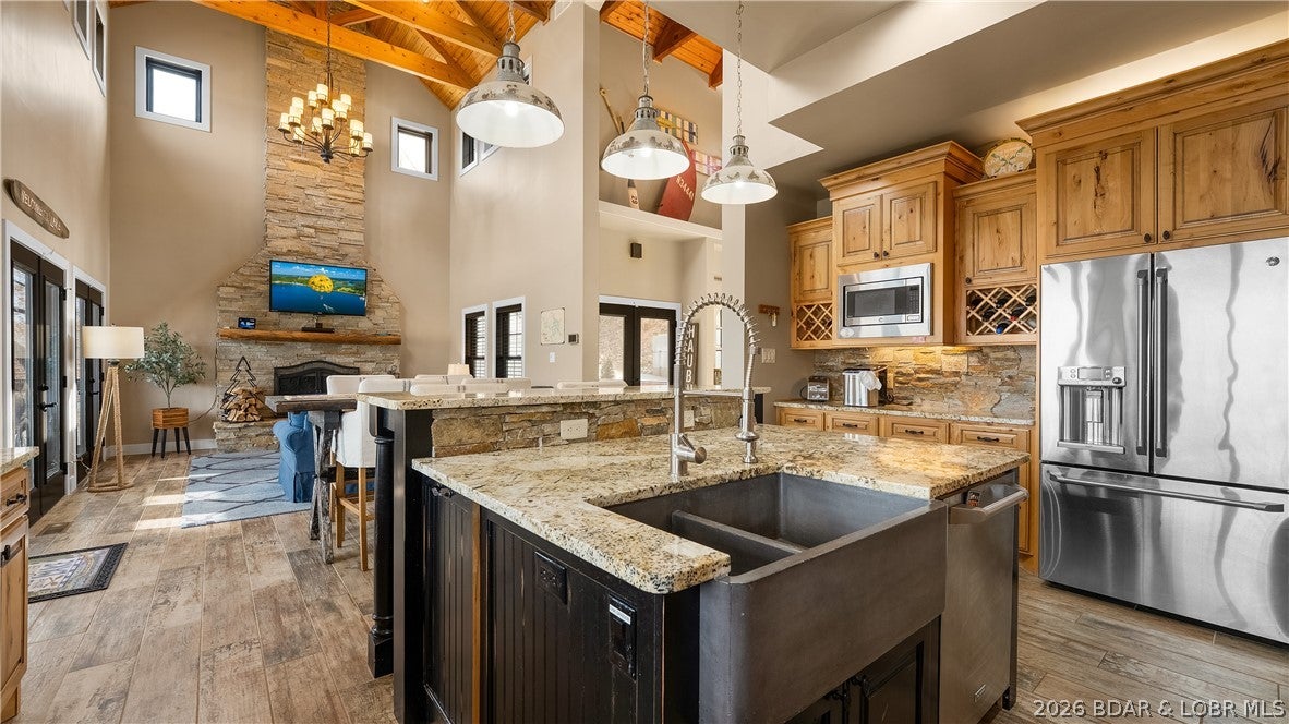 Private lakefront estate at the 55MM of the Osage. Set on 1.75 acres with an incredible 483 of shoreline, this furnished 6 bedroom, 5.5 bath retreat delivers privacy and space rarely found at the lake. Built in 2017 with nearly 3919 sq ft, the home was designed for gathering and entertaining with soaring two-story ceilings, and a dramatic stacked stone fireplace anchoring the open living area.