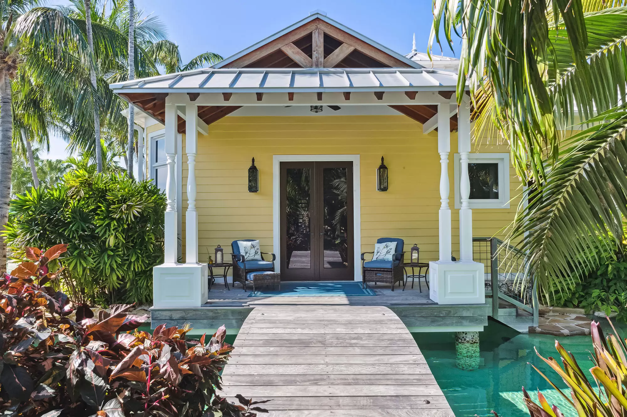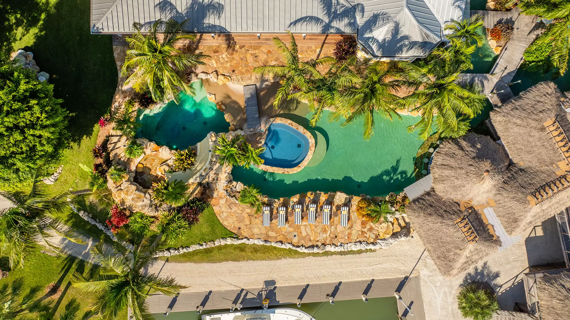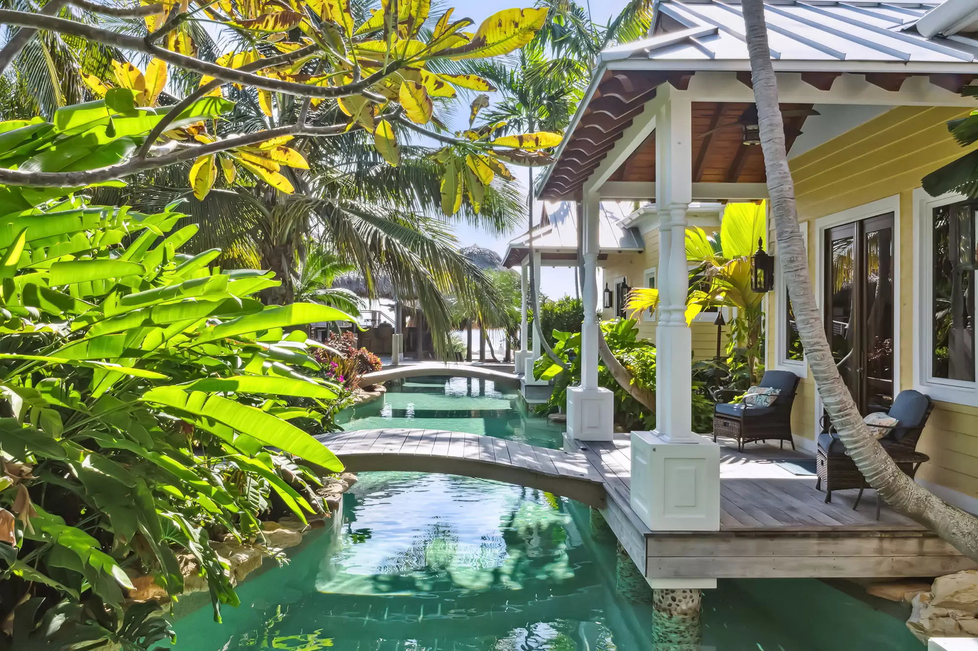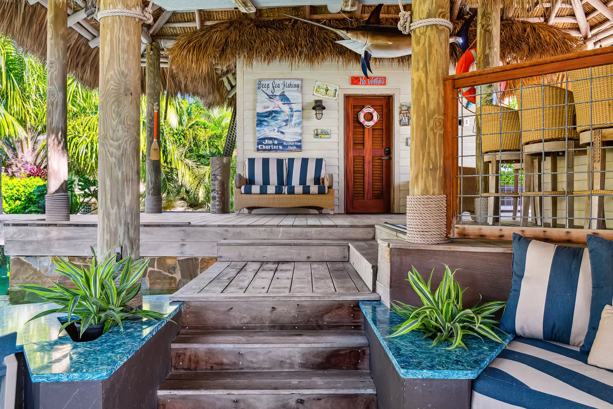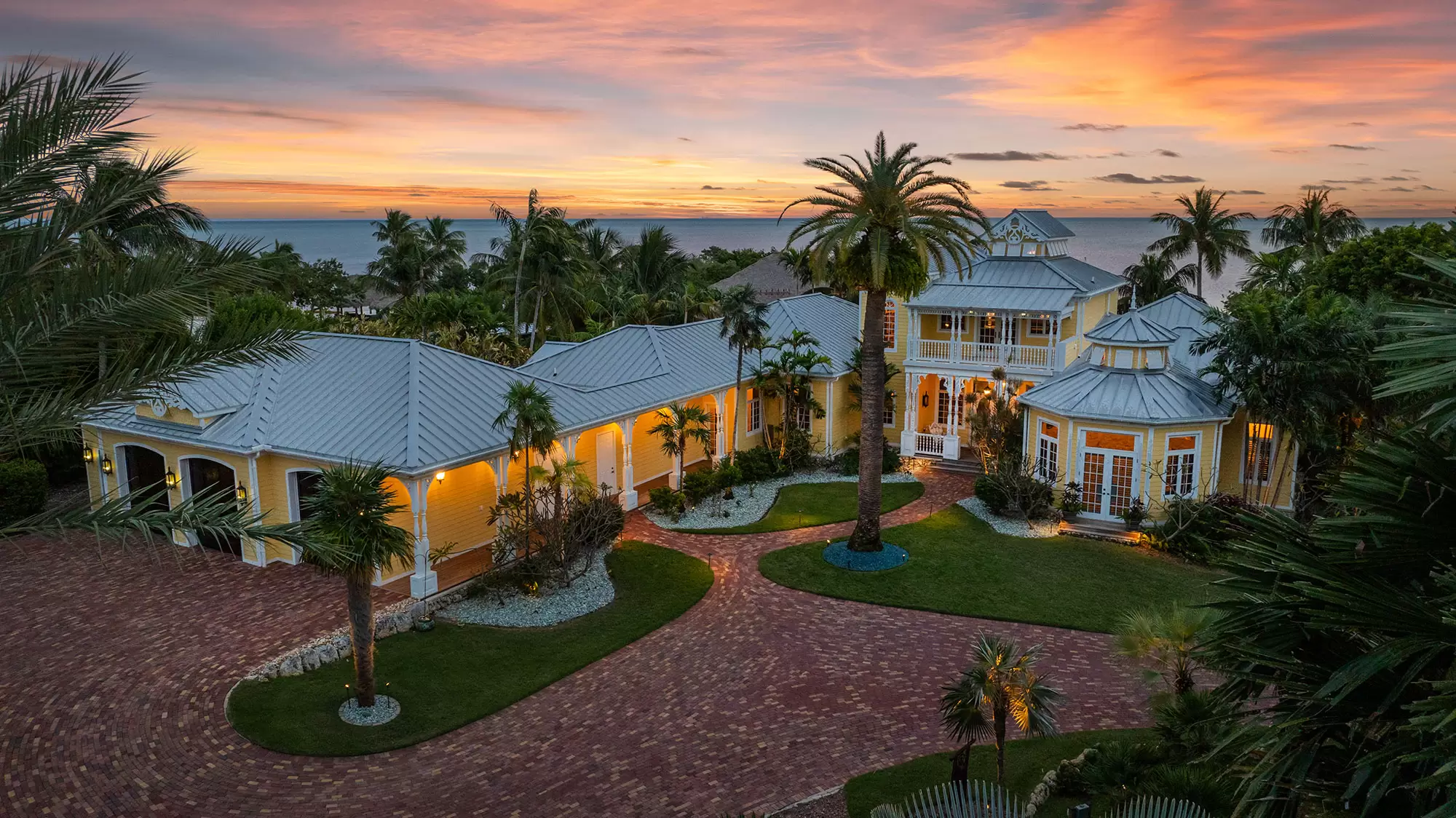 Welcome to the ultimate fly-in fly-out, five acre oceanfront estate directly across from the Florida Keys Marathon International Airport offering U.S. Customs for ultimate ease in continental and international travel, with an additional opportunity for a private hangar acquisition. Experience Caribbean island charm while remaining connected to the mainland. Enter through the private gate to be instantly immersed in the lush foliage of a tropical paradise offering everything desired with no need to leave including boat ramp and marina with immediate ocean access, separate guest house, workshops, fishing and bait shop, garage and barn. Privacy and design is woven into every meticulous detail. With D'Asign Source custom built craftsmanship, the main home is majestically situated at the end of Palm Alley with bright bougainvillea and towering palms offering a brilliant welcome. Gingerbread style exterior leads into an Ernest Hemingway/Victorian interior. Elements of British West Indies architecture and design fill the home with uncompromising quality and surprises around every corner. The primary ensuite opens to the pristine pool and ocean views, yet still cultivates a private retreat experience occupying the whole west side of the home. Primary bathroom dazzles with imported Italian tile and coral wall. Experience the custom built movie theater upstairs. Step onto the spacious back porch and take in the stunning views from every angle. The 195,000 gallon pool stretches around two sides of the home featuring bridges, waterfalls, expansive spa, grotto, waterslide, swim up bar, outdoor kitchen, tiki house, and a lush Tahitian style river that is sure to captivate. Each ensuite guest room offers a private balcony and access into the pool and bridges to an island stroll. This property boasts a natural privacy and serenity that will restore and relax, from the rain forest to the fruit orchard to the ocean. You may never want to leave this idyllic island oasis.