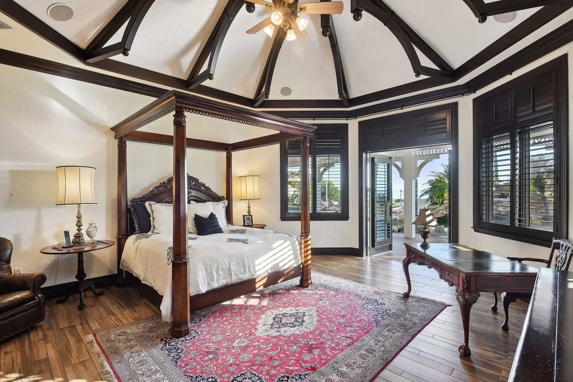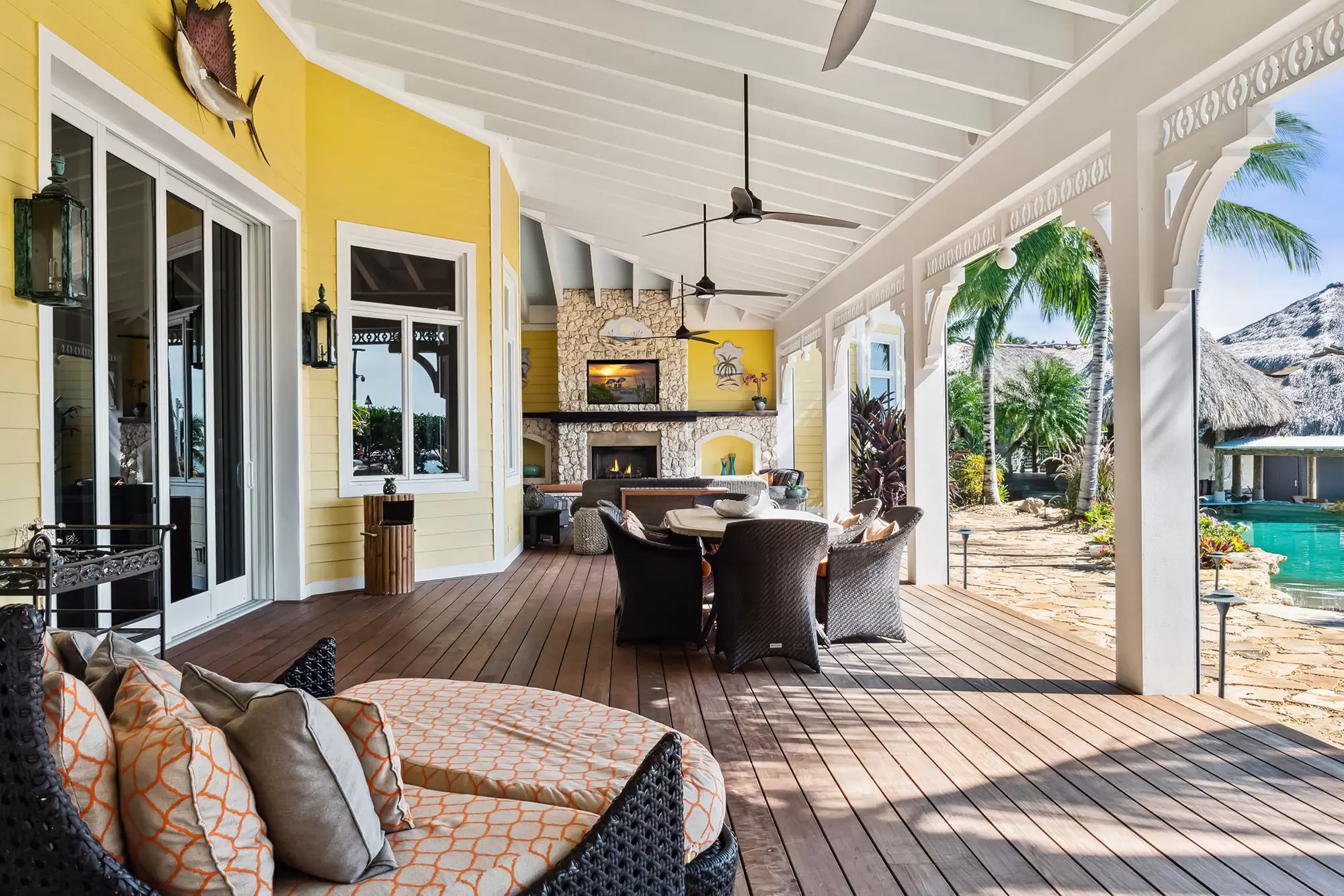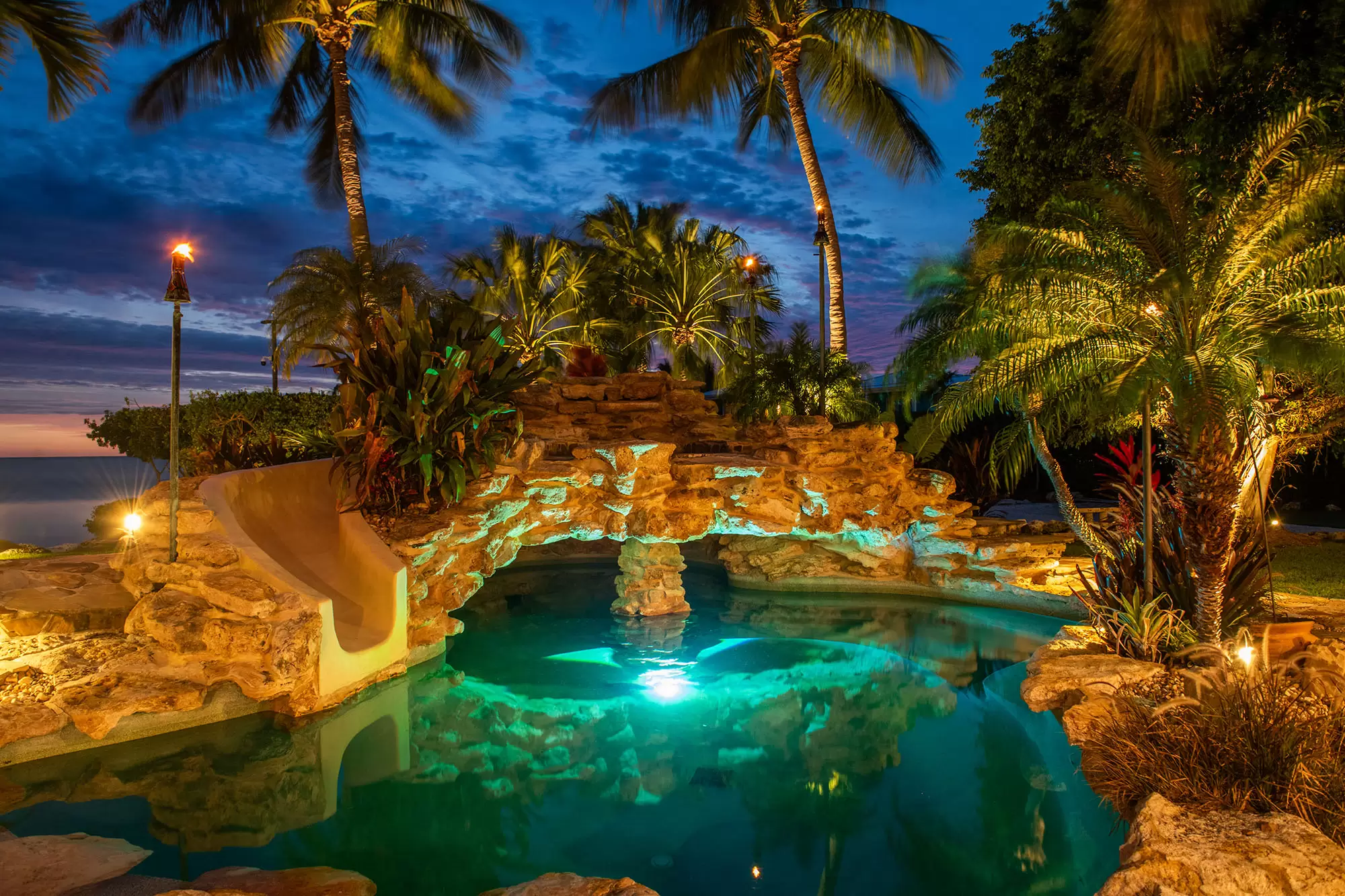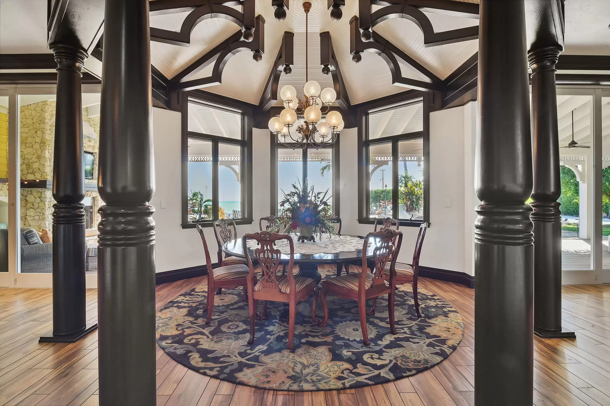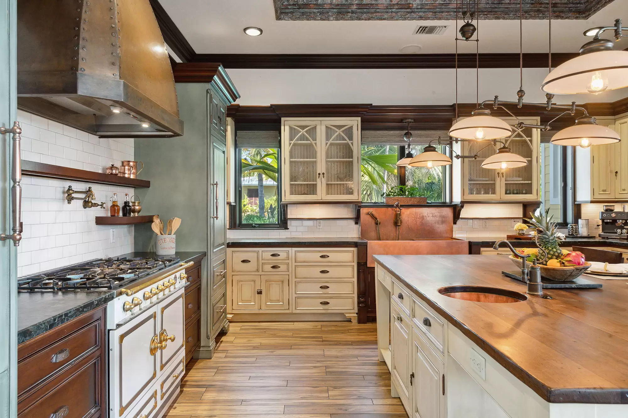 Welcome to the ultimate fly-in fly-out, five acre oceanfront estate directly across from the Florida Keys Marathon International Airport offering U.S. Customs for ultimate ease in continental and international travel, with an additional opportunity for a private hangar acquisition. Experience Caribbean island charm while remaining connected to the mainland. Enter through the private gate to be instantly immersed in the lush foliage of a tropical paradise offering everything desired with no need to leave including boat ramp and marina with immediate ocean access, separate guest house, workshops, fishing and bait shop, garage and barn. Privacy and design is woven into every meticulous detail. With D'Asign Source custom built craftsmanship, the main home is majestically situated at the end of Palm Alley with bright bougainvillea and towering palms offering a brilliant welcome. Gingerbread style exterior leads into an Ernest Hemingway/Victorian interior. Elements of British West Indies architecture and design fill the home with uncompromising quality and surprises around every corner. The primary ensuite opens to the pristine pool and ocean views, yet still cultivates a private retreat experience occupying the whole west side of the home. Primary bathroom dazzles with imported Italian tile and coral wall. Experience the custom built movie theater upstairs. Step onto the spacious back porch and take in the stunning views from every angle. The 195,000 gallon pool stretches around two sides of the home featuring bridges, waterfalls, expansive spa, grotto, waterslide, swim up bar, outdoor kitchen, tiki house, and a lush Tahitian style river that is sure to captivate. Each ensuite guest room offers a private balcony and access into the pool and bridges to an island stroll. This property boasts a natural privacy and serenity that will restore and relax, from the rain forest to the fruit orchard to the ocean. You may never want to leave this idyllic island oasis.