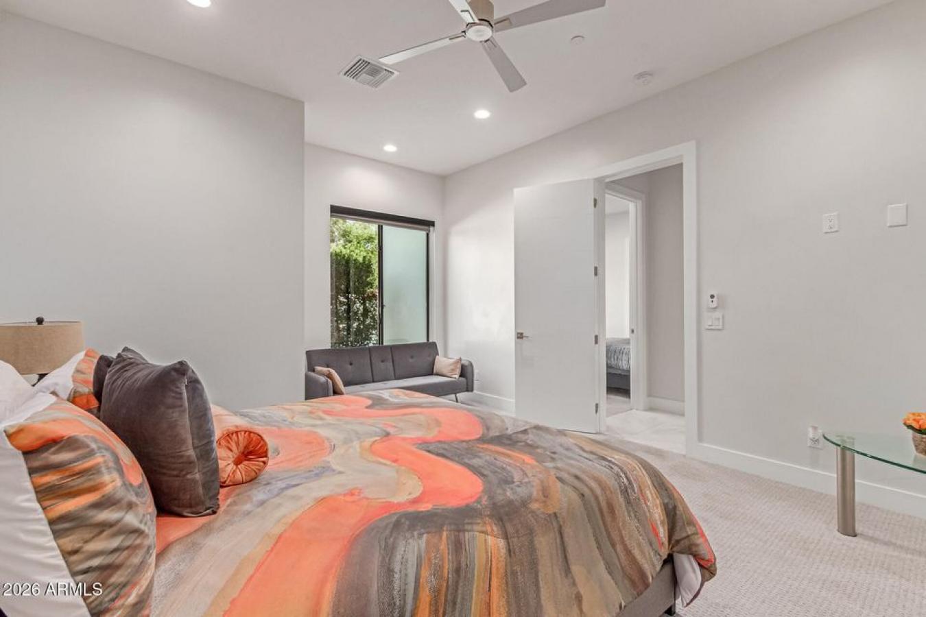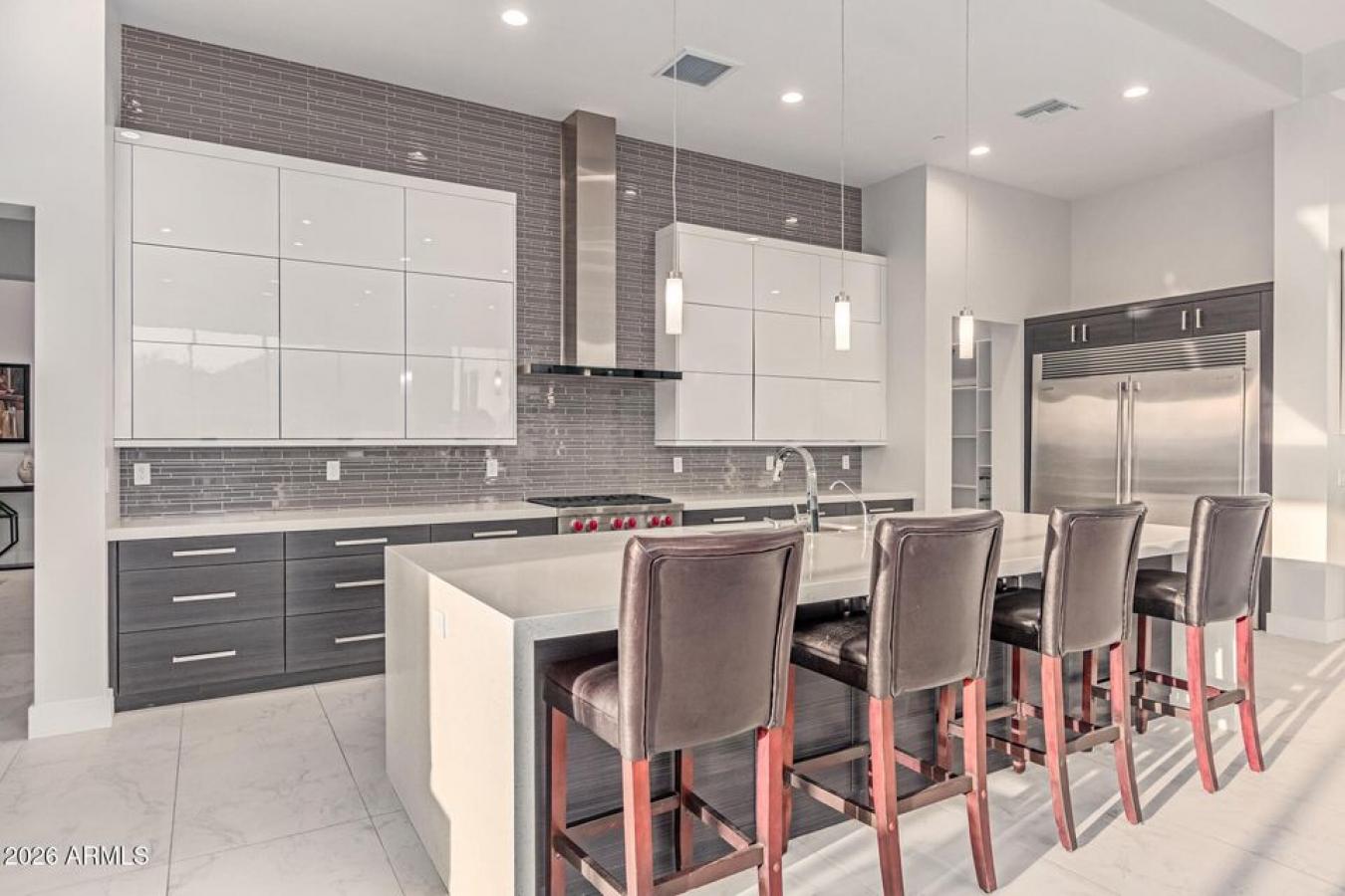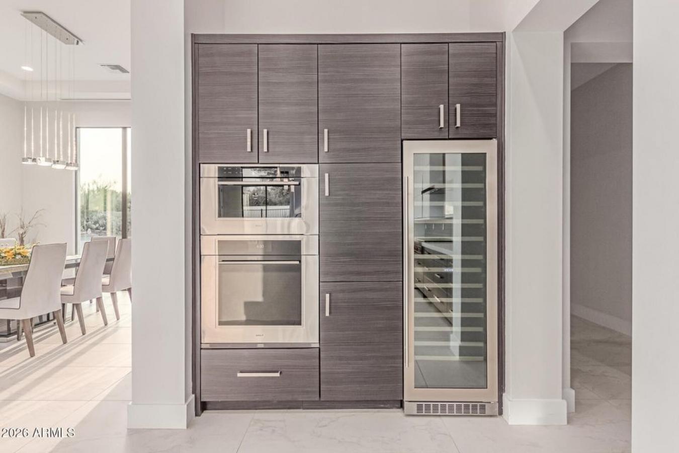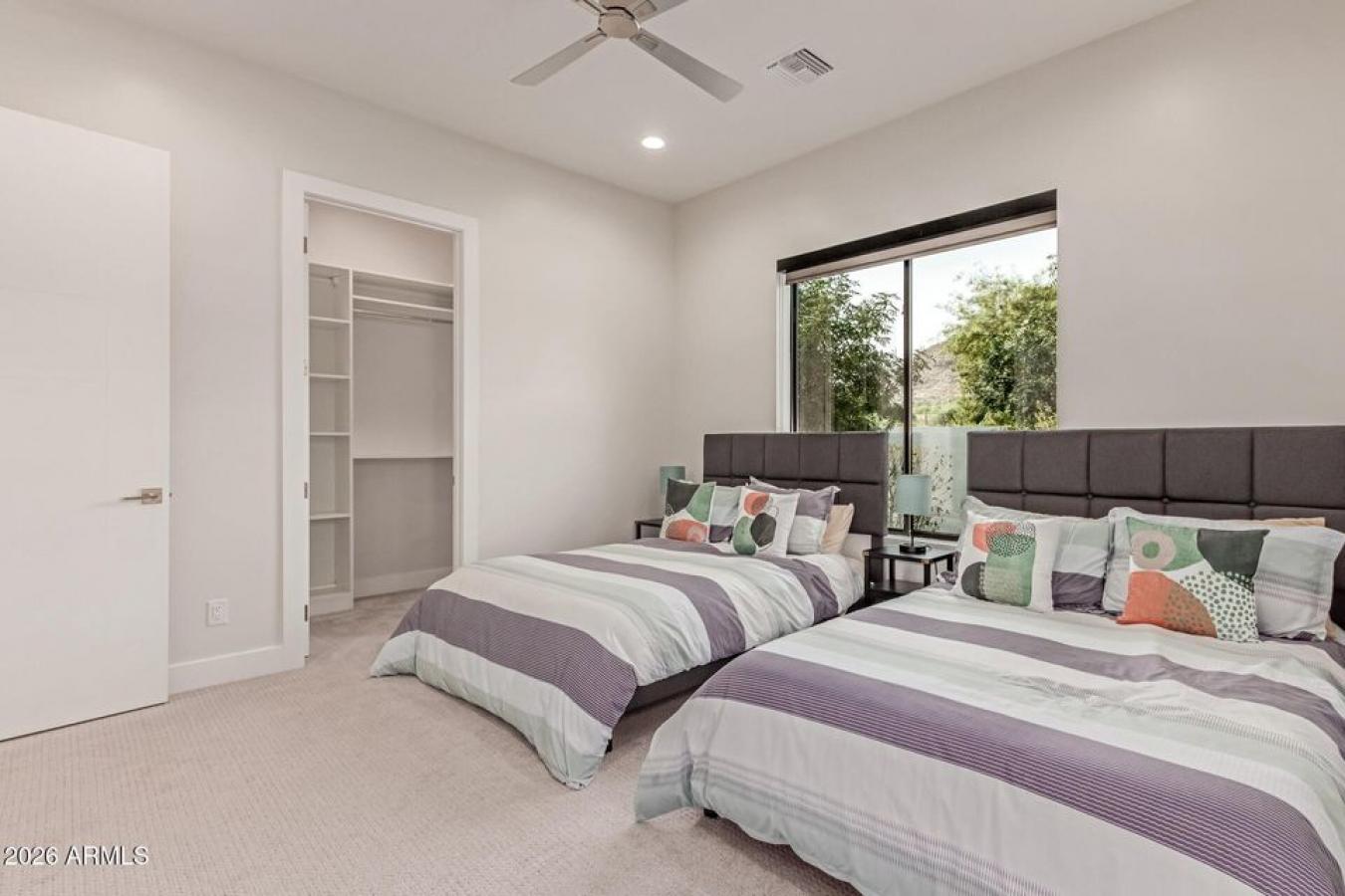 CORNER LOT, CAMELBACK VIEWS, RESORT-STYLE BACKYARD & 4-CAR GARAGE! A striking, fully fenced residence positioned on a premium corner lot with breathtaking Camelback Mountain views, designed to deliver space, functionality, and seamless indoor-outdoor living. The property offers exceptional parking and storage capacity, including an RV gate, paved parking area, and a true 4-car garage ideal for vehicles, recreational toys, or hobby use. The interior showcases an open-concept floor plan anchored by panoramic windows and a 4-panel sliding pocket door system, creating a natural flow between living spaces and the outdoors. Architectural details include tray ceilings, recessed lighting, neutral tile and paint finishes, fire sprinklers, and pre-wired surround sound, all contributing to refined yet comfortable atmosphere throughout the home. The chefs kitchen serves as the heart of the residence, featuring high-end stainless steel appliances, a generous center island with breakfast bar seating, granite countertops, elegant cabinetry, a stylish backsplash, and a walk-in pantry. Adjacent living and dining spaces are ideal for both entertaining and everyday living. Generously sized bedrooms, upscale bathrooms, walk-in closets, a bright den, and a spacious bonus room provide flexibility for work, guests, or additional living areas. The primary suite is a true retreat, highlighted by a spa-inspired bathroom with a freestanding soaking tub, glass-enclosed rain shower, dual-sink vanity, and an oversized walk-in closet. One secondary bedroom offers a unique wet bar and direct access to the backyard, making it ideal for guests or multi-generational living. Outdoor living is equally impressive, featuring a gated pool and spa combination, artificial turf, built-in BBQ, covered patio, and sweeping mountain viewscreating a private, resort-style setting perfect for relaxation or entertaining. With thoughtful design, premium features, and an exceptional location, this property delivers a rare blend of comfort, functionality, and visual impact. Words truly dont do it justice.