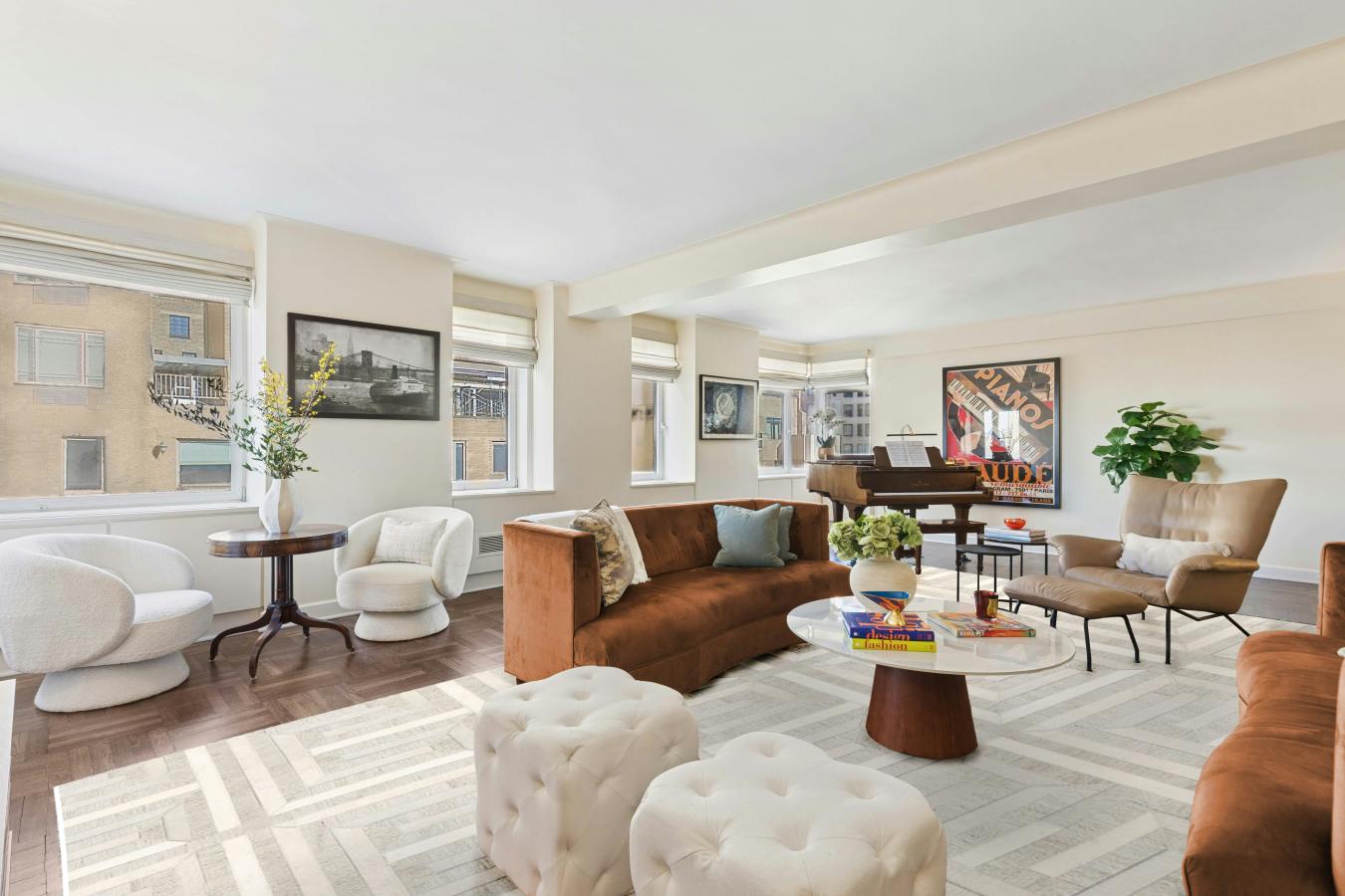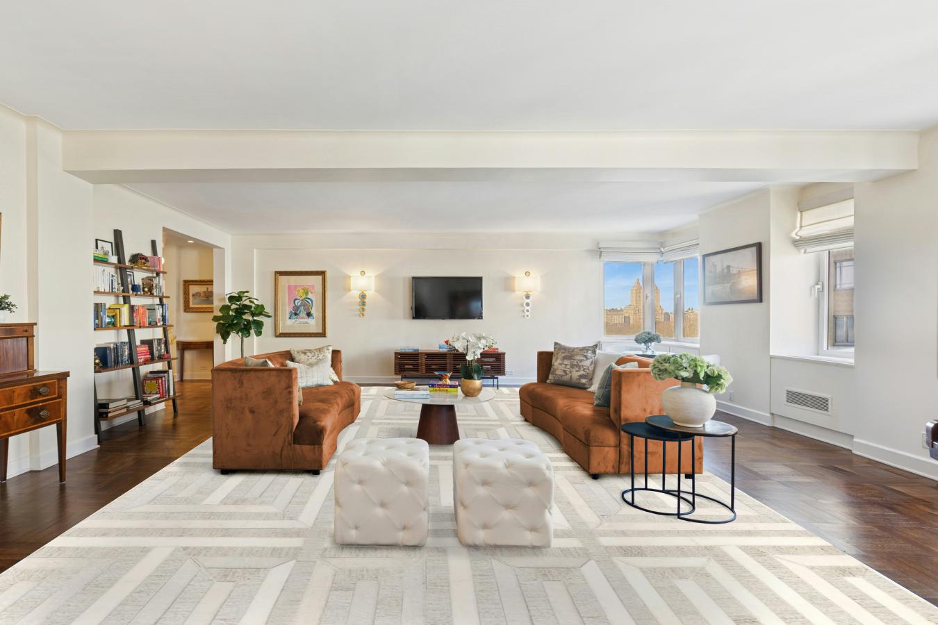 This expansive sun-filled corner residence offers a high-floor vantage point, a desirable split-bedroom layout, and generous proportions for comfortable living and entertaining. Enter through a semi-private hallway into a foyer that leads to a great room with northern, eastern, and western exposures, offering open city vistas and Central Park views. The windowed East-facing kitchen is equipped with top-of-the-line appliances, ample counter and cabinet space, and opens to a generous dining area. Brilliant eastern light and sweeping skyline views create an inviting setting for gatherings. The home features two primary suites, each appointed with large closets and en-suite bathrooms. Two additional bedrooms offer substantial closet space and enjoy access to two well-sized secondary bathrooms. A secondary gallery leads to a windowed laundry room with a sink, as well as a pantry equipped with a Sub-Zero refrigerator and wine fridge. Additional highlights include beamed ceilings, through-wall air conditioning, hardwood floors throughout, and abundant custom-fitted closets. This home is one of the buildings most impressive layouts, offering both style and functionality. 875 Fifth is a cooperative built in 1940 and designed by the renowned architect Emery Roth. Located on Fifth Avenue between 68th and 69th streets, the building offers convenient access to Museum Mile, excellent restaurants and shops, and Central Park via the park entrance on 69th Street. Easy transportation includes the Fifth Avenue bus line, the Eastside subways 4, 5, and 6. Amenities include a state-of-the-art windowed fitness center, a central laundry room, a resident lounge and business center, a private garden, bike storage, and private storage. 50% financing allowed, pied-a-terres permitted, 4% flip tax paid by purchaser. An assessment of 825 a month for Capital Improvements through Dec. 2026. No pets, except service and emotional support animals.