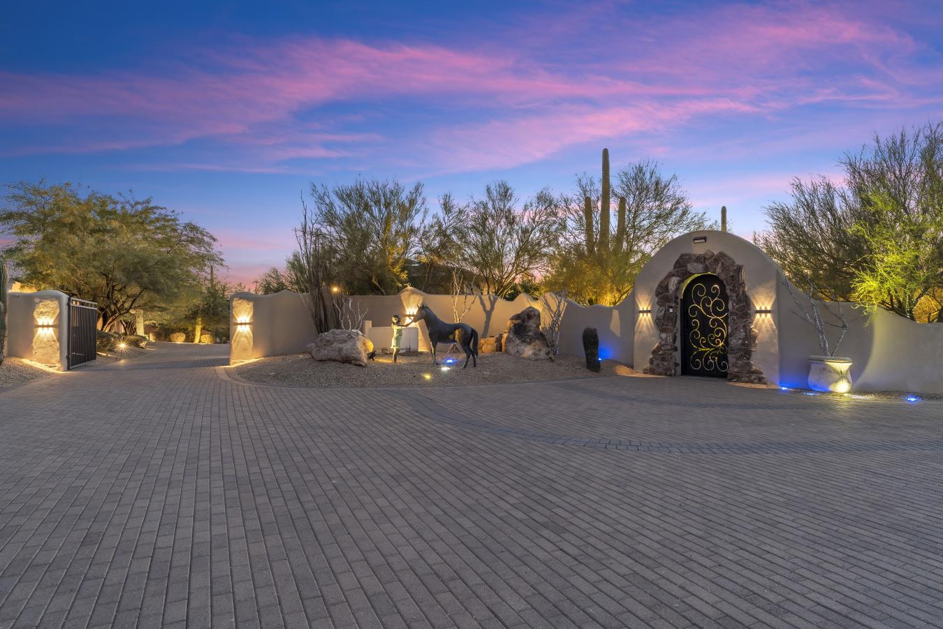 This is your opportunity to own nearly 8 acres of premier horse property while still enjoying the convenience of North Scottsdale. A private, freshly paved driveway leads you to a luxurious 4, 402 sq ft home featuring a new roof, fresh interior paint, two primary suites, and a resort-style backyard ideal for entertaining. The impressive gated courtyard showcases lush mature vegetation, two large wrought-iron doors, and access to the spacious four car garage with plenty of built in storage. Equestrian amenities include a fully covered barn with six stalls, wash racks, fly system, misters, and an on-site washer and dryer, along with two riding arenas, living quarters, and an entertainment room. A rare blend of privacy, luxury, and equestrian living in North Scottsdale.