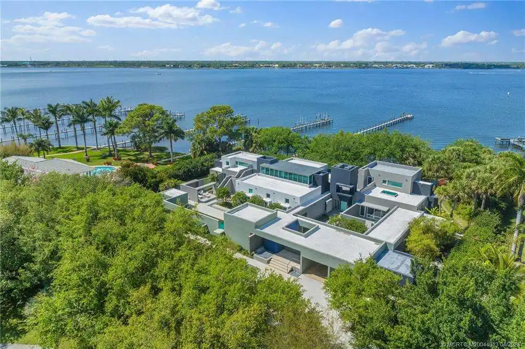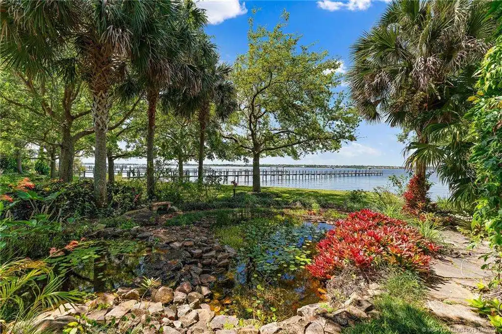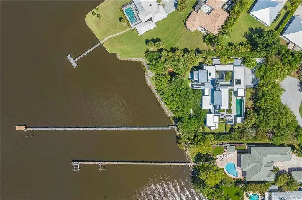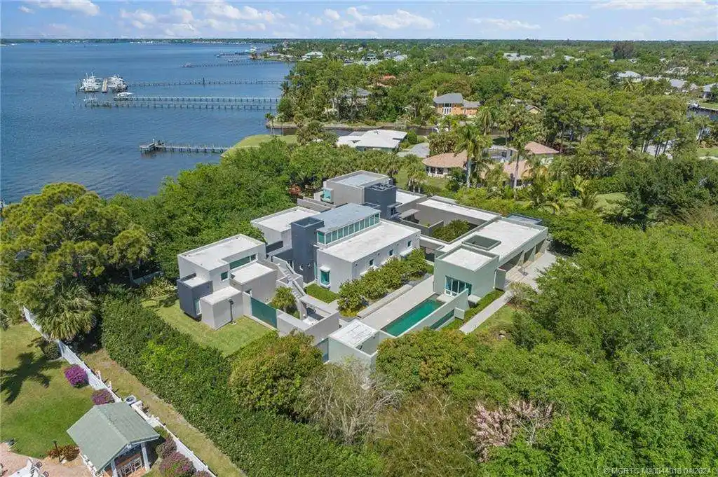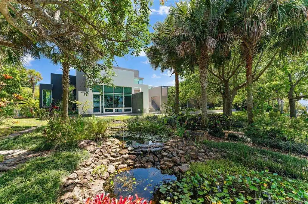 This modern residence combines a 7,500 square foot design by an award-winning architect with stunning wide river views amidst breathtaking landscaping all in an exclusive private setting. The house rests on a double riverfront lot that features over 200 feet of protected shoreline on the wide St. Lucie River, a 360-foot dock, and panoramic sunsets. The house design provides for easy movement and wonderful private courtyard spaces featuring five bedrooms and five and a half bathrooms all with pool or water views. Built for convenience, the residence has a separate guest suite. Two private offices with water views. Built in custom cabinetry. Step outside and escape into nature with a double layer backyard pond, courtyard koi pond, and paths winding around beautiful exotic landscaping and mature oak trees to complete this waterfront masterpiece.
