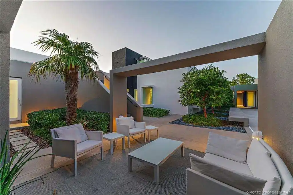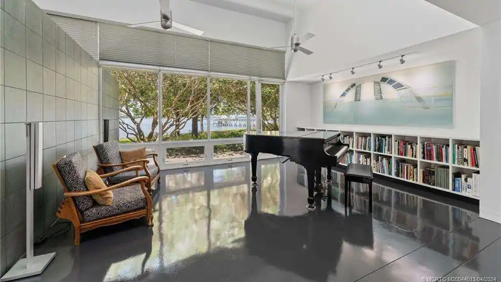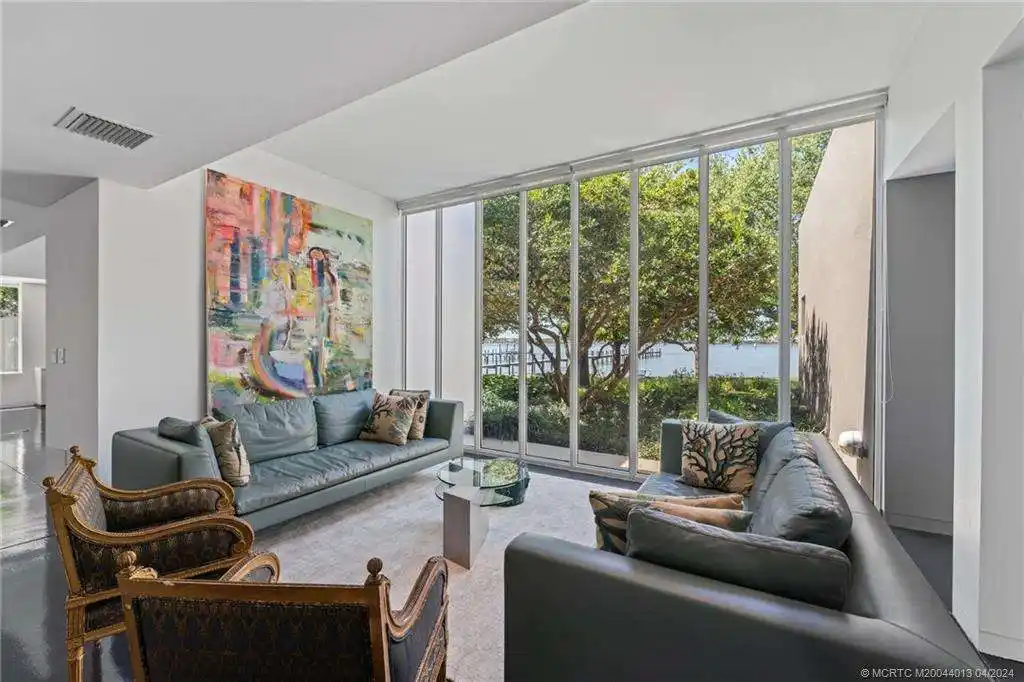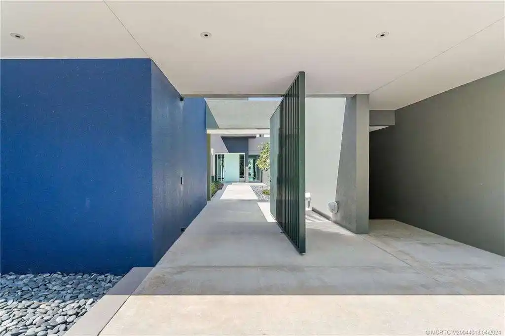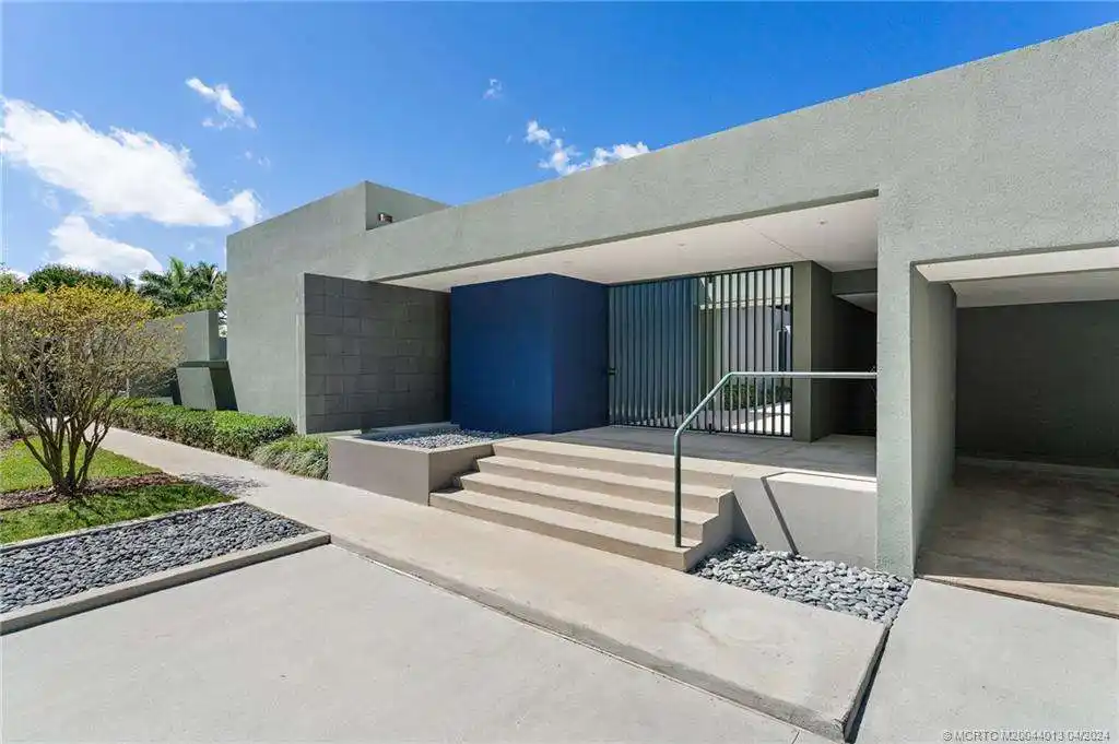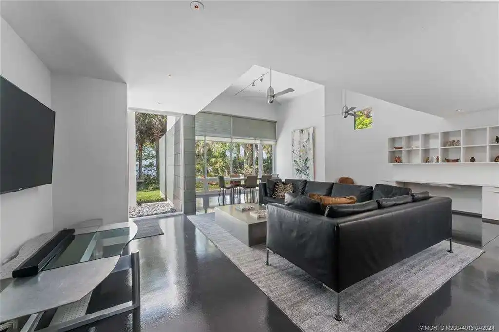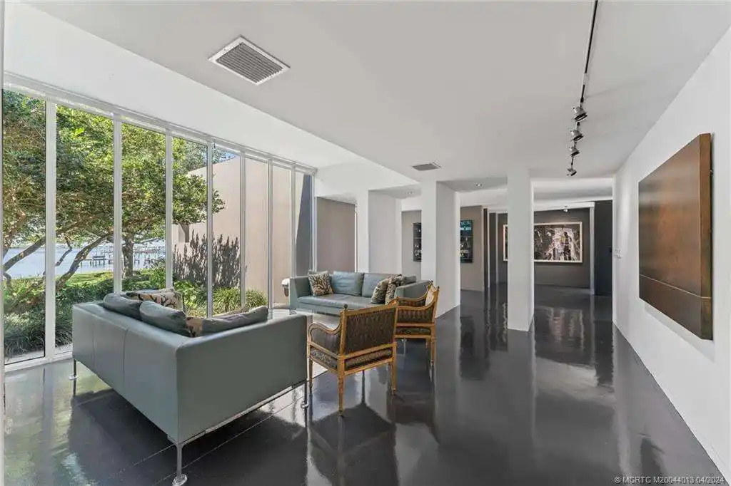This modern residence combines a 7,500 square foot design by an award-winning architect with stunning wide river views amidst breathtaking landscaping all in an exclusive private setting. The house rests on a double riverfront lot that features over 200 feet of protected shoreline on the wide St. Lucie River, a 360-foot dock, and panoramic sunsets.