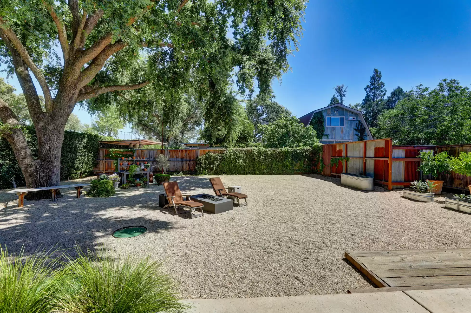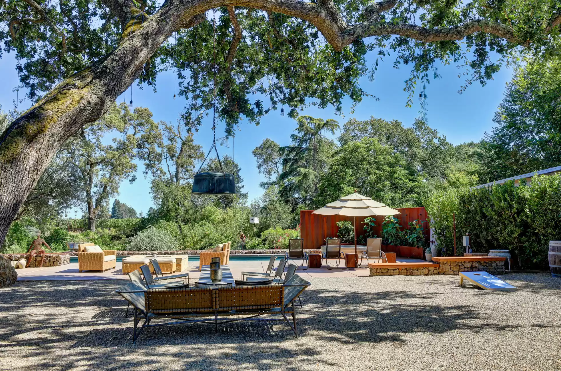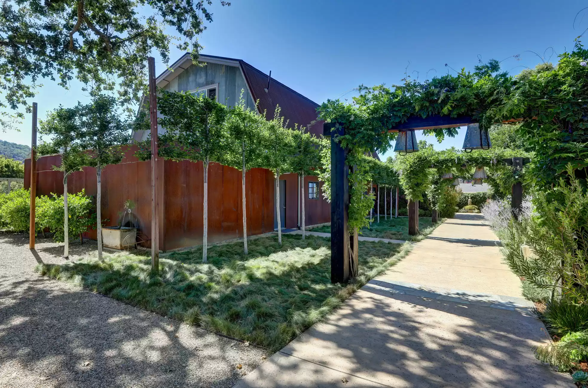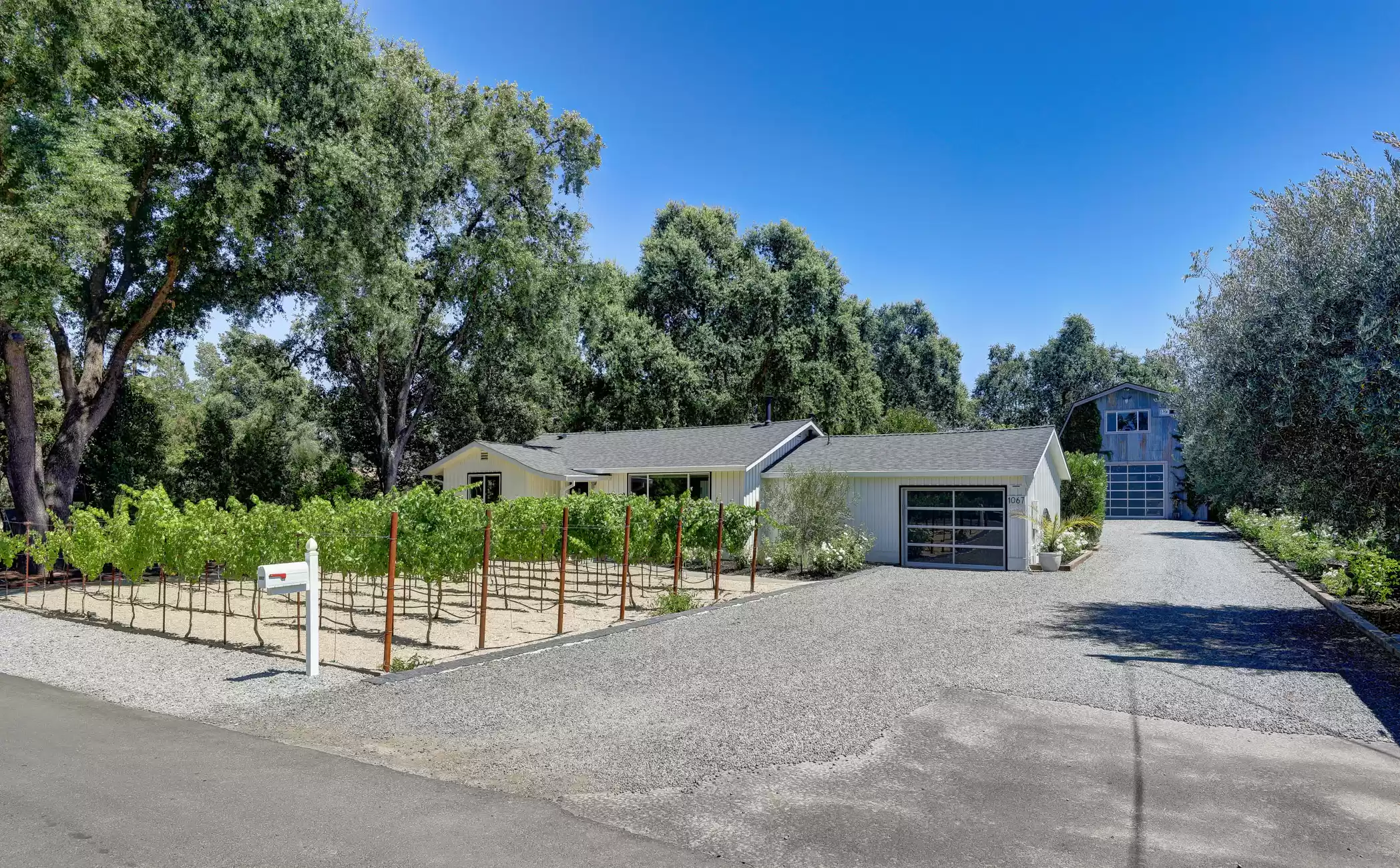 Welcome to your own private, idyllic paradise, situated on an inviting country lane on 1 (+/- ) acre surrounded by vineyards. This one of a kind wine country compound is an entertainer’s dream, perfectly designed to blend the indoors with the outdoors, creating a classic Napa Valley experience, sure to capture the attention of the most discerning buyer.The property consists of three separate dwellings; a farmhouse style front house, a sleek modern rear house designed by Matthew Stannard, Stillwater Dwellings, and a rustic modern barn with one bedroom apartment upstairs and spacious entertainment area below. ‘Smart Home’ technology remoteley manages your security, climate, lighting, and irrigation systems.The 1195 (+/-) sq ft front house overlooks your private cabernet vineyard. This home features 2 bedrooms, an office, full bathroom with stall shower, kitchen with quartz countertops, stainless steel Whirlpool appliances, and living room with gas fireplace. The dining area opens to a private patio, expansive level entertainment area and perimeter fencing. A one-car garage is attached with ample laundry space.The 1120 (+/-) sq ft rear house is designed to efficiently stay cool in the summer and warm in the winter. Featuring bamboo flooring, 2 bedrooms, 1 bathroom, an open concept living room, dining room, and kitchen space. The living area with a Montigo gas fireplace boasts expansive windows with views of the vineyards, mountains and large entertainment patio. The custom birch cabinetry complements the Caesarstone Raven countertops and stainless steel appliances in the kitchen.The 1420 (+/-) sq ft rustic modern barn is restored and remodeled throughout with 4-inches of insulated foam under a standing seam metal roof. The expansive entertainment space downstairs encompasses a performance stage, a bar, buffet service counter, storage closet, and wall of built-in cabinets. Also at the ground level is a walk-in temperature controlled wine cellar with storage for 700+ bottles.The 1160 (+/-) upstairs barn has a spacious one bedroom, one bathroom apartment with walk-in closet, open concept living room/dining area, Montigo gas fireplace, Summit 2 drawer stainless steel refrigerator/freezer, stainless sink and washer/dryer.The outdoors are nothing short of spectacular, with magazine-worthy landscaping designed by renowned landscape architect Josh Chandler.Magical outdoor spaces seamlessly connect to create a resort-like experience featuring multiple entertainment areas, custom-designed water features, stunning pool finished in a Wet Edge ‘Picasso Blue’ pebble finish, stainless steel spa by Diamond Spa, bocce court with crushed oyster shells, large cushioned lounge area next to bocce court, extra large 6ft stone firepit, built-in outdoor Lynx grill with Caesarstone countertop and custom metal cabinet doors below, covered stainless sink and outdoor dining area with mesh shade canopy above. Edible bounty from the orchard, culinary garden, raised produce beds, and Cabernet vines complete the farm-to-table experience.This special residence in the flight path of Napa Valley’s Hot Air Balloons, has been the host to the Napa Valley Film Festival, numerous wine country fundraisers, and has been featured in architectural magazines. The property is centrally located and provides easy access to downtown Napa, St. Helena, Yountville, and the surrounding world-class wineries. Only minutes to the charmed town of Yountville, every food lover's destination featuring some of Northern California’s best restaurants; the famed Thomas Keller’s French Laundry, Ad Hoc, and Bouchon, Bistro Jeanty, RH Yountville restaurant, wine bar and showroom.Additional Features Include:Front HouseNew washer and dryerNew HVAC with Nest thermostatNew hot water heaterRear HouseAC attached to the house has been serviced twice (recently - 7/22)Added remote switch in the house to turn on outdoor dining patio lights from insideServiced gas fireplaceNew gas starter switch installed for fireplaceRefrigerator/freezer (10/22)Loft/BarnServiced gas fireplaceNew gas starter switch installed for gas fireplaceRecently serviced refrigeration system in wine closet (7/22)Refrigerator/freezer drawers for loft apartment (9/19)New shade for loft bedroom windowNew gutter guards on barn gutter (12/21)Back PropertyPool, spa, and patio completed (11/21)Pool solar (6/22)New swimming pool with Wet Edge Pebble Finish in “Picasso Blue” (additional details available)All steel portable spa by Diamond Spas, ColoradoEV Outlet added to the drivewayCustom sliding metal gate at entry path off the drivewayLandscaping workNew galvanized metal roof over bocce bench which included additional metal pipe support overheadStained and sealed bocce deck, wood bench, and coffee tableReplaced pump in the fountain by bocceAdded oyster shells to the bocce courtMonitoring wells to the Bocce area for septicSwitched all lawn sprays to MP rotors for additional water savingsAdded several yards of gravel to the area between the barn and poolRebuilt fence and wood 4x6 edging post pool installationAdded 3ft high silt screen protector behind the sweet bay hedge on both sidesBuilt two-tiered Gabion bench with Miso bamboo top at end of concrete patioNew roof over large shed area and floor-to-ceiling shelving and hanging hooks inside for storage purposes (6/19)Placed grey DG area outside of shed all the way down to solid fence at the end past the chicken coopSpread gold DG inside the shed and treated with a pathway stabilizerRejuvenation of light fixtures over both barn doors and in the shedAdded Landscape lighting, mainly WAC brandMoved all veggie boxes, rebuilt as needed, added all new soil, irrigation, gopher wire, and weed barrier fabric underneathInstalled bamboo fence for privacy after cedar tree was removed and planted in frontOak tree trimming 2 different times to get to where we are now with the health of treesAdded stair access to veggie boxes with hog wire black gate