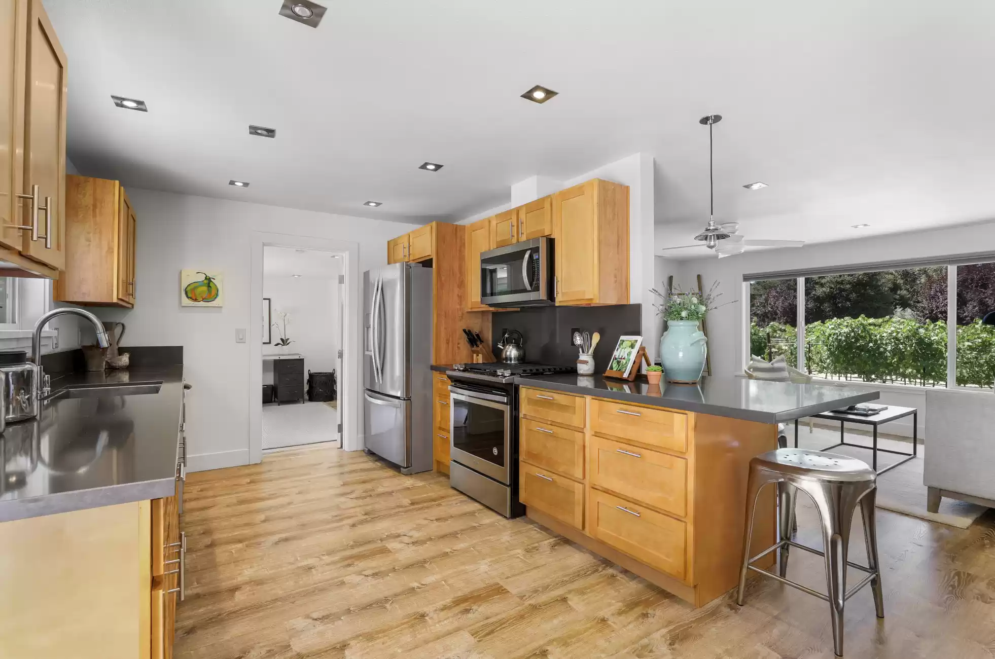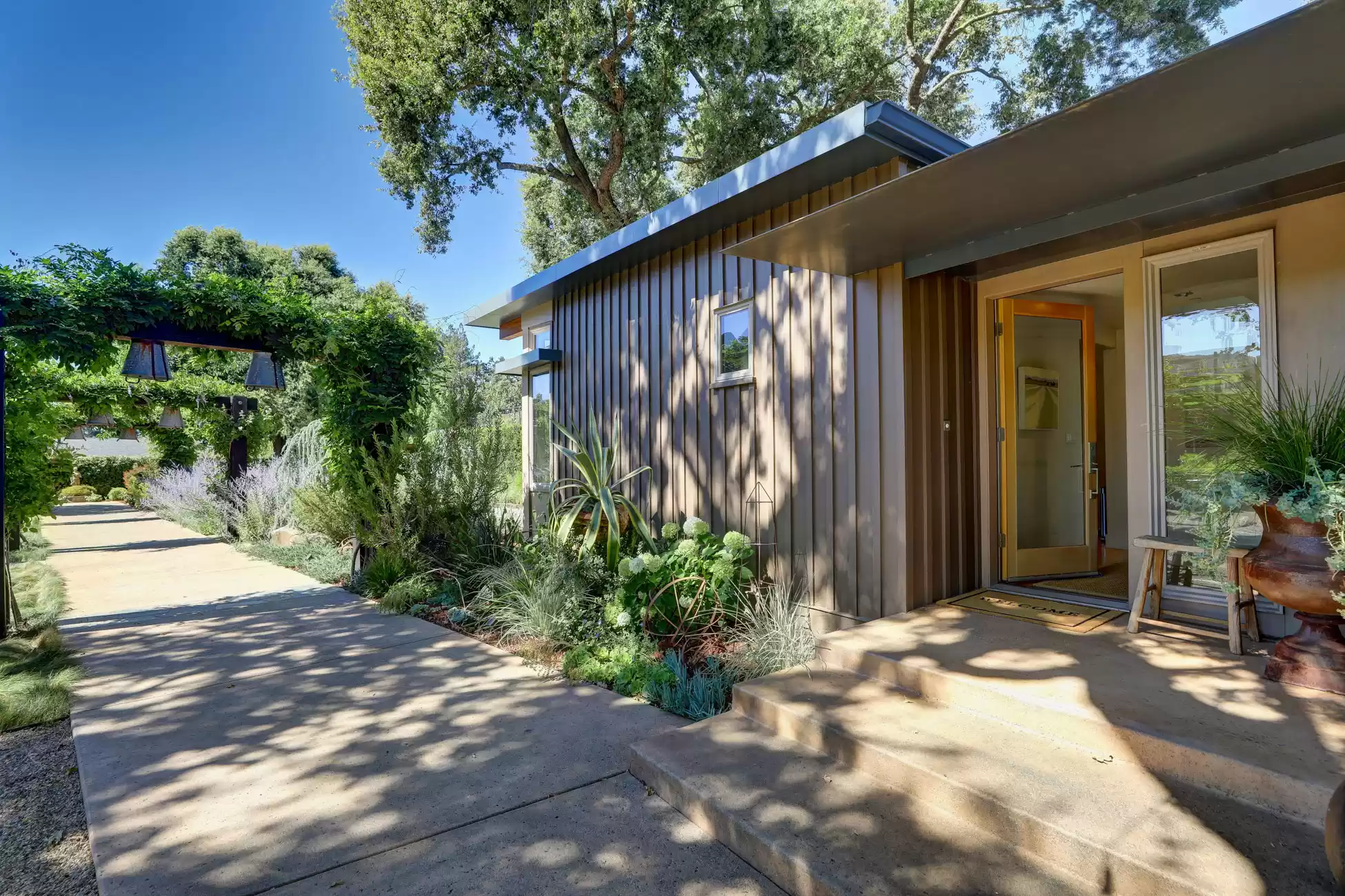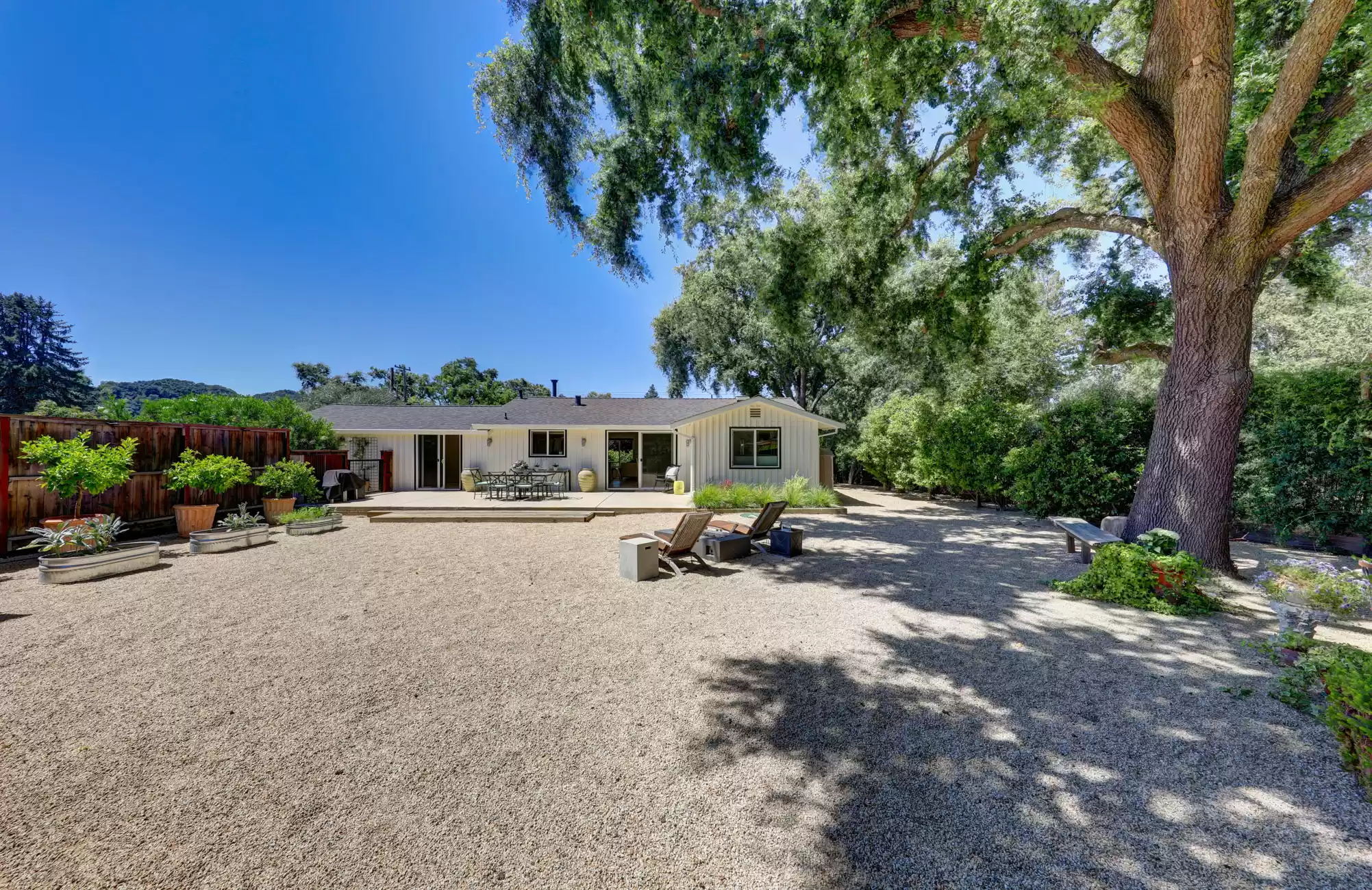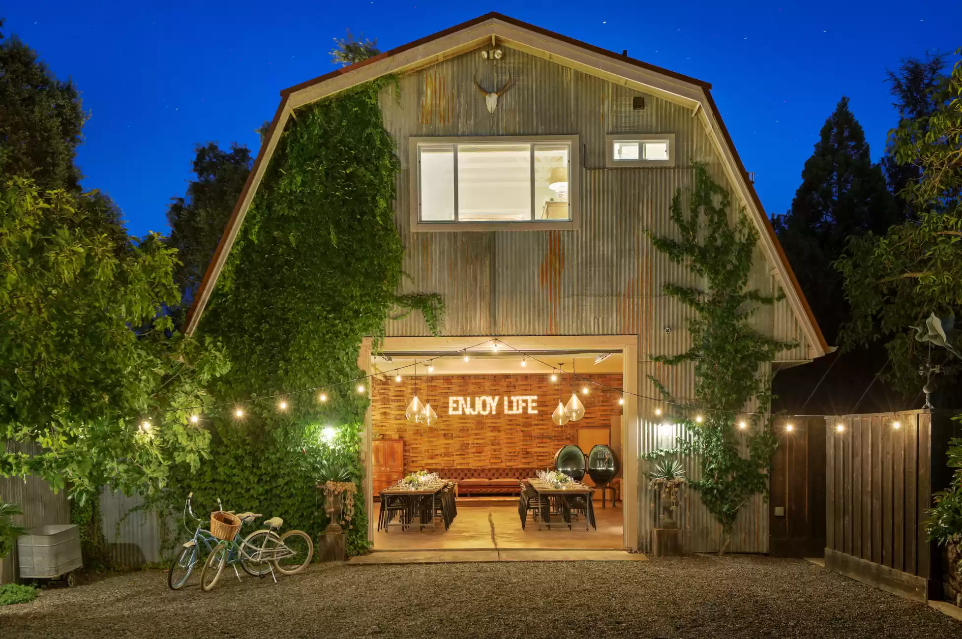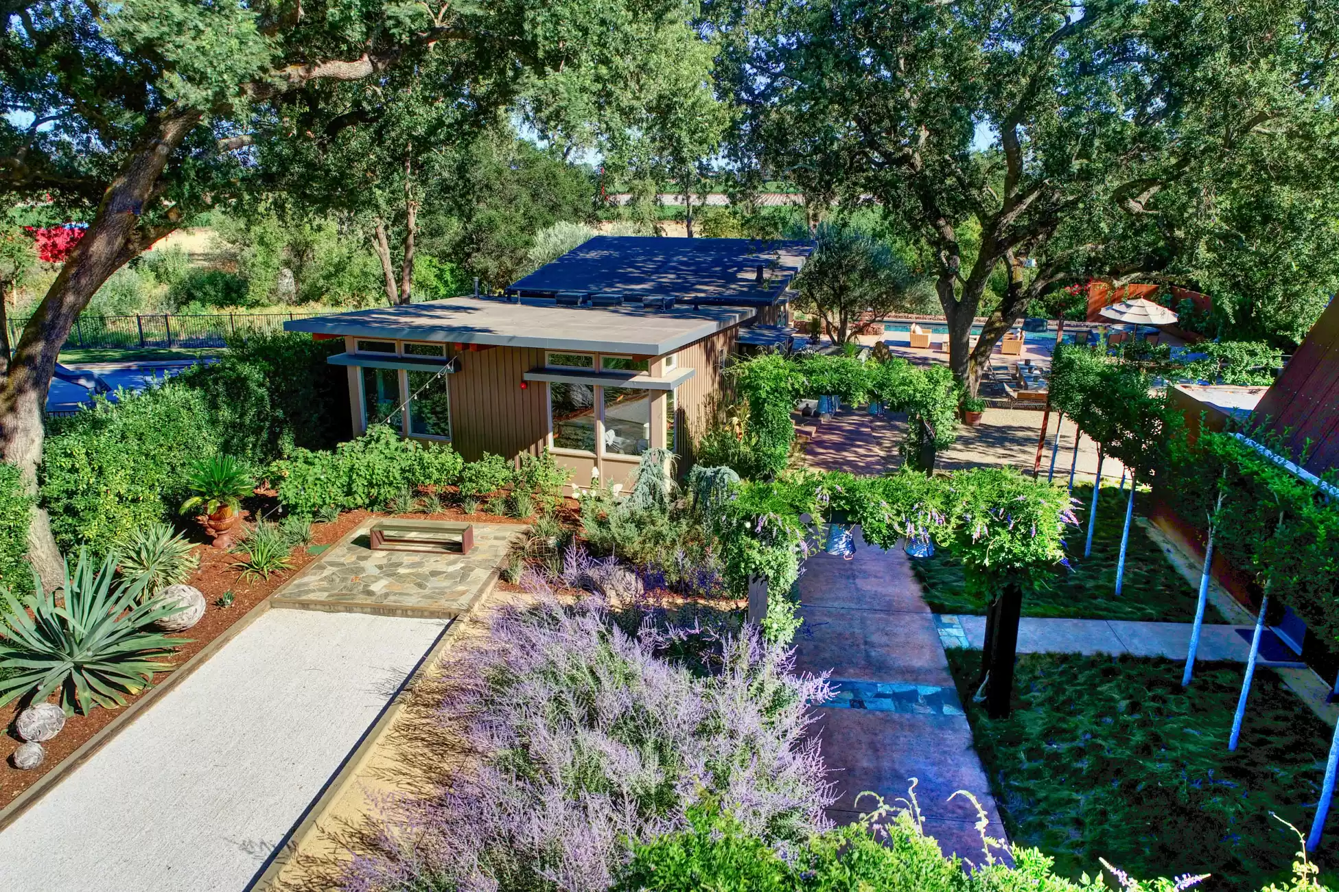 Welcome to your own private, idyllic paradise, situated on an inviting country lane on 1 (+/- ) acre surrounded by vineyards. This one of a kind wine country compound is an entertainer’s dream, perfectly designed to blend the indoors with the outdoors, creating a classic Napa Valley experience, sure to capture the attention of the most discerning buyer.The property consists of three separate dwellings; a farmhouse style front house, a sleek modern rear house designed by Matthew Stannard, Stillwater Dwellings, and a rustic modern barn with one bedroom apartment upstairs and spacious entertainment area below. ‘Smart Home’ technology remoteley manages your security, climate, lighting, and irrigation systems.The 1195 (+/-) sq ft front house overlooks your private cabernet vineyard. This home features 2 bedrooms, an office, full bathroom with stall shower, kitchen with quartz countertops, stainless steel Whirlpool appliances, and living room with gas fireplace. The dining area opens to a private patio, expansive level entertainment area and perimeter fencing. A one-car garage is attached with ample laundry space.The 1120 (+/-) sq ft rear house is designed to efficiently stay cool in the summer and warm in the winter. Featuring bamboo flooring, 2 bedrooms, 1 bathroom, an open concept living room, dining room, and kitchen space. The living area with a Montigo gas fireplace boasts expansive windows with views of the vineyards, mountains and large entertainment patio. The custom birch cabinetry complements the Caesarstone Raven countertops and stainless steel appliances in the kitchen.The 1420 (+/-) sq ft rustic modern barn is restored and remodeled throughout with 4-inches of insulated foam under a standing seam metal roof. The expansive entertainment space downstairs encompasses a performance stage, a bar, buffet service counter, storage closet, and wall of built-in cabinets. Also at the ground level is a walk-in temperature controlled wine cellar with storage for 700+ bottles.The 1160 (+/-) upstairs barn has a spacious one bedroom, one bathroom apartment with walk-in closet, open concept living room/dining area, Montigo gas fireplace, Summit 2 drawer stainless steel refrigerator/freezer, stainless sink and washer/dryer.The outdoors are nothing short of spectacular, with magazine-worthy landscaping designed by renowned landscape architect Josh Chandler.Magical outdoor spaces seamlessly connect to create a resort-like experience featuring multiple entertainment areas, custom-designed water features, stunning pool finished in a Wet Edge ‘Picasso Blue’ pebble finish, stainless steel spa by Diamond Spa, bocce court with crushed oyster shells, large cushioned lounge area next to bocce court, extra large 6ft stone firepit, built-in outdoor Lynx grill with Caesarstone countertop and custom metal cabinet doors below, covered stainless sink and outdoor dining area with mesh shade canopy above. Edible bounty from the orchard, culinary garden, raised produce beds, and Cabernet vines complete the farm-to-table experience.This special residence in the flight path of Napa Valley’s Hot Air Balloons, has been the host to the Napa Valley Film Festival, numerous wine country fundraisers, and has been featured in architectural magazines. The property is centrally located and provides easy access to downtown Napa, St. Helena, Yountville, and the surrounding world-class wineries. Only minutes to the charmed town of Yountville, every food lover's destination featuring some of Northern California’s best restaurants; the famed Thomas Keller’s French Laundry, Ad Hoc, and Bouchon, Bistro Jeanty, RH Yountville restaurant, wine bar and showroom.Additional Features Include:Front HouseNew washer and dryerNew HVAC with Nest thermostatNew hot water heaterRear HouseAC attached to the house has been serviced twice (recently - 7/22)Added remote switch in the house to turn on outdoor dining patio lights from insideServiced gas fireplaceNew gas starter switch installed for fireplaceRefrigerator/freezer (10/22)Loft/BarnServiced gas fireplaceNew gas starter switch installed for gas fireplaceRecently serviced refrigeration system in wine closet (7/22)Refrigerator/freezer drawers for loft apartment (9/19)New shade for loft bedroom windowNew gutter guards on barn gutter (12/21)Back PropertyPool, spa, and patio completed (11/21)Pool solar (6/22)New swimming pool with Wet Edge Pebble Finish in “Picasso Blue” (additional details available)All steel portable spa by Diamond Spas, ColoradoEV Outlet added to the drivewayCustom sliding metal gate at entry path off the drivewayLandscaping workNew galvanized metal roof over bocce bench which included additional metal pipe support overheadStained and sealed bocce deck, wood bench, and coffee tableReplaced pump in the fountain by bocceAdded oyster shells to the bocce courtMonitoring wells to the Bocce area for septicSwitched all lawn sprays to MP rotors for additional water savingsAdded several yards of gravel to the area between the barn and poolRebuilt fence and wood 4x6 edging post pool installationAdded 3ft high silt screen protector behind the sweet bay hedge on both sidesBuilt two-tiered Gabion bench with Miso bamboo top at end of concrete patioNew roof over large shed area and floor-to-ceiling shelving and hanging hooks inside for storage purposes (6/19)Placed grey DG area outside of shed all the way down to solid fence at the end past the chicken coopSpread gold DG inside the shed and treated with a pathway stabilizerRejuvenation of light fixtures over both barn doors and in the shedAdded Landscape lighting, mainly WAC brandMoved all veggie boxes, rebuilt as needed, added all new soil, irrigation, gopher wire, and weed barrier fabric underneathInstalled bamboo fence for privacy after cedar tree was removed and planted in frontOak tree trimming 2 different times to get to where we are now with the health of treesAdded stair access to veggie boxes with hog wire black gate