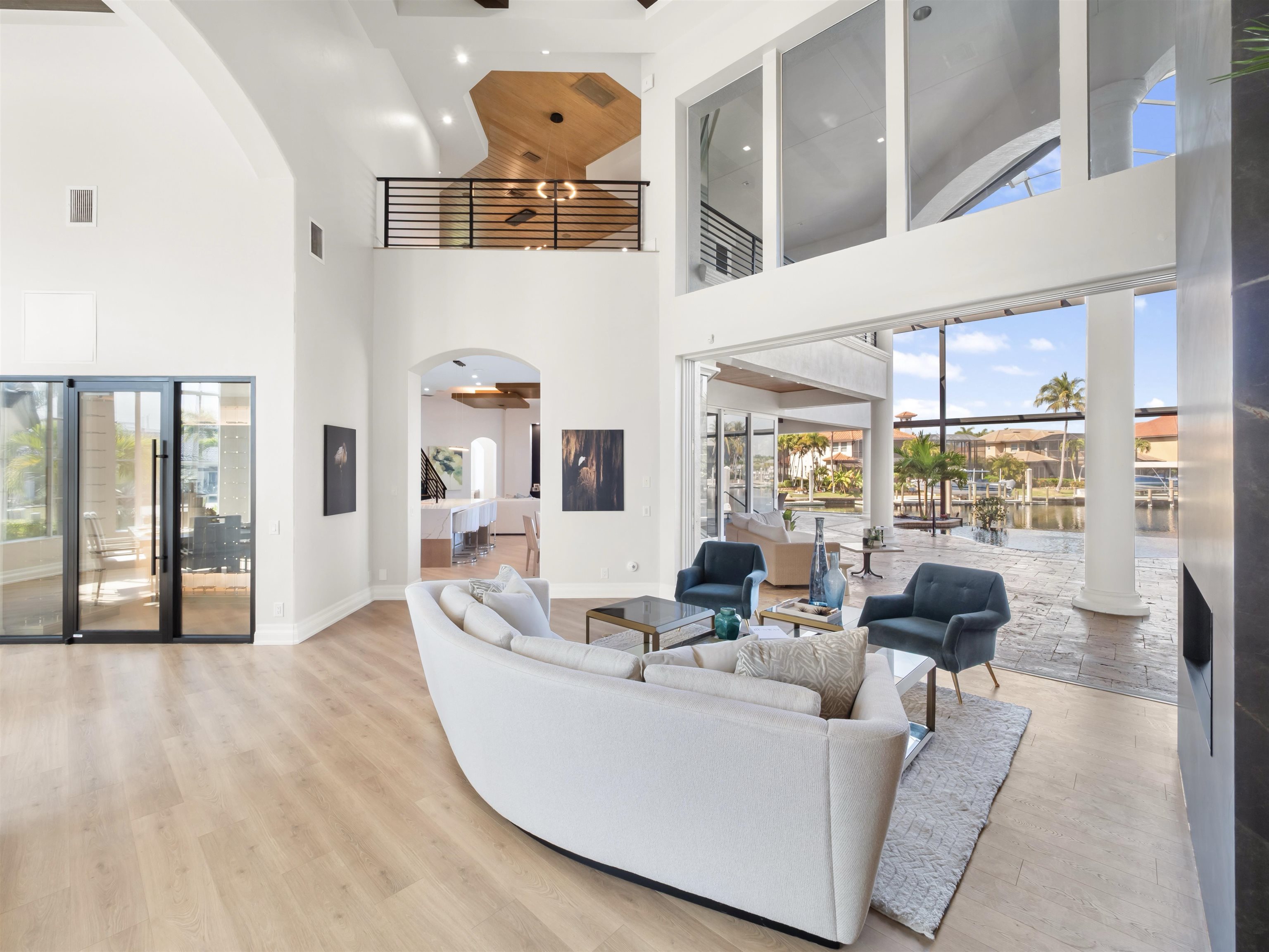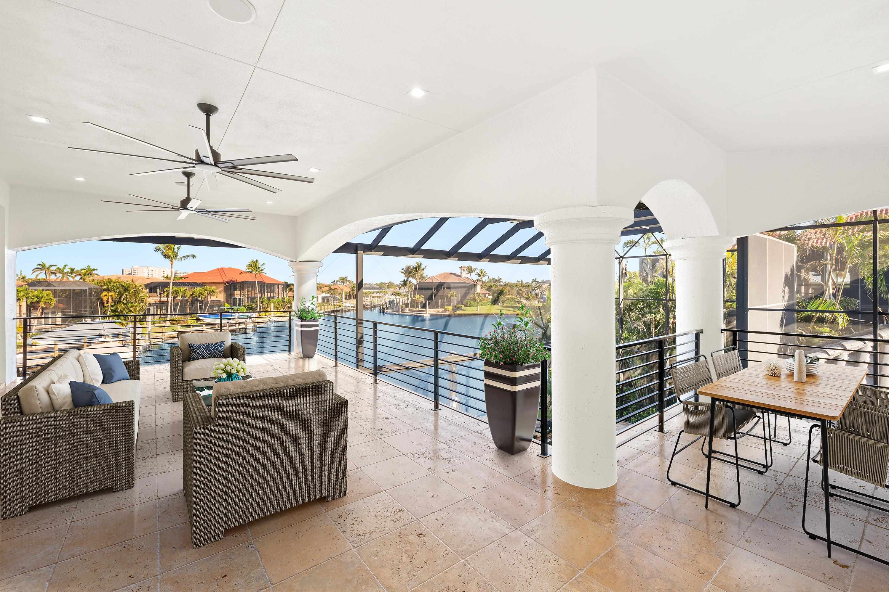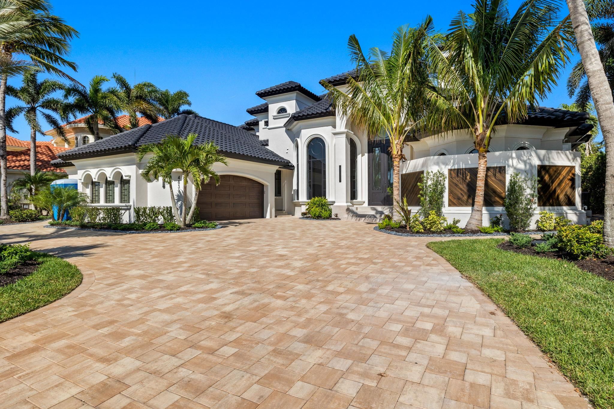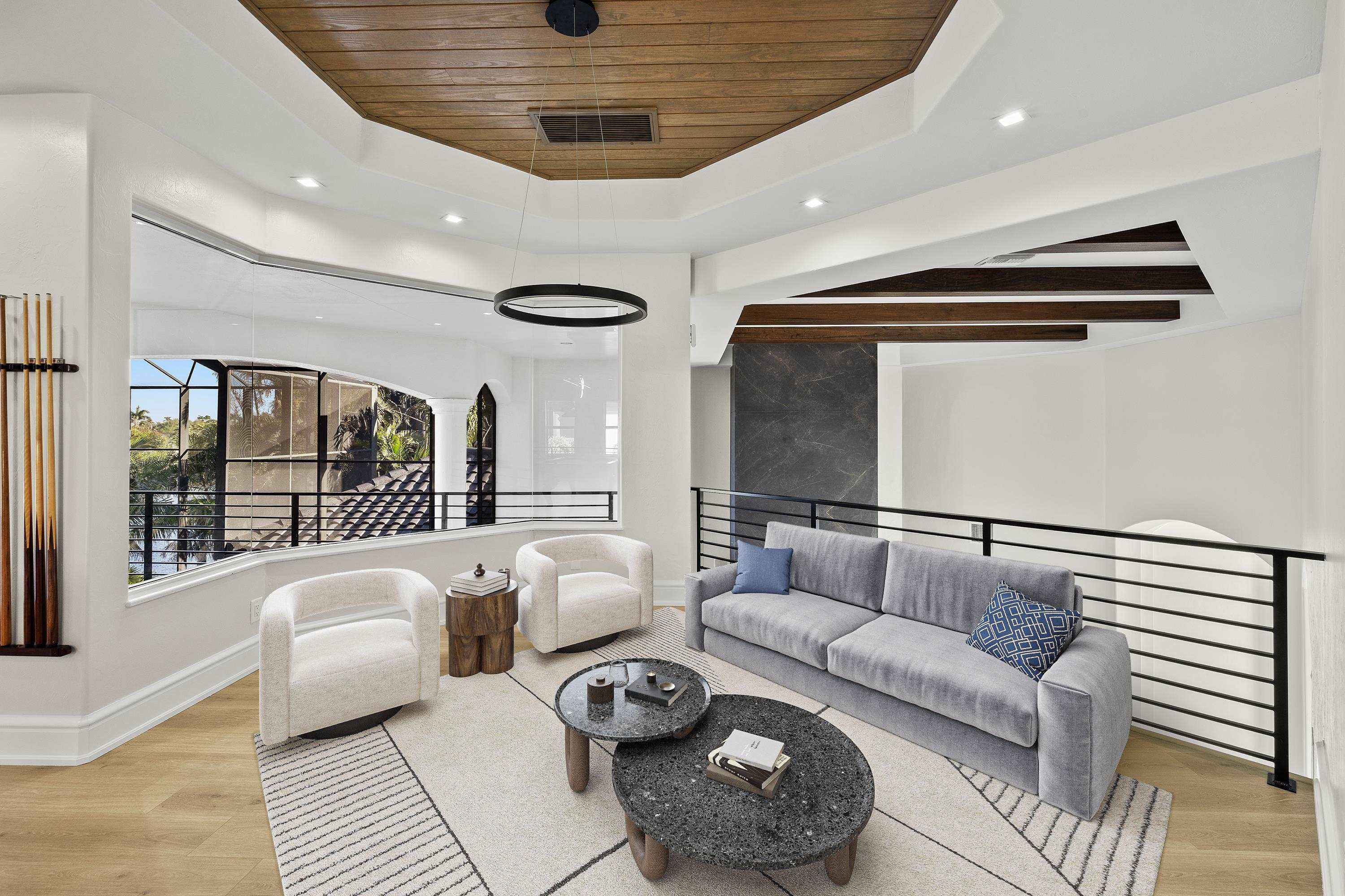 Experience unparalleled waterfront luxury in the prestigious deep-water boating community of Palmetto Point. This exquisite move-in ready residence has been completely reimagined, blending coastal contemporary elegance with upscale finishes and thoughtful design. Inside, an open floor plan with soaring ceilings and expansive windows fills the space with natural light, offering breathtaking views of intersecting canals and stunning western sunsets. The floating ceiling detail adds architectural interest, while light wood tones are beautifully balanced with deeper accents for a sophisticated aesthetic. The gourmet kitchen is a chef’s dream, featuring Wolf appliances, sleek countertops, and custom cabinetry. A temperature-controlled wine room provides the perfect space for collectors. Each of the four ensuite bedrooms offers comfort and privacy, while a media/billiards room ensures entertainment for all. Step outside to a resort-style outdoor living space, complete with wood beamed ceilings, built-in BBQ, two spas, and a large pool—all designed for ultimate relaxation. A concrete floating dock accommodates a 95’ yacht, making this an exceptional retreat for boating enthusiasts. Additional features include a new roof, elevator, A/C workshop, and a three-car garage. This is truly waterfront living at its finest. Don’t miss your opportunity to own this extraordinary home in one of SWFL’s most coveted boating communities!