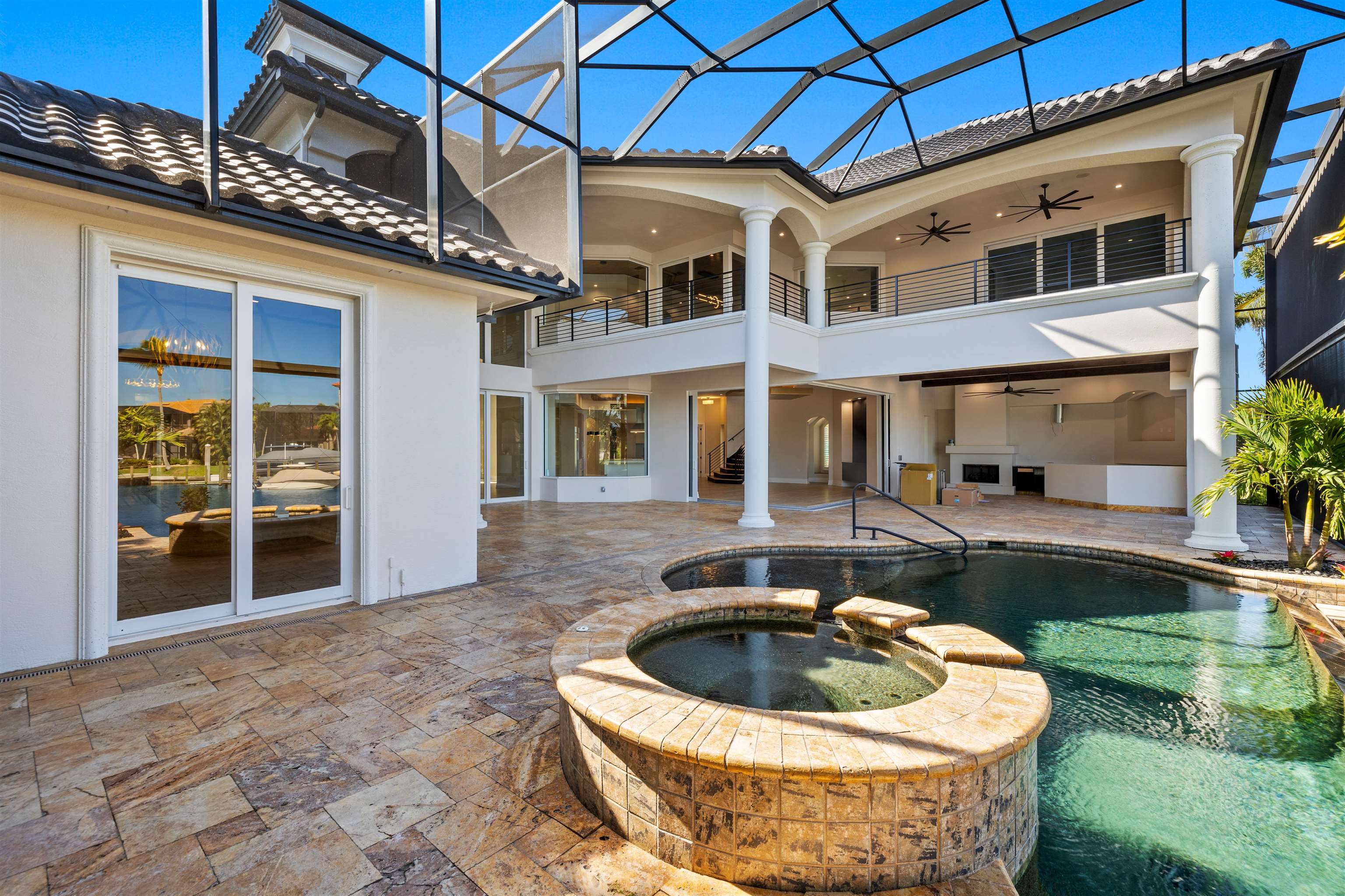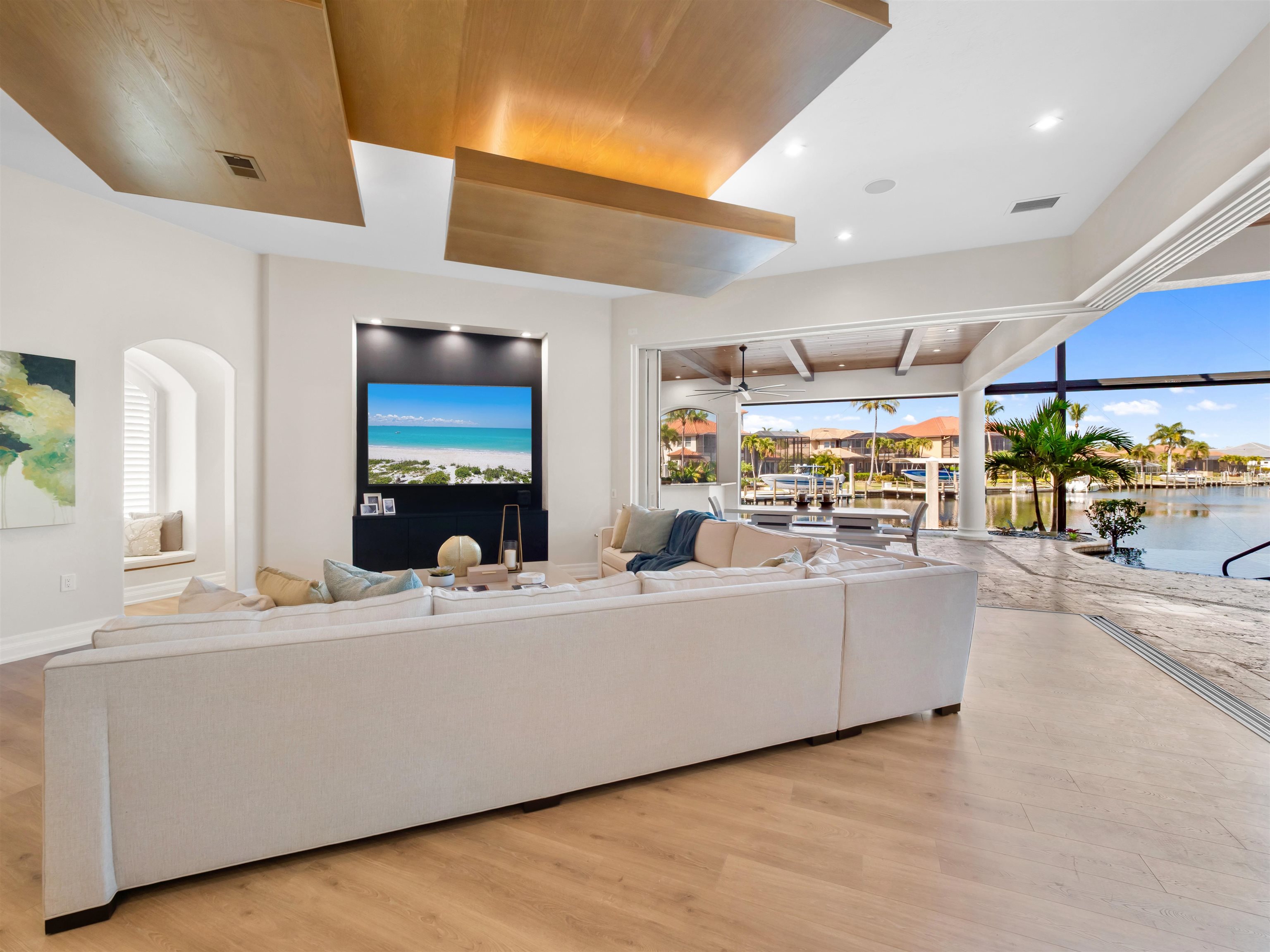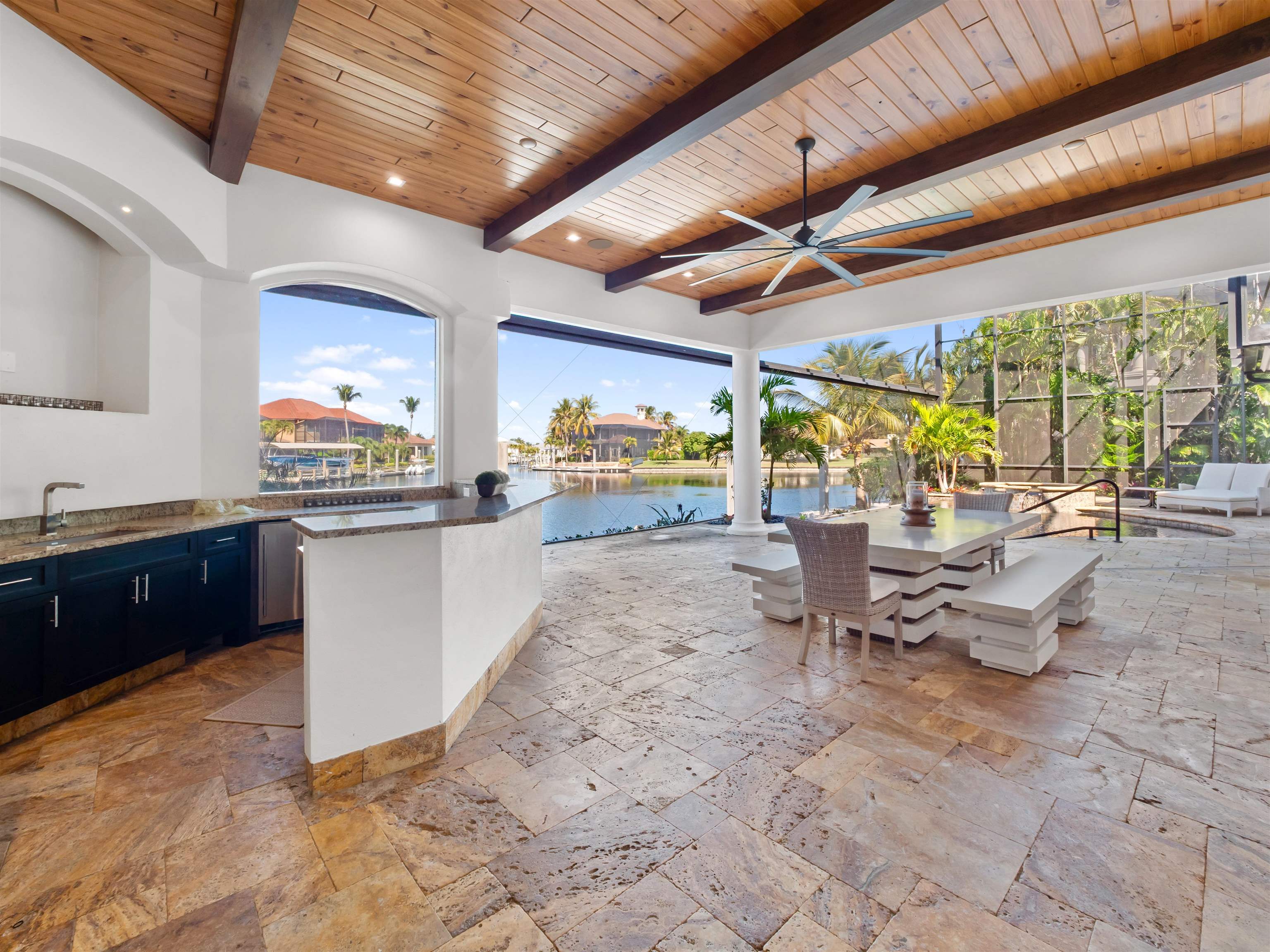 Experience unparalleled waterfront luxury in the prestigious deep-water boating community of Palmetto Point. This exquisite move-in ready residence has been completely reimagined, blending coastal contemporary elegance with upscale finishes and thoughtful design. Inside, an open floor plan with soaring ceilings and expansive windows fills the space with natural light, offering breathtaking views of intersecting canals and stunning western sunsets. The floating ceiling detail adds architectural interest, while light wood tones are beautifully balanced with deeper accents for a sophisticated aesthetic. The gourmet kitchen is a chef’s dream, featuring Wolf appliances, sleek countertops, and custom cabinetry. A temperature-controlled wine room provides the perfect space for collectors. Each of the four ensuite bedrooms offers comfort and privacy, while a media/billiards room ensures entertainment for all. Step outside to a resort-style outdoor living space, complete with wood beamed ceilings, built-in BBQ, two spas, and a large pool—all designed for ultimate relaxation. A concrete floating dock accommodates a 95’ yacht, making this an exceptional retreat for boating enthusiasts. Additional features include a new roof, elevator, A/C workshop, and a three-car garage. This is truly waterfront living at its finest. Don’t miss your opportunity to own this extraordinary home in one of SWFL’s most coveted boating communities!