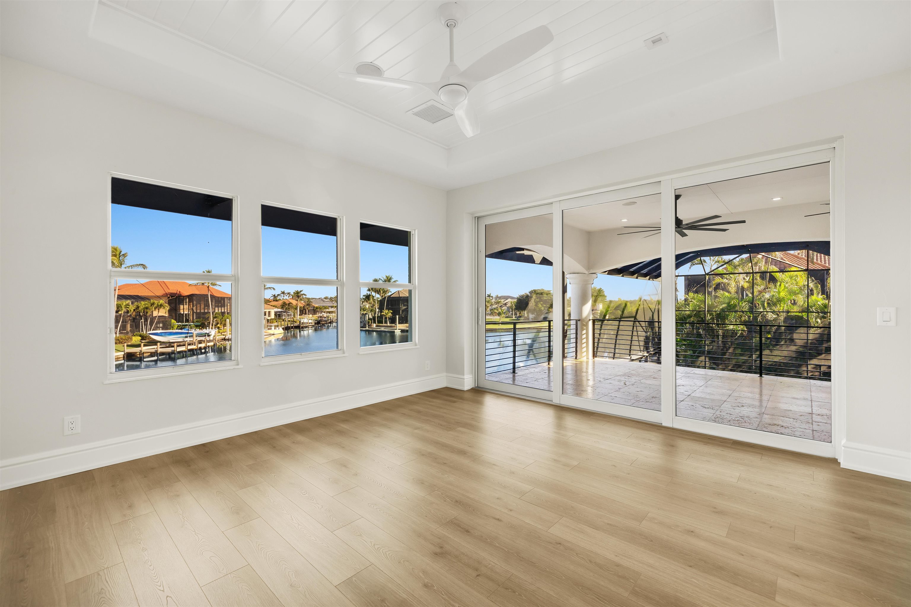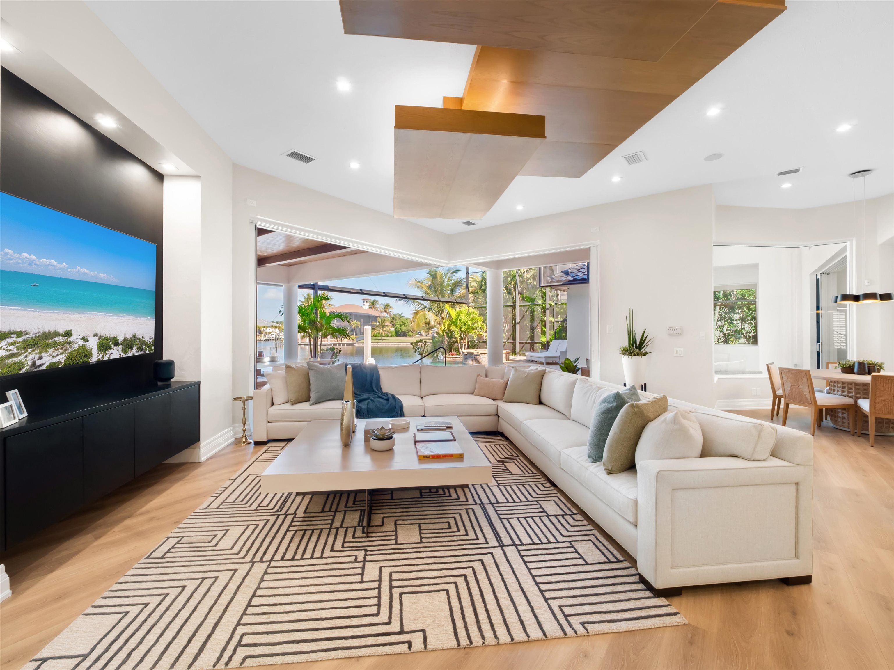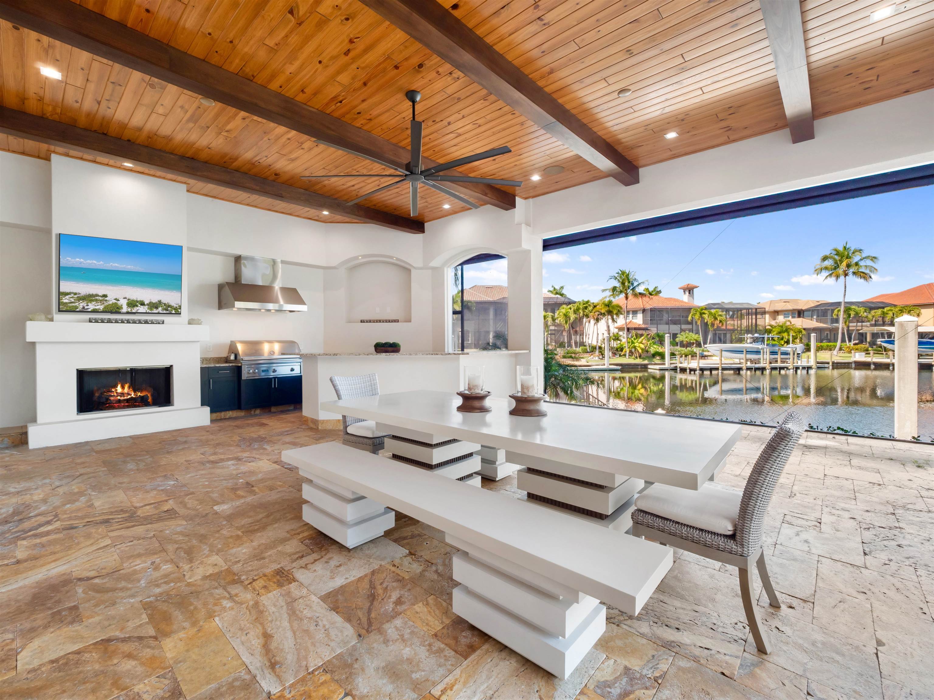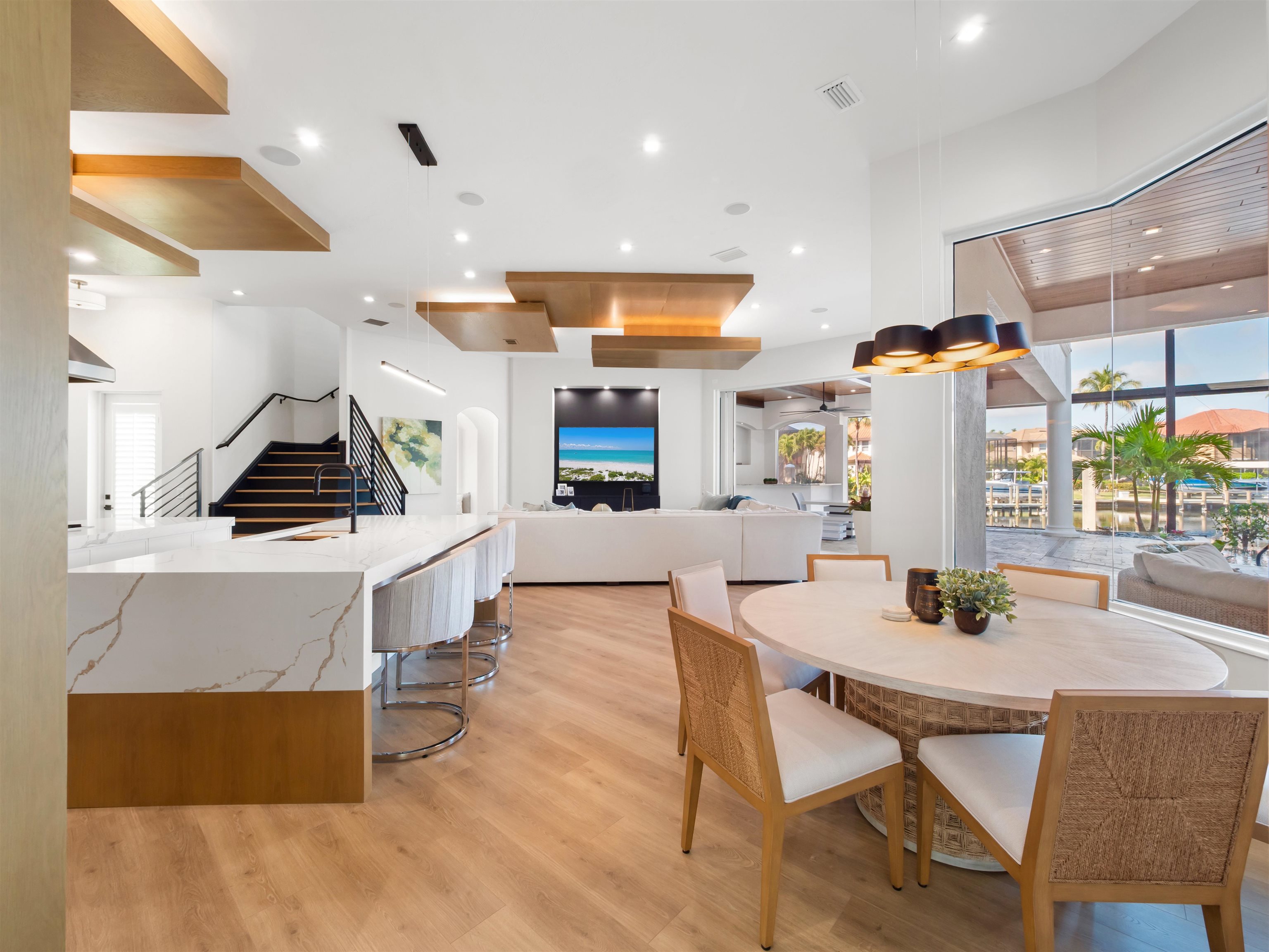 Experience unparalleled waterfront luxury in the prestigious deep-water boating community of Palmetto Point. This exquisite move-in ready residence has been completely reimagined, blending coastal contemporary elegance with upscale finishes and thoughtful design. Inside, an open floor plan with soaring ceilings and expansive windows fills the space with natural light, offering breathtaking views of intersecting canals and stunning western sunsets. The floating ceiling detail adds architectural interest, while light wood tones are beautifully balanced with deeper accents for a sophisticated aesthetic. The gourmet kitchen is a chef’s dream, featuring Wolf appliances, sleek countertops, and custom cabinetry. A temperature-controlled wine room provides the perfect space for collectors. Each of the four ensuite bedrooms offers comfort and privacy, while a media/billiards room ensures entertainment for all. Step outside to a resort-style outdoor living space, complete with wood beamed ceilings, built-in BBQ, two spas, and a large pool—all designed for ultimate relaxation. A concrete floating dock accommodates a 95’ yacht, making this an exceptional retreat for boating enthusiasts. Additional features include a new roof, elevator, A/C workshop, and a three-car garage. This is truly waterfront living at its finest. Don’t miss your opportunity to own this extraordinary home in one of SWFL’s most coveted boating communities!