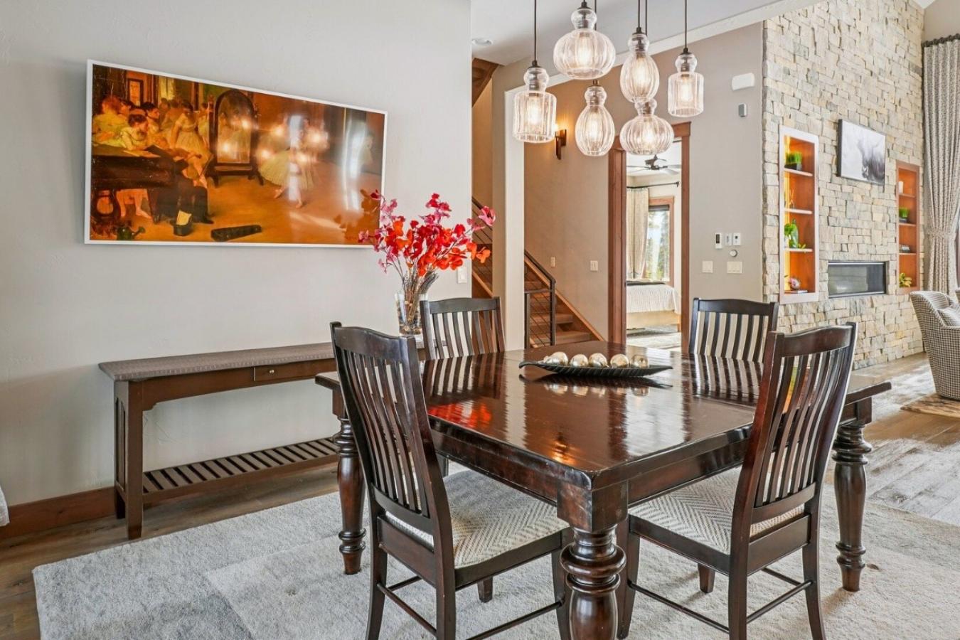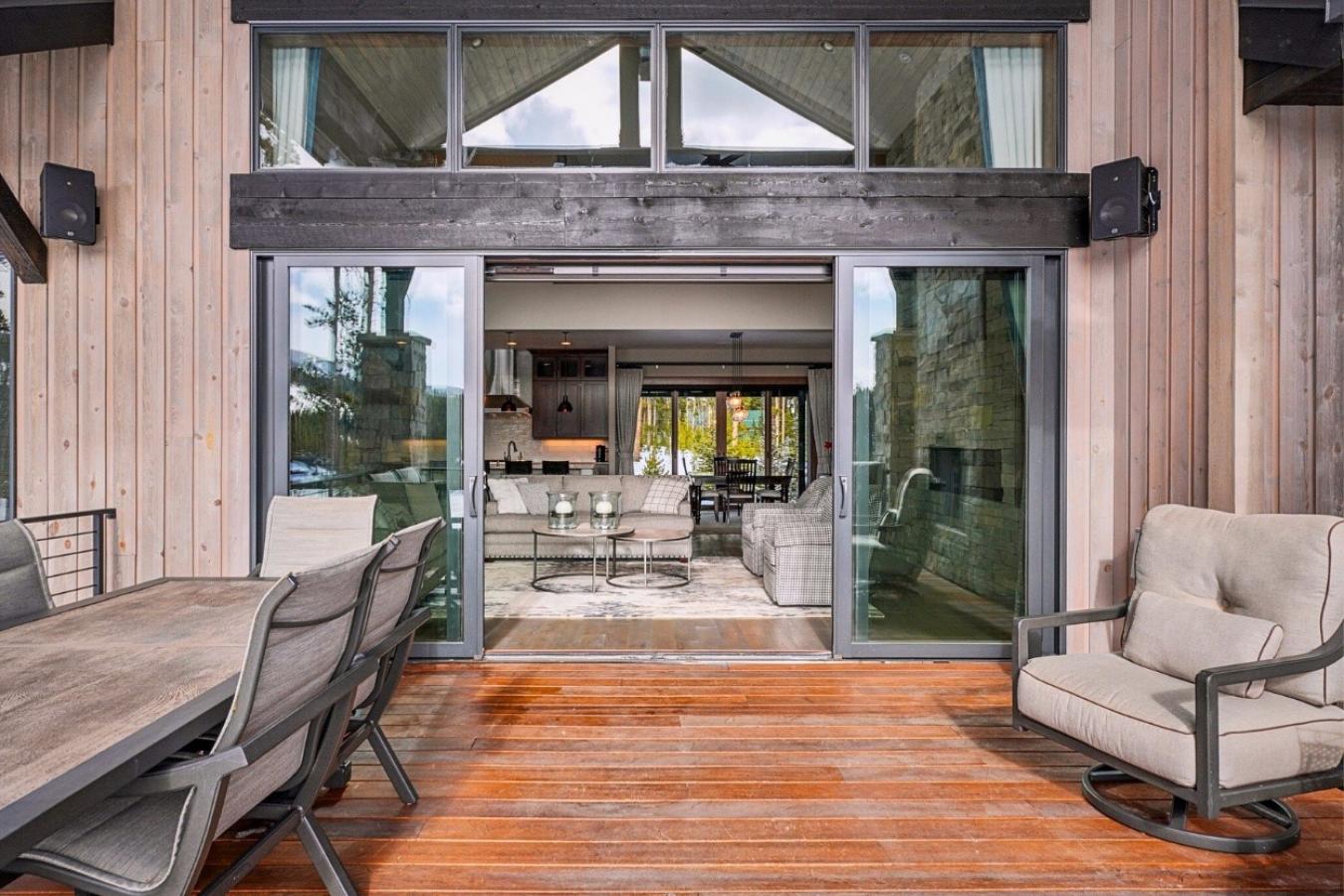 Welcome to the height of mountain modern living on Peak 7. 60 Barton Ridge Drive delivers luxury, privacy, and panoramic views with effortless access to the best of Breckenridge. With 6 bedrooms (including a versatile loft), a separate au pair suite, and multiple living areas, this estate offers ample space for your whole family to create lasting memories. Designed to embrace the landscape, the home features southern exposure and oversized windows that bring the outdoors in. Rich stone accent walls complement real wood floors throughout the main level, while soaring great room ceilings create a sense of grandeur. Directly outside, the main deck expands your living space in the summer months with an alfresco dining area, fireplace, and hot tub. The main-level primary suite serves as a personal sanctuary, featuring a spa-like bath with a soaking tub, dual underlit vanities, and a body-jet shower system. The gourmet kitchen is an entertainers dream, featuring custom cabinetry, a capacious pantry, and an oversized center island that invites guests to gather. Just off the kitchen, the dining area easily accommodates both intimate dinners and large parties. A custom-lit entryway, a unique powder room featuring a wall of rounded river stones, and a mudroom with laundry complete the main level. The lower level offers a second living space in the family room, highlighted by a stone accent wall and walk-out patio. Three spacious guest suites, each with attached full baths, ensure absolute comfort for everyone. Upstairs, a loft with an attached 3/4 bath provides extra sleeping quarters or an inspiring workspace. Above the three-car garage, a private au pair suite features a kitchenette, a lovely bedroom with a private deck, and a full bath-perfect for live-in help, multi-generational living, or extended-stay guests. Situated on a gently sloping 0.92-acre lot, this retreat is conveniently located just 10 minutes from skiing and Main Street.