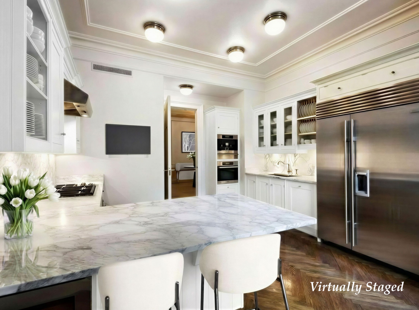 Be the first to enjoy this freshly renovated pristine 2,669 square feet, four-bedroom home located on one of the most charming tree-lined blocks that is anchored by the renowned Soldiers and Sailors Monument and Riverside Park for ones daily enjoyment. This grand and gracious prewar full-service condo is the perfect blend of classic prewar scale with contemporary aesthetics on this picturesque street! The semi-private elevator vestibule opens to a noble entrance foyer that welcomes you to an oversized, grand sun-filled living room that faces south over serene brownstones. The chefs kitchen features a breakfast bar, granite countertops, all Viking stainless steel appliances, dual wall ovens, dual dishwashers, and dual sinks. A formal dining room is tucked away with an amazing corner to light up your meals. Enjoy your private primary suite complete with an oversized marble bathroom featuring double vanity, soaking tub & steam shower. The other remaining three bedrooms have charming views and ample closets. Central, two-zone air-conditioning throughout. High ceilings, hardwood floors, washer/dryer and lots of wall space make it easy to display a vast art collection. This truly amazing home has it all and no board approval is a major plus. Designed by Wallis and Goodwillie in 1920, 317 West 89th Street is a full service, intimate boutique building that enjoys a 24-hour doorman, a live-in resident manager, central laundry room, private storage, bike room, and a new fitness room. It is close to Riverside Park, lively restaurants, public transportation, parking garages and major retail destinations. Welcome to the Upper West Side! Primary residents qualify for condo abatement taxes