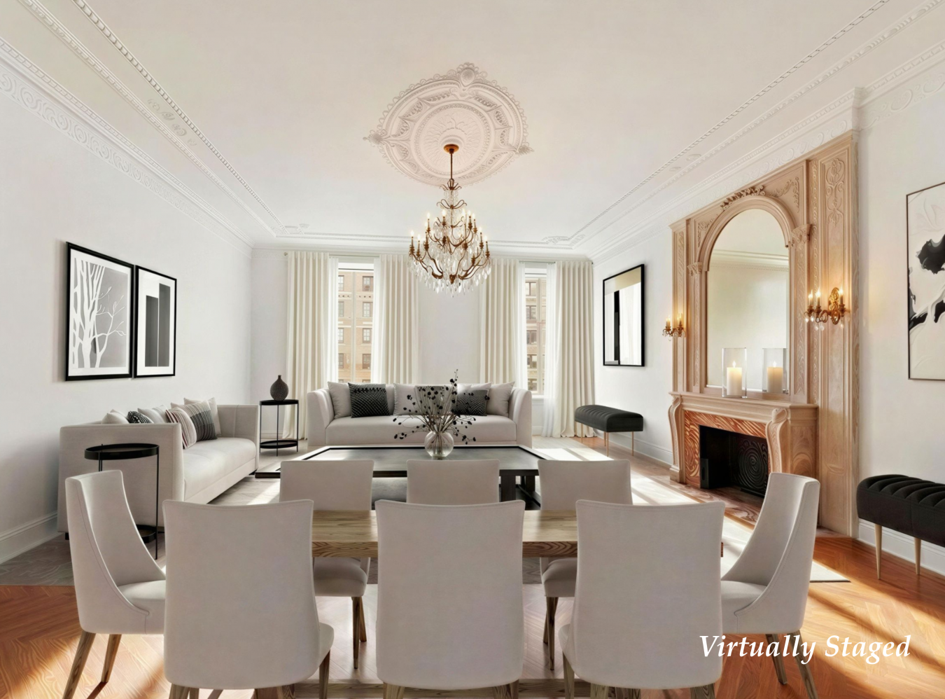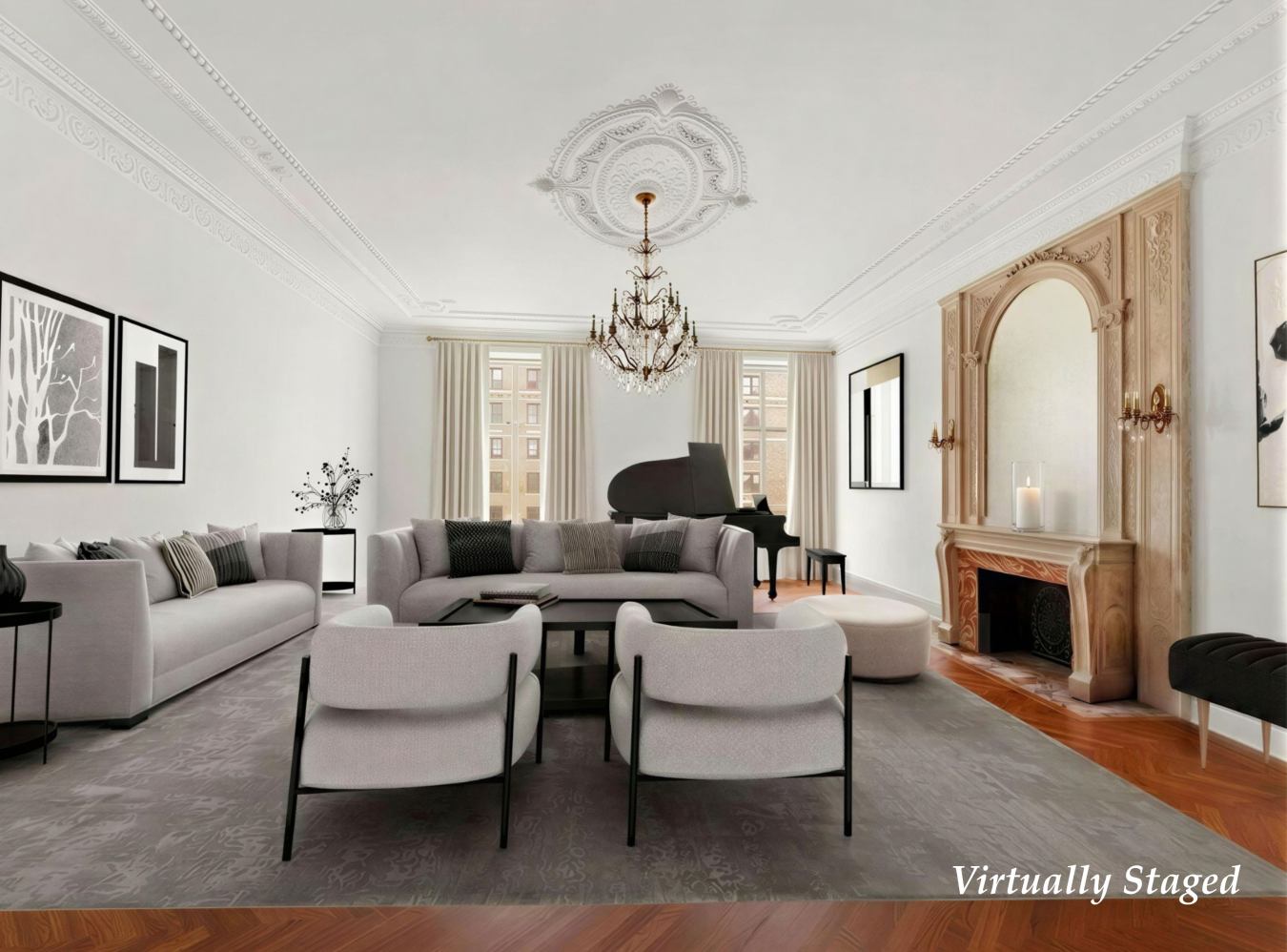 ONE OF A KIND, THE ULTIMATE IN STYLE & LUXURY... Viewings are By Appointment Only, No weekend showings permitted. An architecturally significant and spacious home in an iconic New York City landmark. Gracious living is defined in this one-of-a-kind, two-bedroom, two-and-a-half-bathroom home of over 2,300 square feet. The Apthorp is one of the most renowned buildings on Manhattans Upper West Side. Designed by architects Clinton & Russell, it is a Renaissance Revival-style building and was built for William Waldorf Astor. A dramatic, formal foyer greets you and your guests with a soaring ceiling, original lighting fixtures, bespoke moldings, and floors. The powder room off the entrance foyer features an elegant antique vanity and lighting, completing this drop-dead gorgeous entrance. Double doors lead to the great room featuring soaring ceilings, intricate moldings, oversized windows overlooking the beautiful tree-lined avenue, and a hand-carved, decorative fireplace. This room offers flexibility for various purposes and furniture layouts, with ample space for entertaining and dining, including room for a baby grand piano. It provides impressive volume and timeless style. The primary bedroom suite is expansive, with an in-suite marble bath, with heated floors and a decorative fireplace. This space easily accommodates a seating area for your enjoyment. The second bedroom features windows overlooking the landscaped Apthorp courtyard and an in-suite marble bathroom. It can serve as a dining room, library, or bedroom, depending on your needs. A spacious eat-in kitchen, overlooking the courtyard, features state-of-the-art appliances and custom cabinetry, and includes a separate laundry room with washer/ dryer and additional storage. Oversized windows fill the space with natural light and offer views of the Apthorp Courtyard and West End Avenue, creating a peaceful and inviting atmosphere. High ceilings, original mosaic marble, chevron oak floors, oversized windows, individual heating and cooling, electronic shades, and a Crestron system to control lighting throughout the home are only a few of the features that add a modern touch to old-world charm. Located on prestigious West End Avenue-just steps from Central Park, Riverside Park, and New York Citys vibrant cultural scene-this is a rare opportunity to own a beautifully maintained historic home with exquisite architectural details. THE BUILDING FEATURES: - The Apthorp is a full-service luxury condominium that offers exceptional white-glove services and amenities. - A rare Interior motor court showcasing a private, landscaped courtyard. -The gated, fully staffed entrances on West End Avenue and Broadway lead to four residential lobbies, assuring security and privacy. -The full-service staff, including a resident manager, doorpersons, a live-in superintendent, and a maintenance team, caters to your every need with the utmost convenience and thought. -Mail and packages are hand-delivered to your doorstep. -A parking garage accessible from within the building for a quick exit from the city. AMENITIES: -Residents enjoy exclusive access to the new 6,500-square-foot amenity suite, which includes: -Fitness center -Private spa with treatment rooms, steam room, and sauna. -Yoga studio -Media and game room, -Residents catering kitchen and bar. -Playroom -Laundry -Storage rooms are available. - Pets are allowed NEIGHBORHOOD: A world of culture, fine dining, shopping, and every modern-day convenience surrounds you in this vibrant Upper West neighborhood. Enjoy iconic NYC destinations: Riverside Park & The Hudson River is to your west, and Central Park is to your east. Cultural and Educational Institutions, including the iconic Beacon Theatre, Lincoln Center, The American Museum of Natural History, The Hayden Planetarium & The West Side Community Garden. Broadway and Amsterdam Avenue are filled with cafes, restaurants, and shops within walking distance. Enjoy Zabars: An iconic, historic Upper West Side food institution.