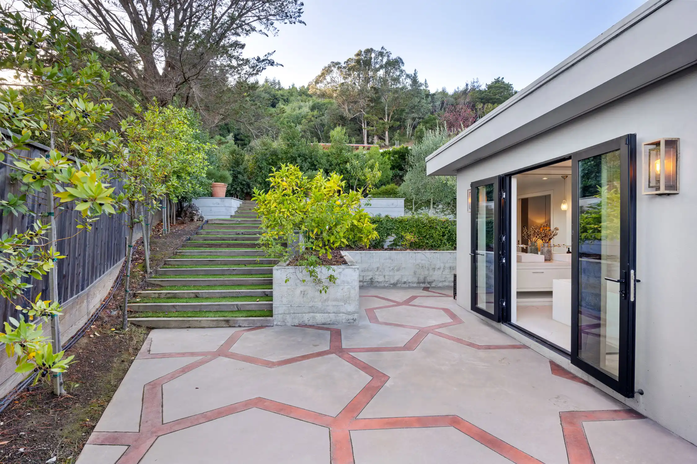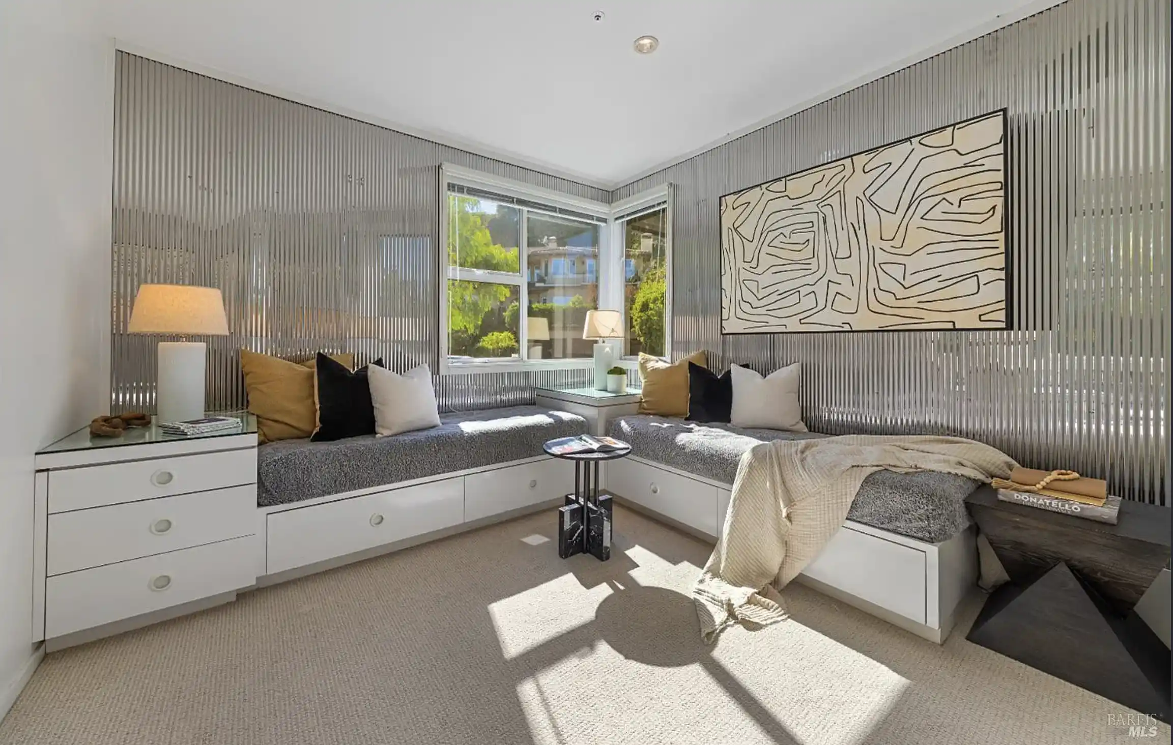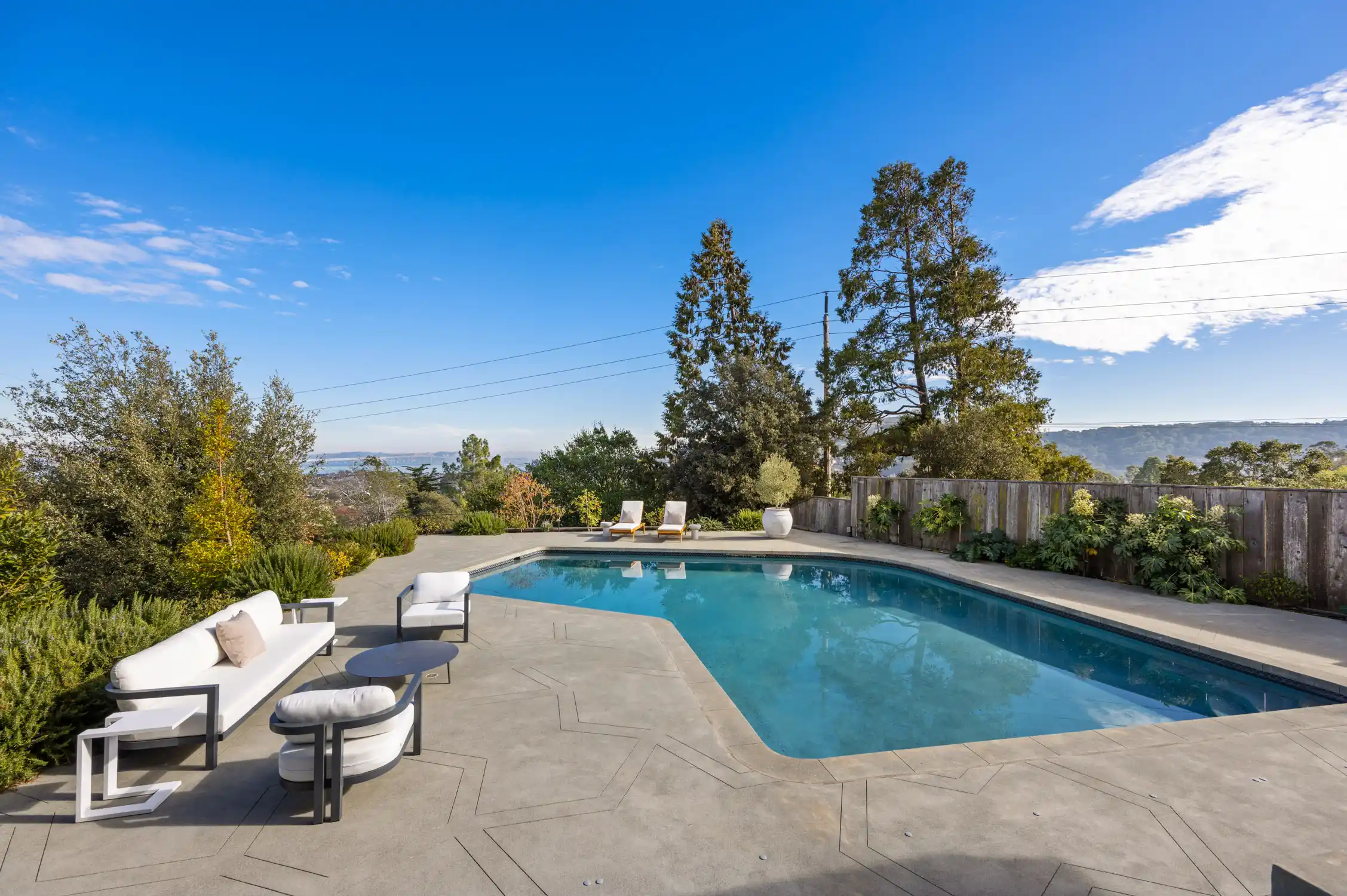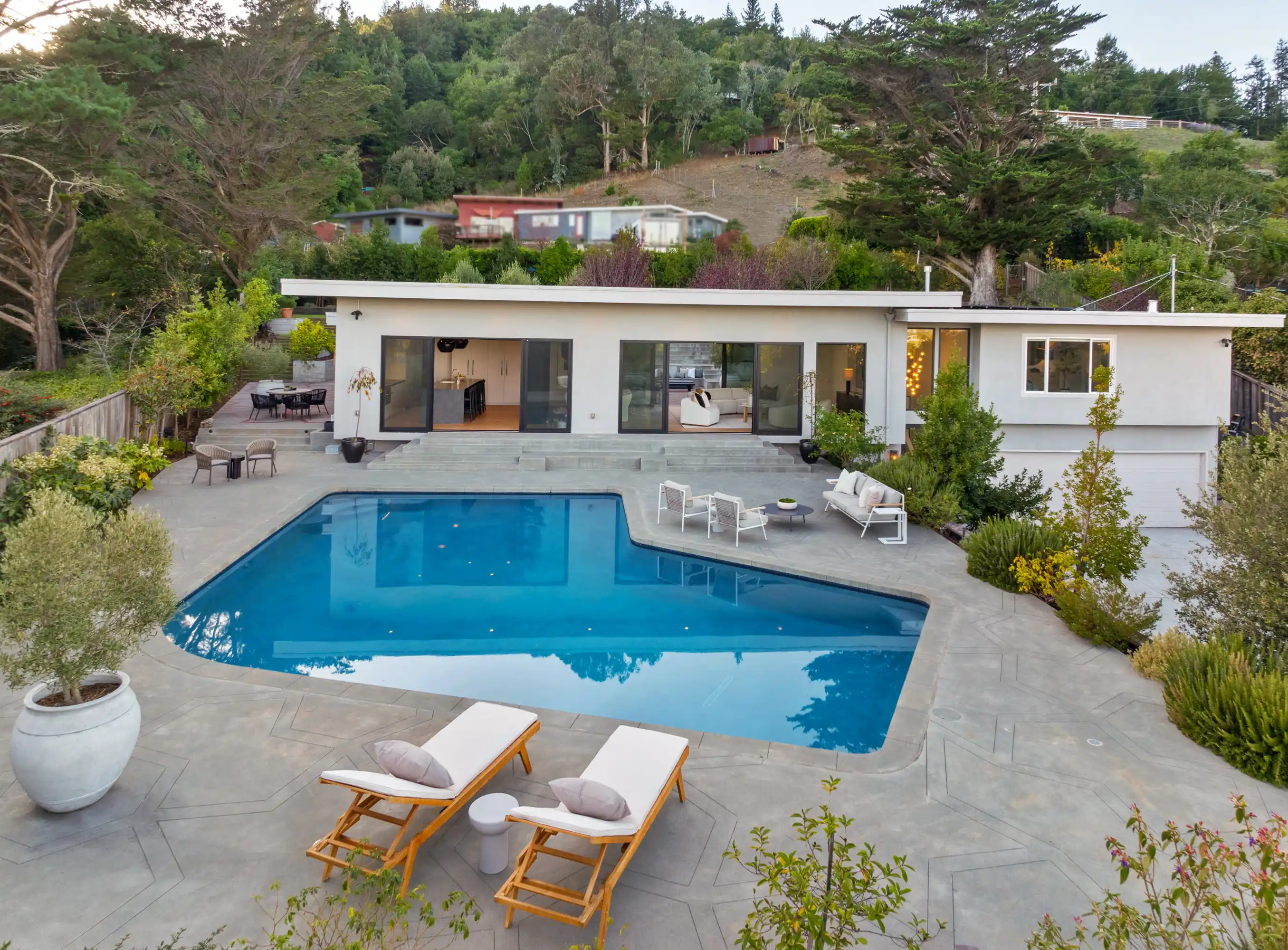 This stylish contemporary retreat captures the essence of casual modern living, showcasing open and airy living spaces, an elevated design aesthetic, resort-style grounds, and picturesque views of the bay and the San Rafael Bridge.This extraordinary home is an entertainer’s dream, offering seamlessly connected indoor/outdoor living spaces that elevate your lifestyle to new heights of luxury.The exceptional outdoor living spaces offer a captivating retreat, featuring a stunning pool with an expansive patio perfect for lounging, a park-like backyard with terraced gardens, intricately designed concrete patios, turf lawns, an olive tree grove, and meandering pathways.Significantly renovated by the current owner, no expense was spared in integrating modern amenities and high-quality finishes to create timeless and chic living spaces.Beautiful light European oak hardwood floors throughout the residence.The main level of the residence features open, light-filled living spaces with seamless access to the outdoors, providing an ideal setting for both everyday living and grand-scale entertaining.The impressive great room features high ceilings, recessed lighting, oversized windows, and Fleetwood sliding glass doors on both sides of the room, providing seamless access to the large backyard and the pool.Flowing effortlessly between the living room and kitchen, the dining area is elegantly defined by a sophisticated built-in shelving unit that serves as both a stylish divider and adds depth and visual interest.Elevating the art of entertaining, the sleek kitchen features an impressive center island with a waterfall edge and seating for five, quartz countertops, two sinks, extensive cabinetry offering ample storage, top-of-the-line appliances, and Fleetwood sliding glass doors opening to the pool and lounge area.The magazine-worthy primary suite is a luxurious sanctuary of unparalleled comfort and sophistication, featuring dual walk-in closets with custom wardrobe systems, French doors opening to the outdoors, recessed lighting, and a lavish primary bathroom.The spa-like primary bathroom showcases elegant flooring, a freestanding soaking tub, a spacious glass-enclosed shower, a vanity with dual sinks and sleek countertops, white custom cabinetry, and French doors that open to a private outdoor seating area.A light-filled ensuite bedroom with a walk-in closet and a stylish bathroom with a stall shower serves as an ideal guest suite.Three comfortable bedrooms with a dedicated full bathroom complete the main level.The entry-level bonus/laundry room offers versatility with a washer and dryer, wash sink, and built-in cabinetry and shelving, making it an ideal space for a home gym.Introducing an unparalleled indoor-outdoor living experience, the park-like backyard with terraced gardens features vibrant trees and lush hedges that create privacy and a tranquil atmosphere, while a multi-level terrace with built-in seating offers a relaxed gathering space, complemented by an elevated dining area perfect for al fresco meals.Attached two car garage and large private driveway with additional parking for guests.Perfectly appointed for an easy lifestyle, this exceptional location offers close proximity to the Corte Madera Town Center, highly acclaimed local schools, Highway 101, world-class hiking and biking trails, and easy access to an array of charming shops and highly desirable dining establishments.