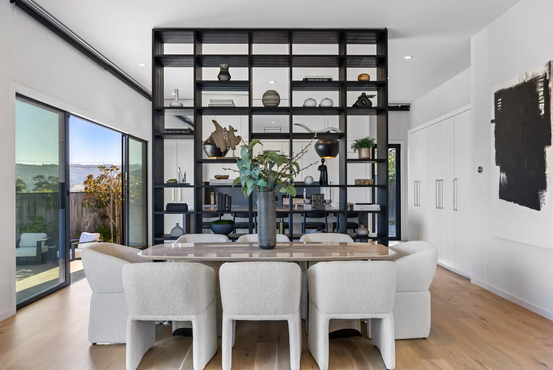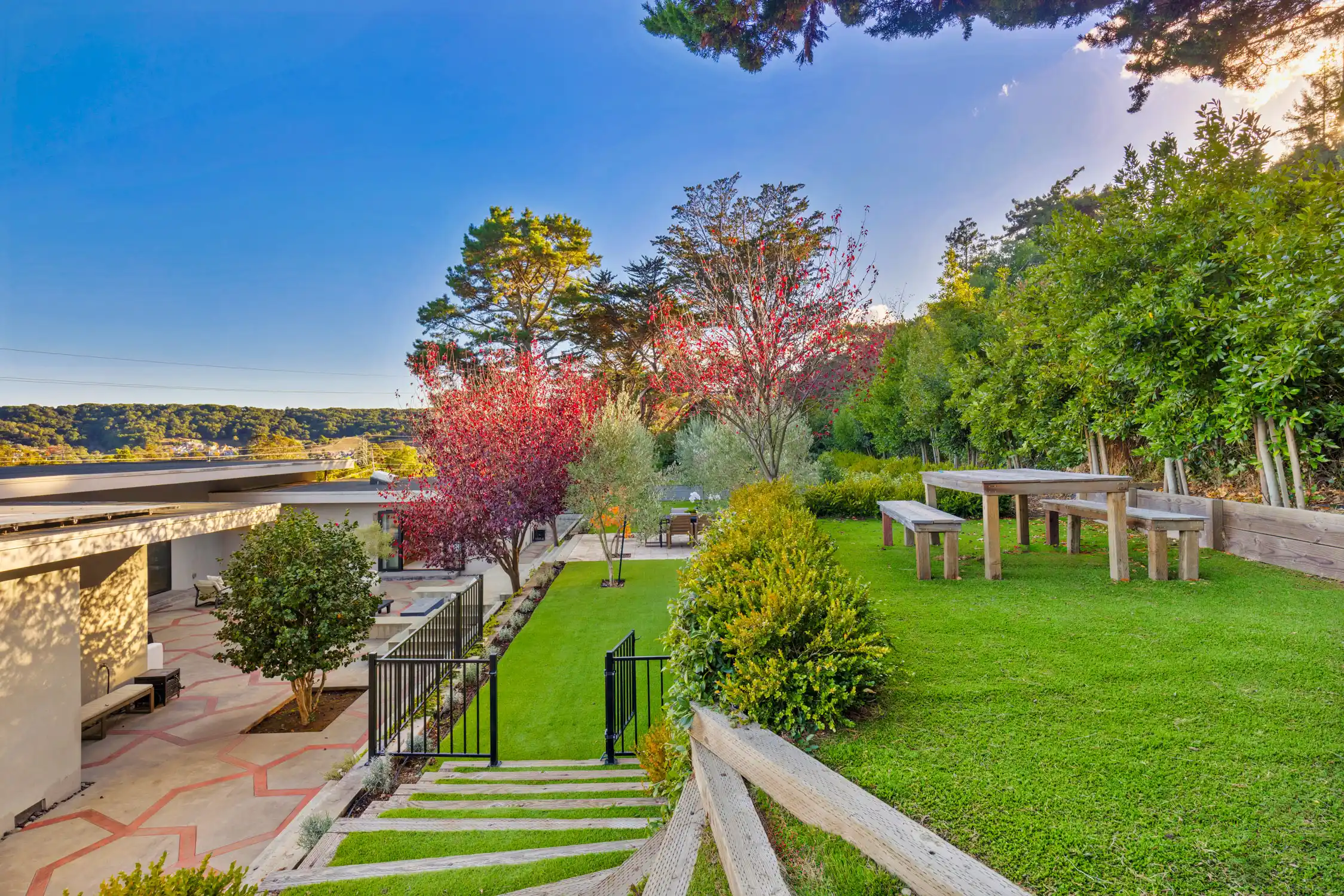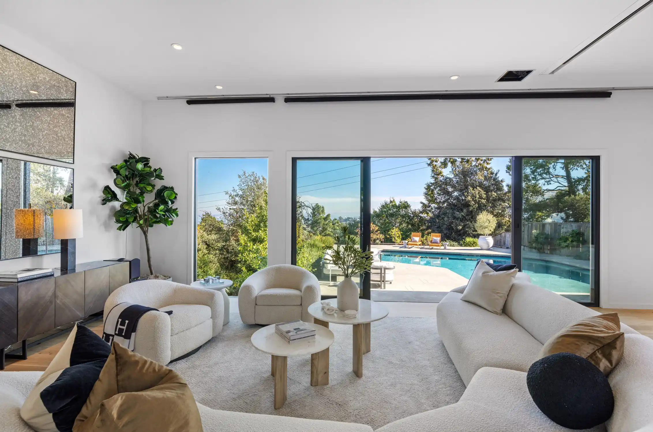 This stylish contemporary retreat captures the essence of casual modern living, showcasing open and airy living spaces, an elevated design aesthetic, resort-style grounds, and picturesque views of the bay and the San Rafael Bridge.This extraordinary home is an entertainer’s dream, offering seamlessly connected indoor/outdoor living spaces that elevate your lifestyle to new heights of luxury.The exceptional outdoor living spaces offer a captivating retreat, featuring a stunning pool with an expansive patio perfect for lounging, a park-like backyard with terraced gardens, intricately designed concrete patios, turf lawns, an olive tree grove, and meandering pathways.Significantly renovated by the current owner, no expense was spared in integrating modern amenities and high-quality finishes to create timeless and chic living spaces.Beautiful light European oak hardwood floors throughout the residence.The main level of the residence features open, light-filled living spaces with seamless access to the outdoors, providing an ideal setting for both everyday living and grand-scale entertaining.The impressive great room features high ceilings, recessed lighting, oversized windows, and Fleetwood sliding glass doors on both sides of the room, providing seamless access to the large backyard and the pool.Flowing effortlessly between the living room and kitchen, the dining area is elegantly defined by a sophisticated built-in shelving unit that serves as both a stylish divider and adds depth and visual interest.Elevating the art of entertaining, the sleek kitchen features an impressive center island with a waterfall edge and seating for five, quartz countertops, two sinks, extensive cabinetry offering ample storage, top-of-the-line appliances, and Fleetwood sliding glass doors opening to the pool and lounge area.The magazine-worthy primary suite is a luxurious sanctuary of unparalleled comfort and sophistication, featuring dual walk-in closets with custom wardrobe systems, French doors opening to the outdoors, recessed lighting, and a lavish primary bathroom.The spa-like primary bathroom showcases elegant flooring, a freestanding soaking tub, a spacious glass-enclosed shower, a vanity with dual sinks and sleek countertops, white custom cabinetry, and French doors that open to a private outdoor seating area.A light-filled ensuite bedroom with a walk-in closet and a stylish bathroom with a stall shower serves as an ideal guest suite.Three comfortable bedrooms with a dedicated full bathroom complete the main level.The entry-level bonus/laundry room offers versatility with a washer and dryer, wash sink, and built-in cabinetry and shelving, making it an ideal space for a home gym.Introducing an unparalleled indoor-outdoor living experience, the park-like backyard with terraced gardens features vibrant trees and lush hedges that create privacy and a tranquil atmosphere, while a multi-level terrace with built-in seating offers a relaxed gathering space, complemented by an elevated dining area perfect for al fresco meals.Attached two car garage and large private driveway with additional parking for guests.Perfectly appointed for an easy lifestyle, this exceptional location offers close proximity to the Corte Madera Town Center, highly acclaimed local schools, Highway 101, world-class hiking and biking trails, and easy access to an array of charming shops and highly desirable dining establishments.