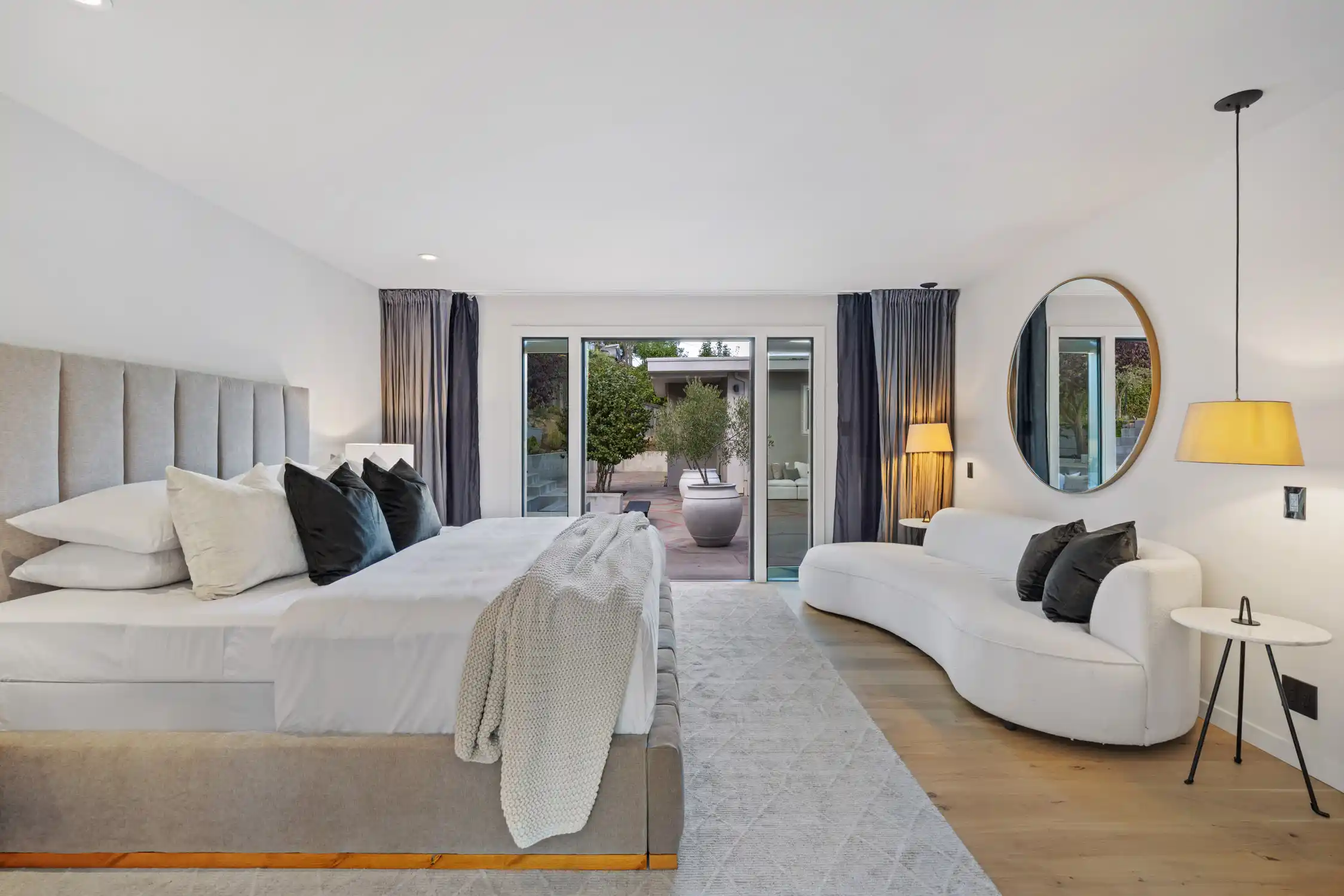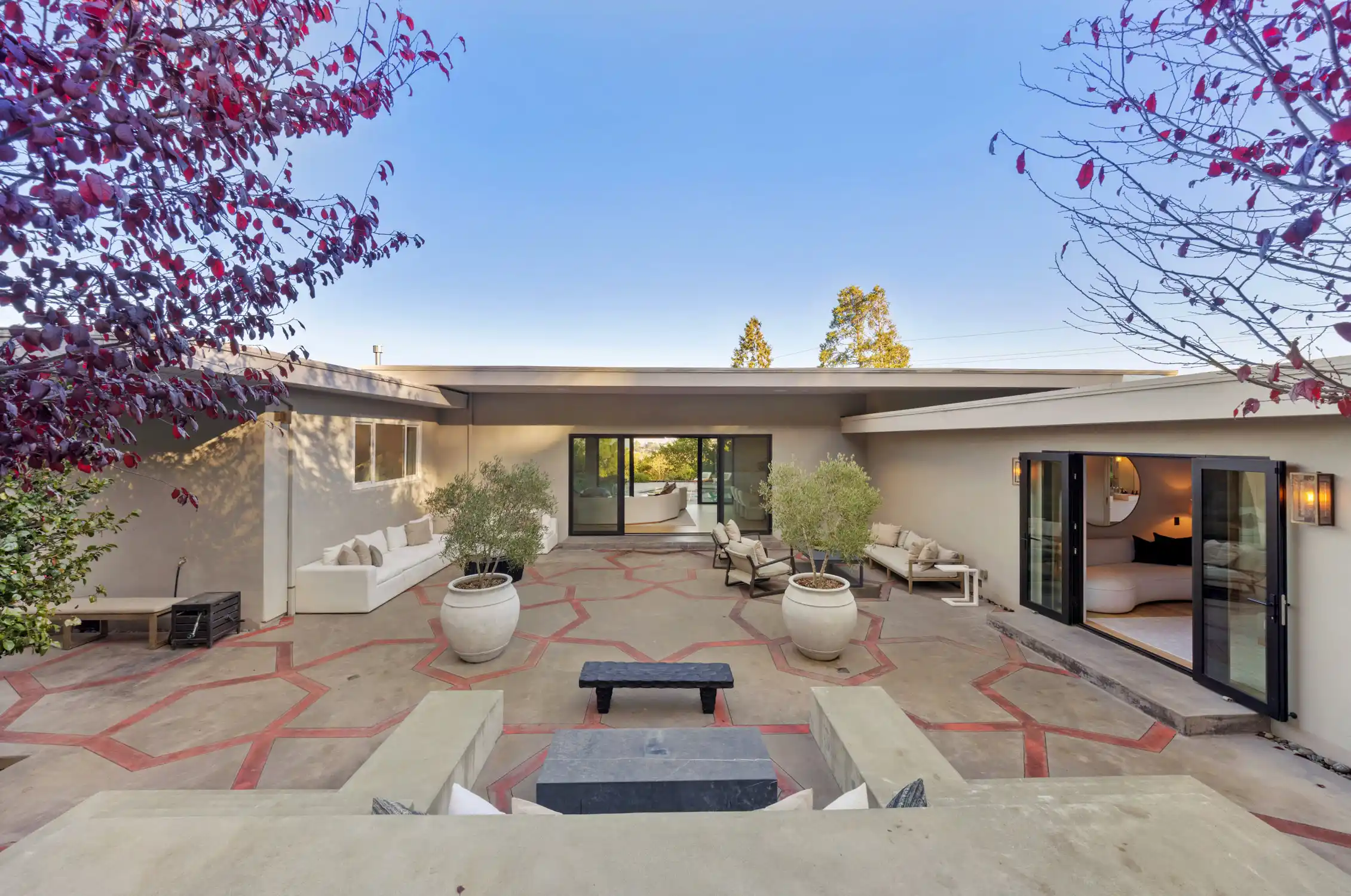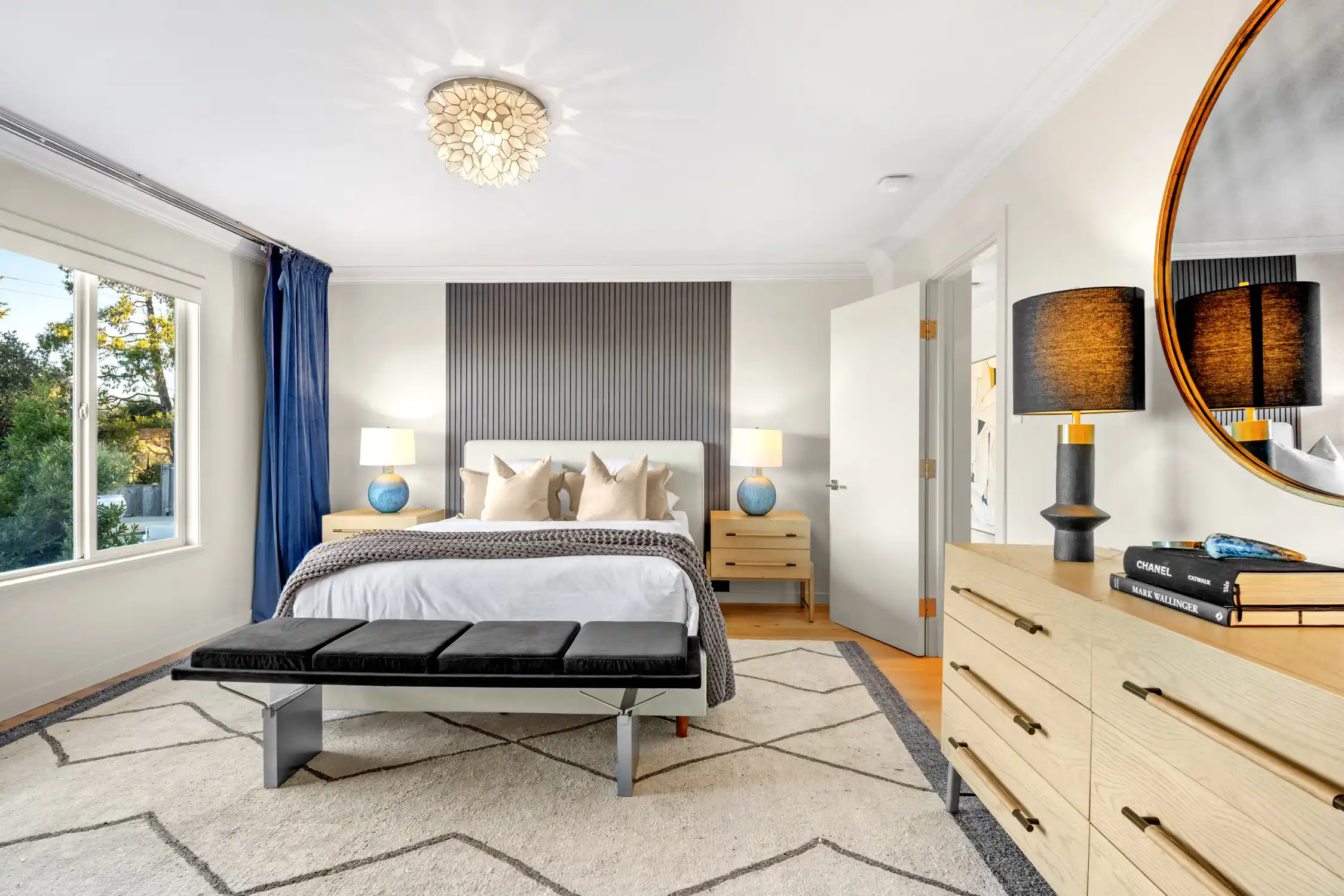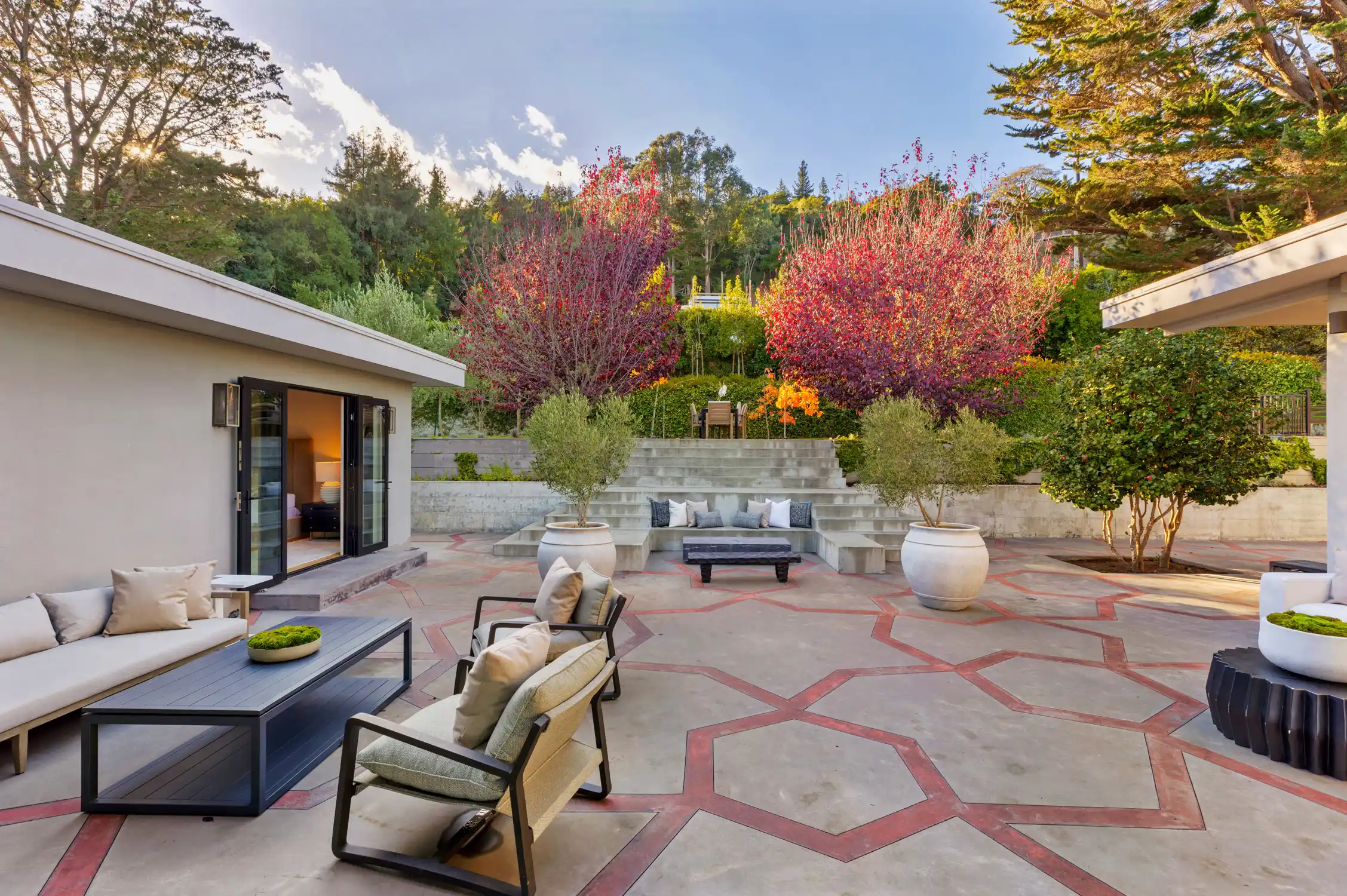 This stylish contemporary retreat captures the essence of casual modern living, showcasing open and airy living spaces, an elevated design aesthetic, resort-style grounds, and picturesque views of the bay and the San Rafael Bridge.This extraordinary home is an entertainer’s dream, offering seamlessly connected indoor/outdoor living spaces that elevate your lifestyle to new heights of luxury.The exceptional outdoor living spaces offer a captivating retreat, featuring a stunning pool with an expansive patio perfect for lounging, a park-like backyard with terraced gardens, intricately designed concrete patios, turf lawns, an olive tree grove, and meandering pathways.Significantly renovated by the current owner, no expense was spared in integrating modern amenities and high-quality finishes to create timeless and chic living spaces.Beautiful light European oak hardwood floors throughout the residence.The main level of the residence features open, light-filled living spaces with seamless access to the outdoors, providing an ideal setting for both everyday living and grand-scale entertaining.The impressive great room features high ceilings, recessed lighting, oversized windows, and Fleetwood sliding glass doors on both sides of the room, providing seamless access to the large backyard and the pool.Flowing effortlessly between the living room and kitchen, the dining area is elegantly defined by a sophisticated built-in shelving unit that serves as both a stylish divider and adds depth and visual interest.Elevating the art of entertaining, the sleek kitchen features an impressive center island with a waterfall edge and seating for five, quartz countertops, two sinks, extensive cabinetry offering ample storage, top-of-the-line appliances, and Fleetwood sliding glass doors opening to the pool and lounge area.The magazine-worthy primary suite is a luxurious sanctuary of unparalleled comfort and sophistication, featuring dual walk-in closets with custom wardrobe systems, French doors opening to the outdoors, recessed lighting, and a lavish primary bathroom.The spa-like primary bathroom showcases elegant flooring, a freestanding soaking tub, a spacious glass-enclosed shower, a vanity with dual sinks and sleek countertops, white custom cabinetry, and French doors that open to a private outdoor seating area.A light-filled ensuite bedroom with a walk-in closet and a stylish bathroom with a stall shower serves as an ideal guest suite.Three comfortable bedrooms with a dedicated full bathroom complete the main level.The entry-level bonus/laundry room offers versatility with a washer and dryer, wash sink, and built-in cabinetry and shelving, making it an ideal space for a home gym.Introducing an unparalleled indoor-outdoor living experience, the park-like backyard with terraced gardens features vibrant trees and lush hedges that create privacy and a tranquil atmosphere, while a multi-level terrace with built-in seating offers a relaxed gathering space, complemented by an elevated dining area perfect for al fresco meals.Attached two car garage and large private driveway with additional parking for guests.Perfectly appointed for an easy lifestyle, this exceptional location offers close proximity to the Corte Madera Town Center, highly acclaimed local schools, Highway 101, world-class hiking and biking trails, and easy access to an array of charming shops and highly desirable dining establishments.
