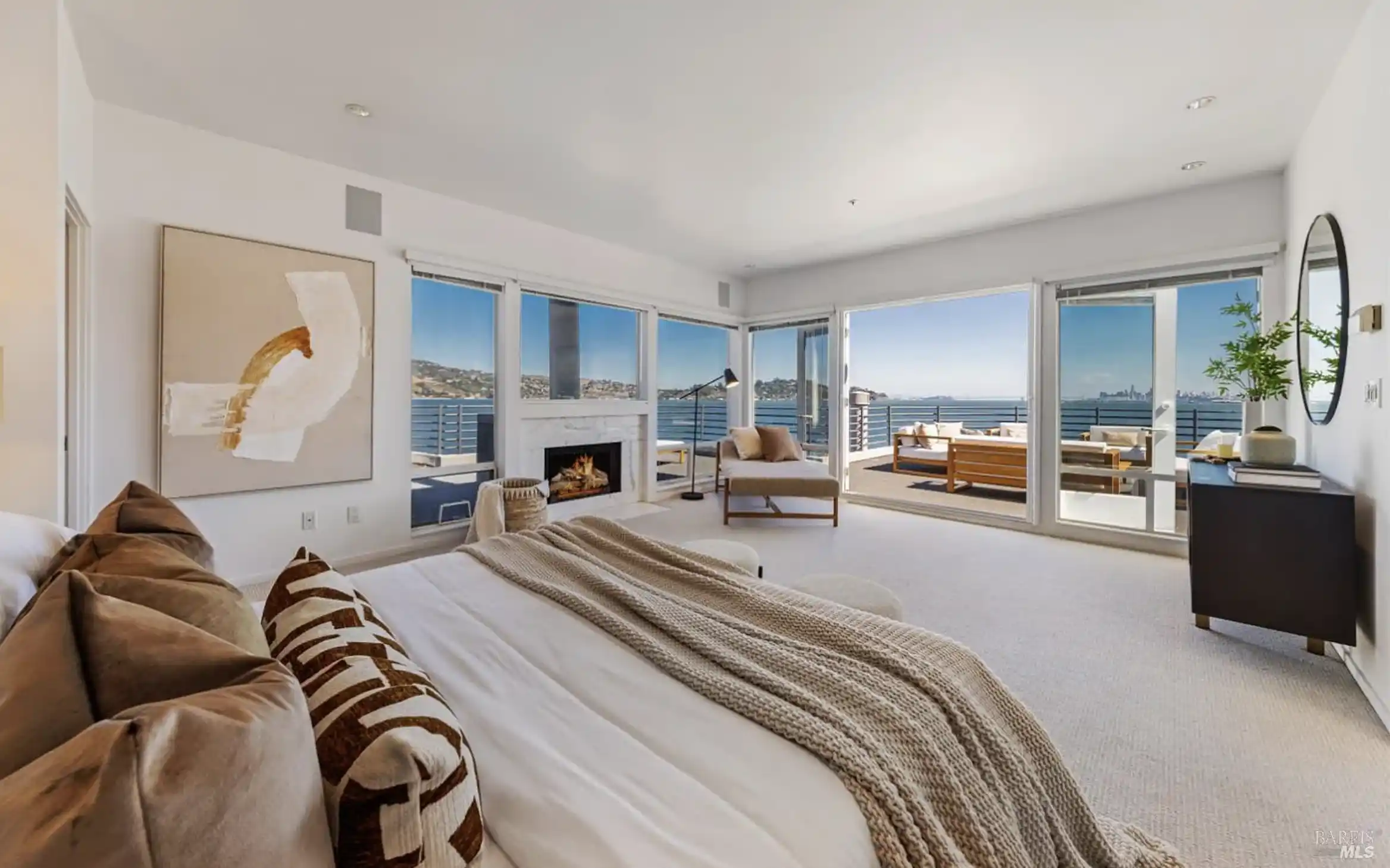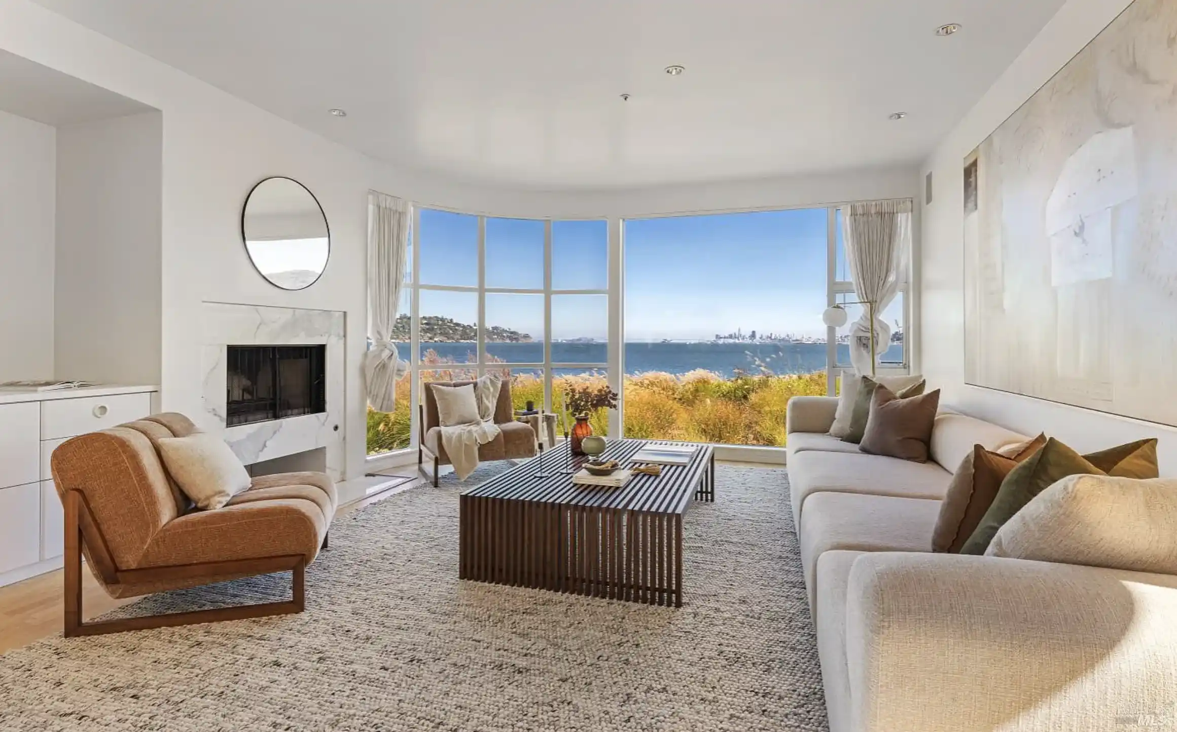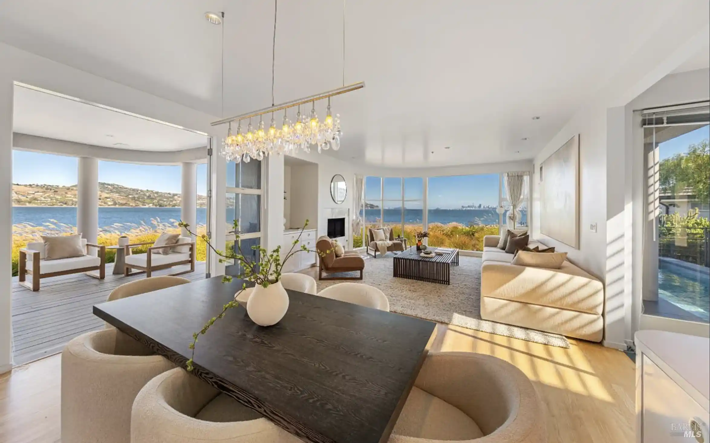Perfectly positioned near the tip of Strawberry Point at the end of a cul-de-sac, this contemporary residence showcases sweeping views across the bay, San Francisco, the Bay Bridge, Sausalito, Belvedere Island, and the Tiburon Peninsula from almost every room. Multiple entertainment decks and an incredible lap pool. The light-filled living room features a wall of oversized windows that frame sweeping views, hardwood floors, and a fireplace. The dining room features built-in cabinetry, a striking chandelier, and French doors opening to the covered deck. The inviting family room features a curved glass wall and windows that capture panoramic views, hardwood floors, a fireplace, and access to the outdoors. Open kitchen with a walk-in pantry, a peninsula with counter seating, a center island, two sinks, and an adjacent casual dining area. Attached one bedroom unit with a Murphy bed, kitchenette, private entrance, walk-in closet, and a full bath. Two comfortable bedrooms, a full bath, and a powder room complete the main level. A curved staircase ascends to the upper level of the residence, leading to the primary suite and a guest bedroom. The primary suite features a fireplace, a walk-in closet, French doors that open to the roof deck, a lavish primary bath, and captivating.