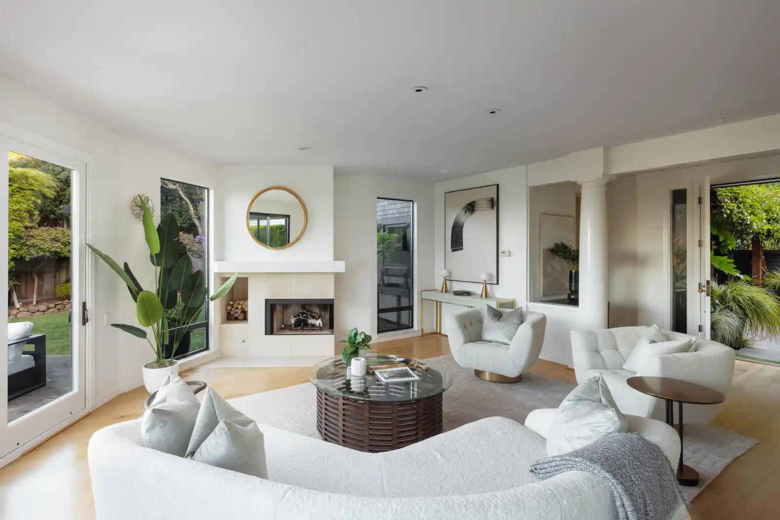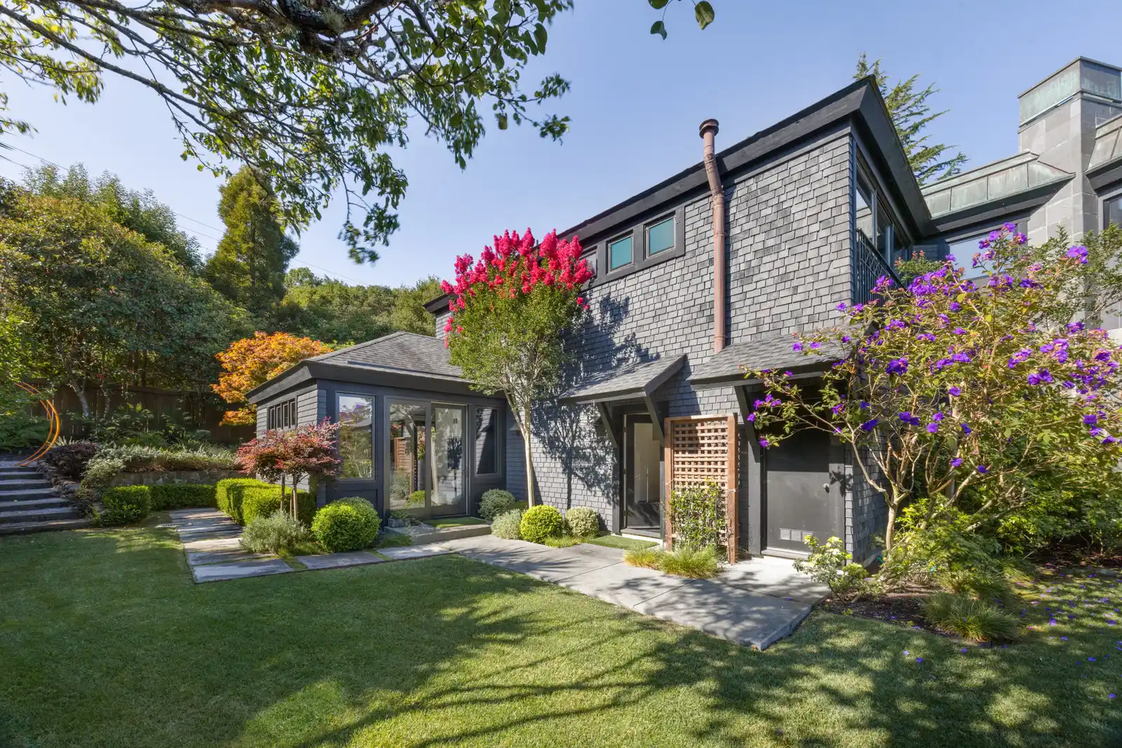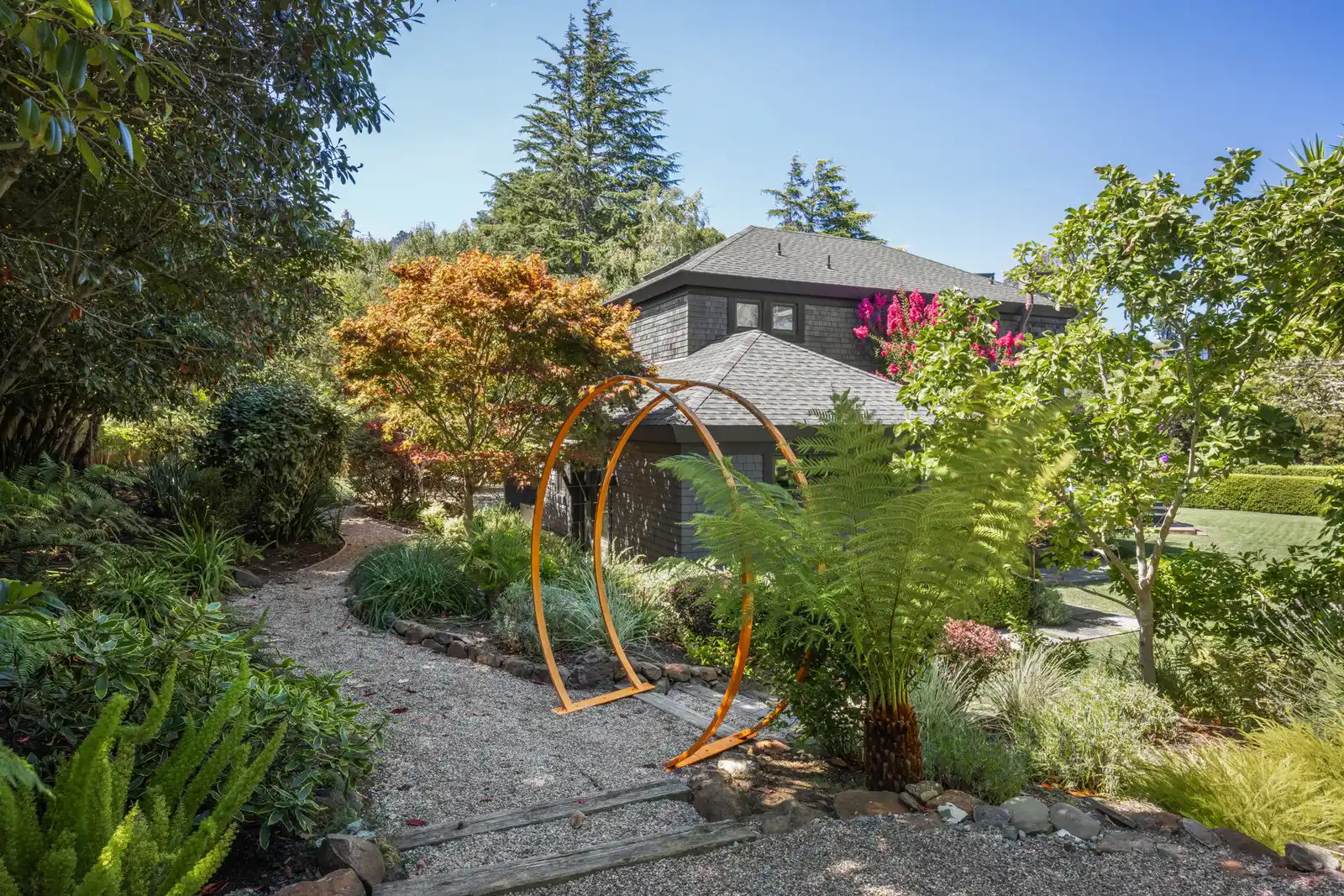 Situated amongst an exclusive enclave of custom homes in the sought-after Seafirth Estates community, this contemporary gated residence offers outstanding outdoor living spaces and captivating views of the San Francisco Bay and the San Rafael Bridge.The exclusive Seafirth Estates community offers a community swimming pool, sport court, private beach, and dock with bay access.Enriched by a seamless blend of transitional and contemporary elements, this stunning home creates a balanced and timeless aesthetic, providing comfortable living for every lifestyle.This private and gated residence is an entertainer’s dream, offering an unparalleled indoor-outdoor living experience featuring picturesque grounds, a sprawling level lawn, an entertainment patio, a spa, a beautiful floral garden with raised beds, manicured landscaping, a meditation garden, and meandering pathways, creating an idyllic setting for both entertaining and everyday living.Beautiful light hardwood floors throughout the main level enhance the airy and refined ambiance throughout the home.The stylish and inviting living room features recessed lighting, a wall of built-in shelving, a fireplace with stone surround, oversized windows, stunning bay views, and sliding glass doors opening to the private backyard.Experience elevated functionality and style in the stunning chef’s kitchen, boasting quartz countertops, a large peninsula with counter seating, custom cabinetry, and high-end stainless appliances including a Sub-Zero refrigerator, KitchenAid double ovens, a Miele dishwasher, and a Thermador 6-burner gas cooktop.The adjacent lounge/family room offers an inviting space for family and guests to relax and socialize.The dining room features a wood-burning fireplace, built-in cabinetry, and sliding glass doors that capture incredible bay views.A chic wet bar with a sink and built-in cabinetry enhances the ease of entertaining.The upper level of the residence features a comfortable primary suite, a media/family room, an office, and two ensuite bedrooms.The primary suite features hardwood floors, oversized windows framing stunning bay views, and a walk-in closet; the spacious primary bathroom features a vanity with dual sinks, a soaking tub, and a stall shower.A stunning and private guest suite with a separate entrance features hardwood floors, open beamed high ceilings, and a stylish bathroom with a stall shower.Two-car attached garage and motor court for additional parking.