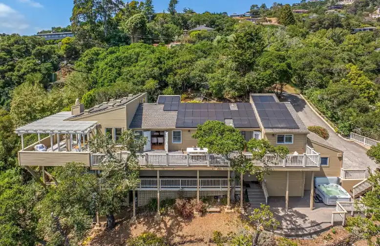 Situated on over half an acre, this exceptional residence showcases spacious, light-filled living spaces, an incredible floor plan, and picturesque views of Richardson Bay, the Belvedere Lagoon, and Sausalito. Enriched by a seamless blend of transitional and contemporary elements, this stunning home creates a balanced and timeless aesthetic, providing comfortable living for every lifestyle.This private residence is a haven for entertainers, featuring an expansive entertainment deck with a pergola and swing, a covered deck, a spacious patio, a large spa, mature landscaping, and meandering pathwaysThe main level of the residence unfolds with a series of light-filled rooms, creating an ideal setting for both everyday living and grand-scale entertaining.Beautiful oak hardwood floors throughout the residence.The dramatic living room exudes warmth and sophistication, featuring soaring vaulted ceilings, a fireplace with limestone surround, oversized windows framing scenic views, and French doors opening to the entertainment deck.The formal dining room features a cove ceiling and French doors that open to the entertainment deck, creating a natural flow between the kitchen and living room for effortless entertaining.Elevating the art of entertaining, the chef’s kitchen features limestone countertops, an impressive center island, extensive cabinetry for abundant storage, views of the Belvedere Lagoon, French doors opening to the entertainment deck, and high-end appliances including a Viking 6-burner gas cooktop, Thermador double ovens, and a KitchenAid refrigerator, dishwasher, and trash compactor. Adjacent to the kitchen is the large casual dining area, featuring a vaulted ceiling and a built-in desk with white cabinetry.Just steps down from the kitchen and casual dining area, the inviting and oversized family room features vaulted ceilings, recessed lighting, a fireplace, and French doors that open to a sunny flagstone patio.A powder room, a full bathroom, and a bedroom that serves as an ideal guest retreat, or a home office, complete the main level of the residence.The lower level features a comfortable primary suite, three additional bedrooms, two full bathrooms, and a laundry room.The primary suite features a walk-in closet with custom wardrobe system and access to the covered deck; large primary bathroom with dual sinks, a soaking tub, a stall shower, and a private balcony.Attached two car garage and large driveway with additional parking.Solar panels and Tesla power walls.Located in the sought-after Reed School District and only a few minutes to downtown Tiburon’s shopping, restaurants, waterfront pathways, and San Francisco and Angel Island ferry service Live the outdoor life in Tiburon, with access to private open space and mountain-top trails only moments from your front door.