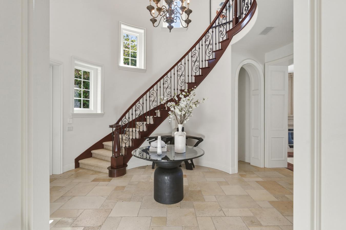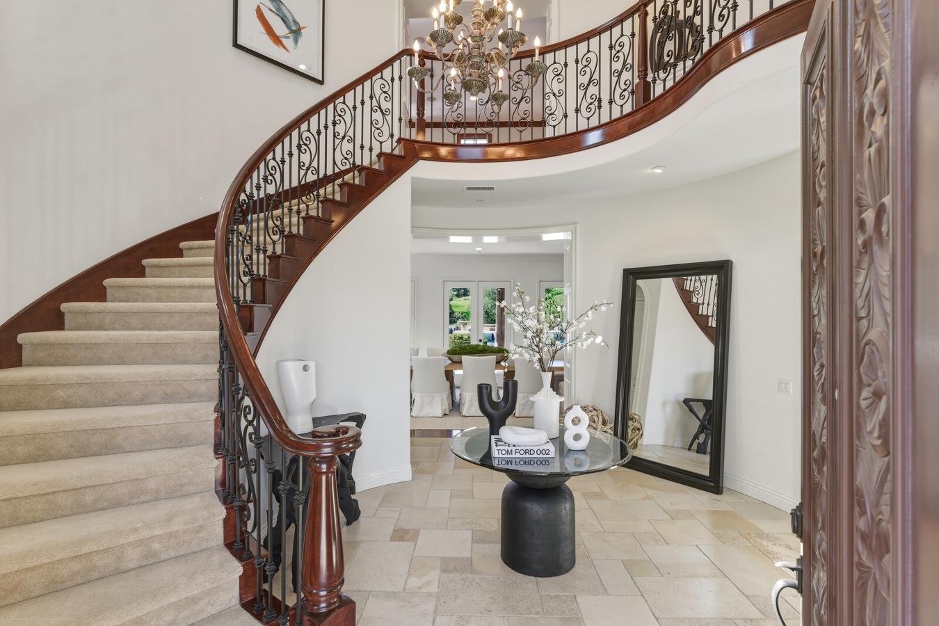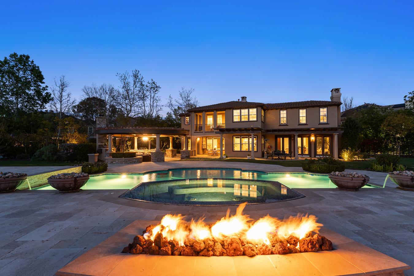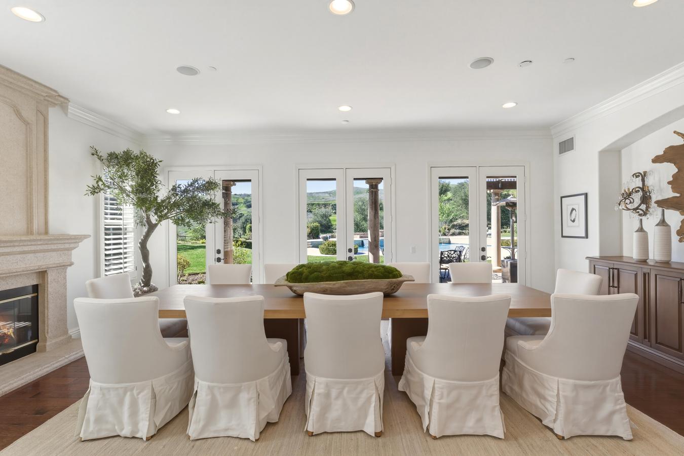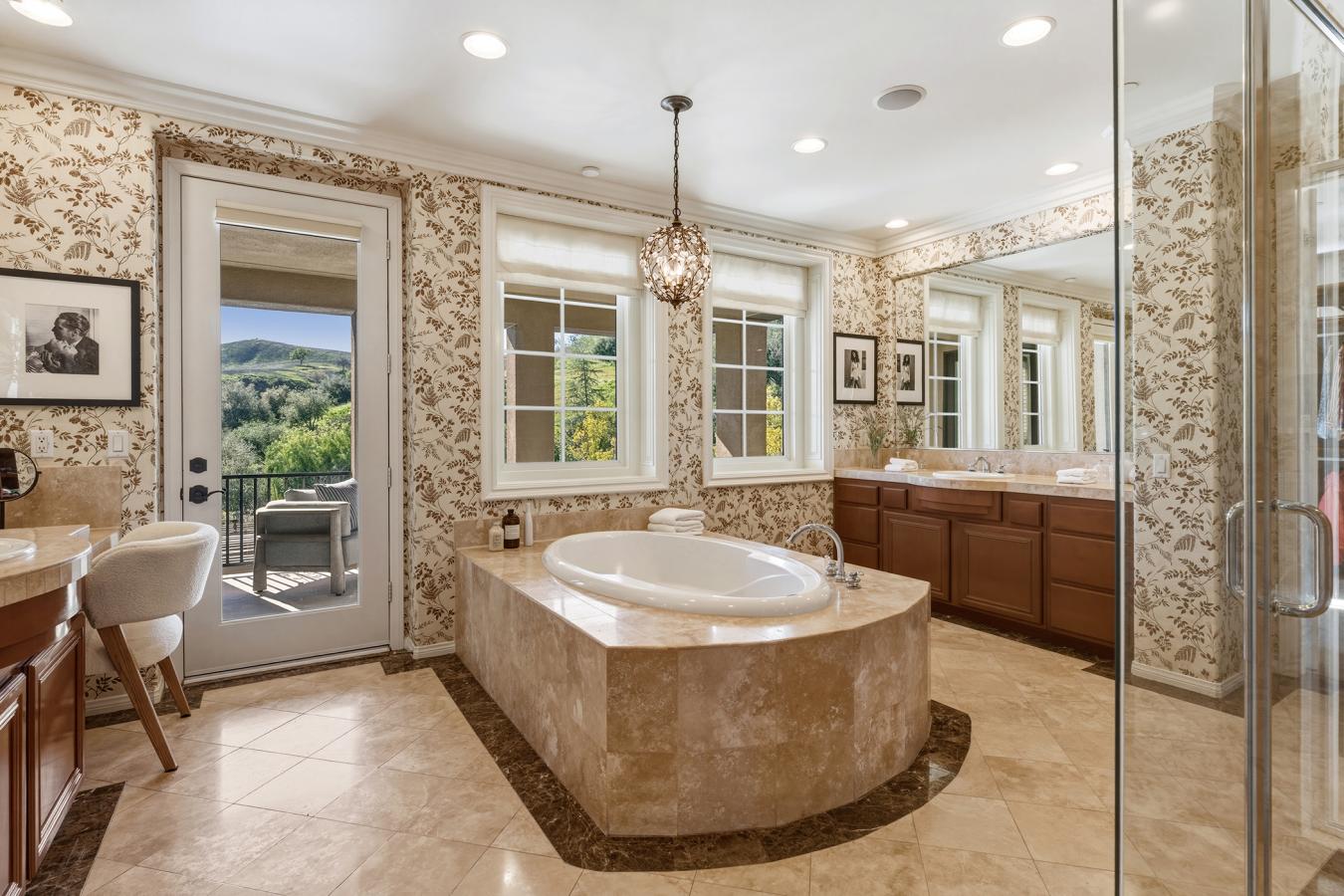 Located at the end of a quiet cul-de-sac within the prestigious guard-gated community of Mont Calabasas, this exceptional estate captures sweeping panoramic rolling hill views from nearly every vantage point. Set on an expansive 20,980 sq ft lot, the 4,994 sq ft residence blends refined design, thoughtful upgrades, and seamless indoor-outdoor living. A welcoming courtyard entry leads into a dramatic foyer highlighted by a grand spiral staircase, custom stone flooring, and architectural archways that lead into the formal dining room. The generous dining room features a fireplace and three sets of French doors showcasing the incredible view and is perfect for entertaining large groups. A cozy paneled den with outdoor access offers a respite to enjoy a glass of wine or catch up on work. The heart of the home is the open-concept eat-in kitchen and family room, designed to frame the breathtaking views. The chefs kitchen features a large center island, Viking appliances, a Sub-Zero glass door refrigerator/freezer, double ovens, and two dishwashers. The adjacent double-sized family room, enhanced with beamed ceilings, a fireplace, and built-ins, opens directly to the backyard, creating effortless flow for gatherings large and small. A large en-suite guest room that opens to the front patio as well as a powder room complete the first floor. Upstairs, the primary suite offers a private sanctuary with a fireplace, a large seating area, and a view balcony. The spa-like primary bath features separate vanities, a separate tub and shower, a spacious walk-in closet, and access to the large balcony overlooking the pool. Three additional en-suite bedrooms and a versatile bonus room provide flexibility for a media room, game room, or additional lounge space. The generous laundry room is also on the second floor. The outdoor setting is a true retreat. Completed in 2015, the resort-style backyard includes a sparkling pool and spa with a Jandy control system, an oversized infinity-edge hot tub, a gas fire pit, and a stunning 30-foot round covered sitting area with a fireplace, a tongue-and-groove ceiling, and overhead electric heaters. The fully equipped BBQ area with outdoor sink and remote hot water heater makes year-round entertaining both comfortable and convenient-all set against unobstructed, panoramic views. Extensive upgrades enhance comfort and efficiency, including a 5-zone indoor/outdoor surround sound system, smart WiFi-enabled controls for pool, irrigation, lighting, and water systems, overhead garage storage with built-in cabinets and workbench, epoxy garage floors, a modular emergency generator with a transfer switch, and a Ring alarm system. Located within the award-winning Las Virgenes Unified School District and just minutes from hiking trails, parks, and the shopping and dining of The Commons at Calabasas, with convenient access to Malibu and the beaches, this Mont Calabasas residence offers privacy, sophistication, and extraordinary views in one of the areas most sought-after communities.